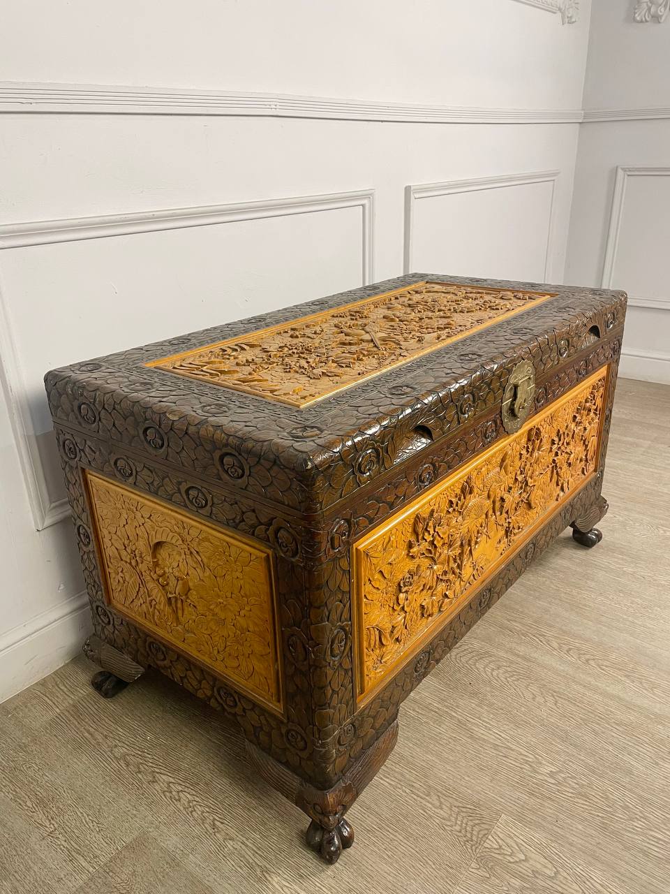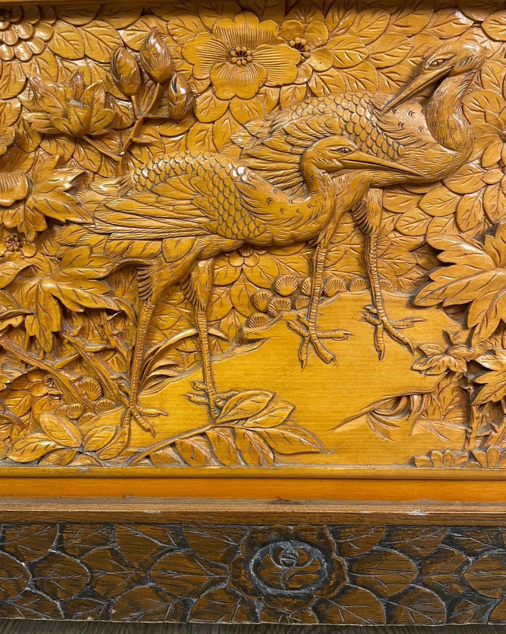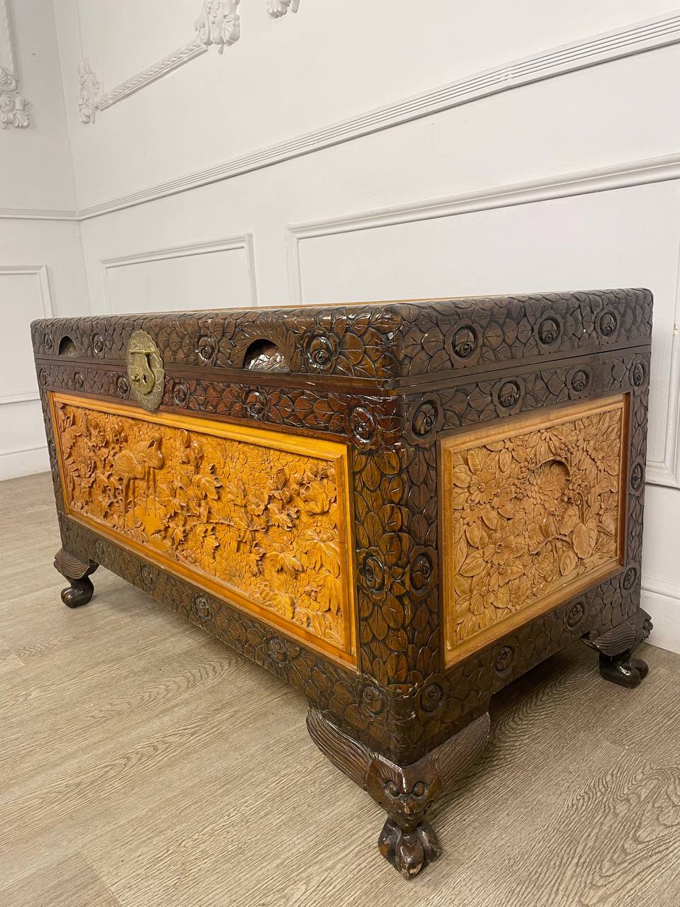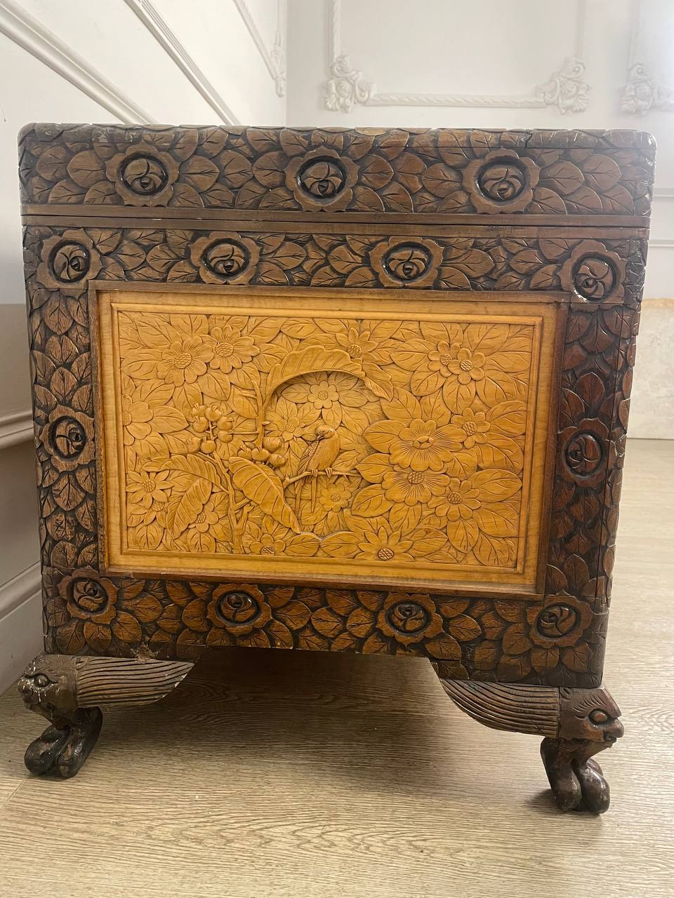 Антикварный сундук в стиле шинуазри 1970-1980х годов, Китай. Выполнен из сандалого и лимонного дерева. Украшен изумительной резьбой на тему «цветы и птицы» со всех сторон. Оригинальная латунная фурнитура. С двух сторон на крышке выемки для рук. Внутри находится сетчатая полка. Размер 104х56х61h см.