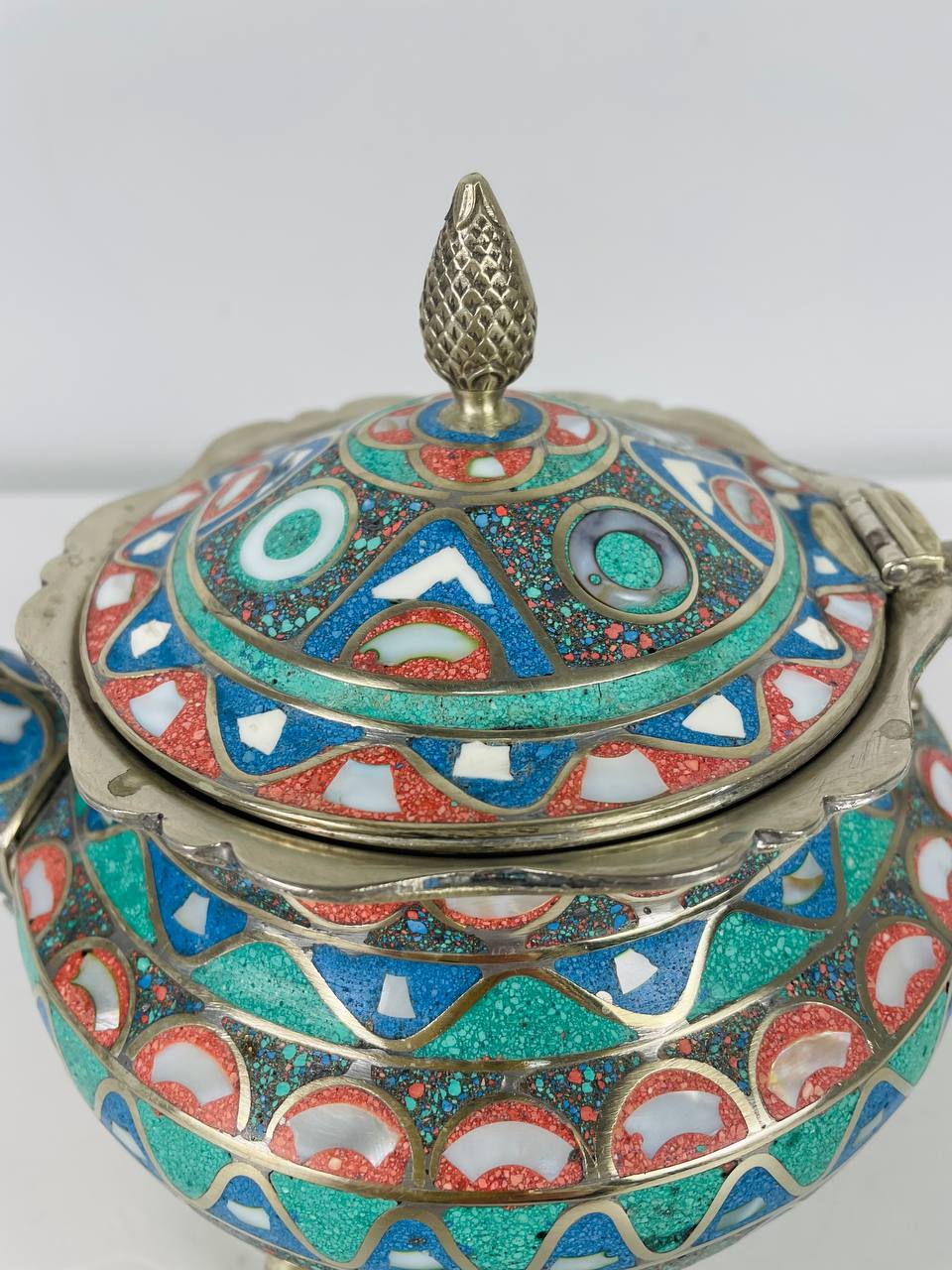 Выполнен из металла с серебрением в технике перегородчатая эмаль с натуральным перламутром.