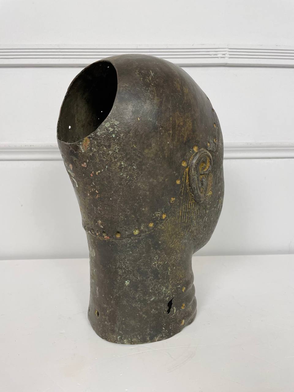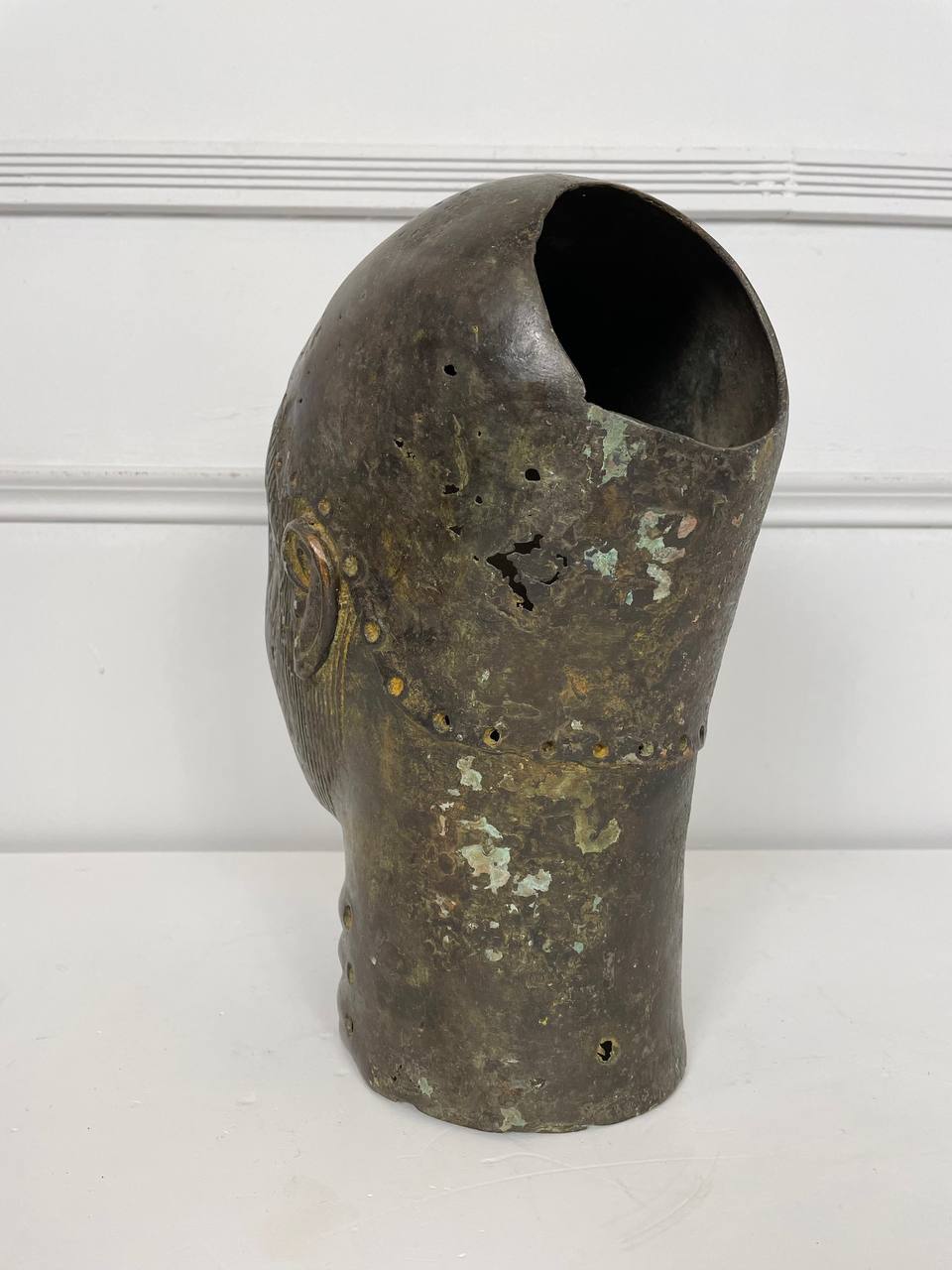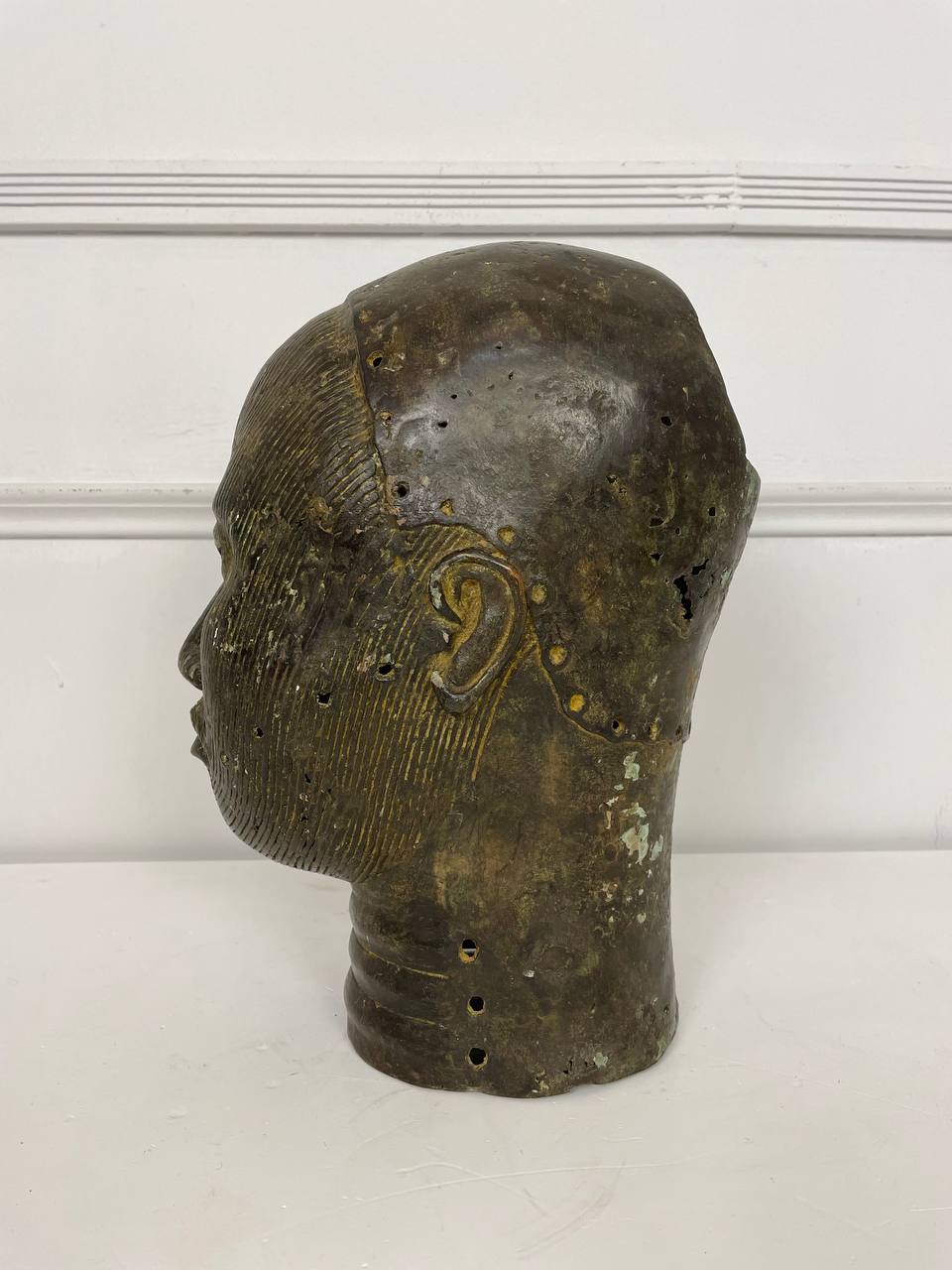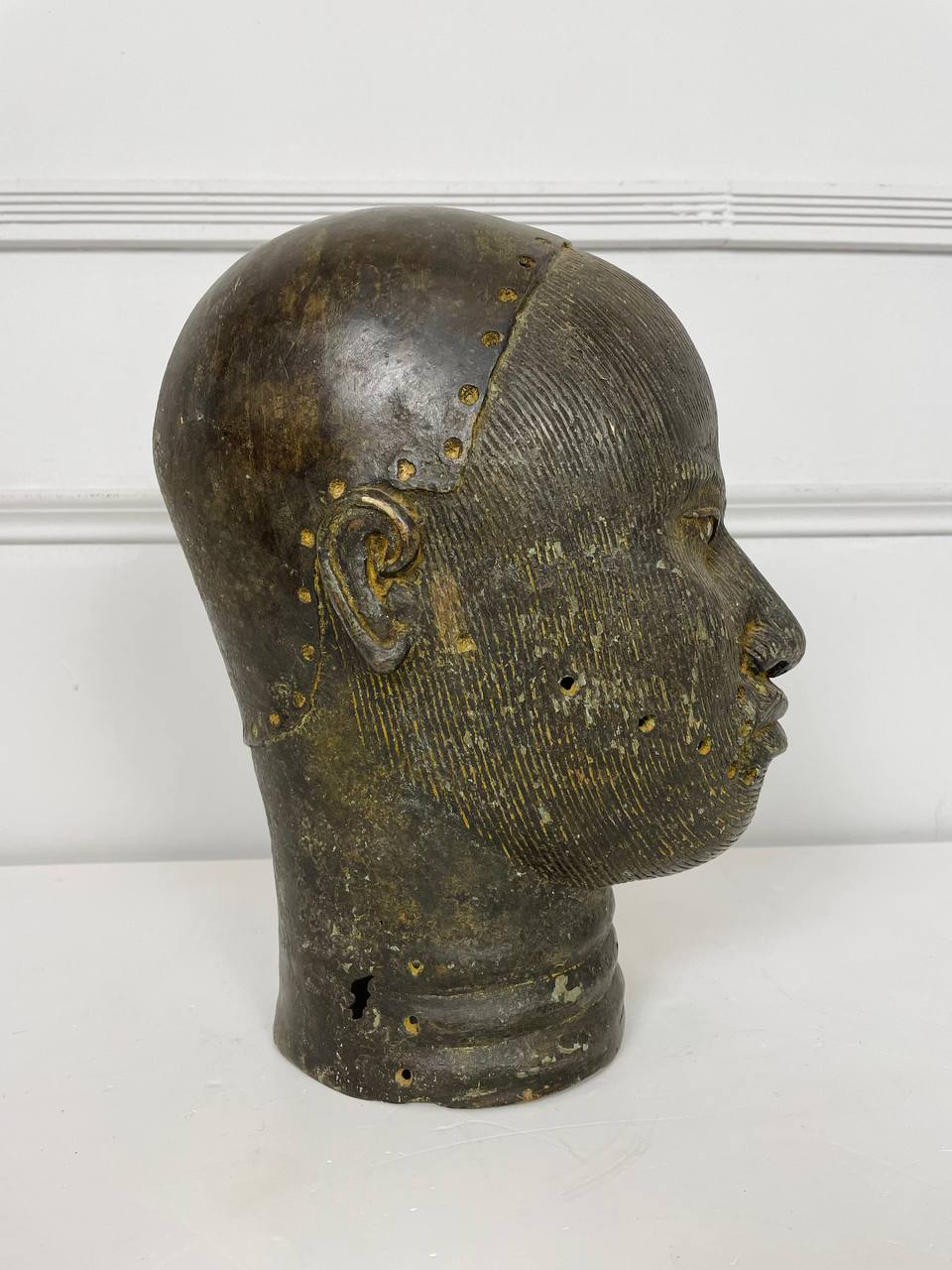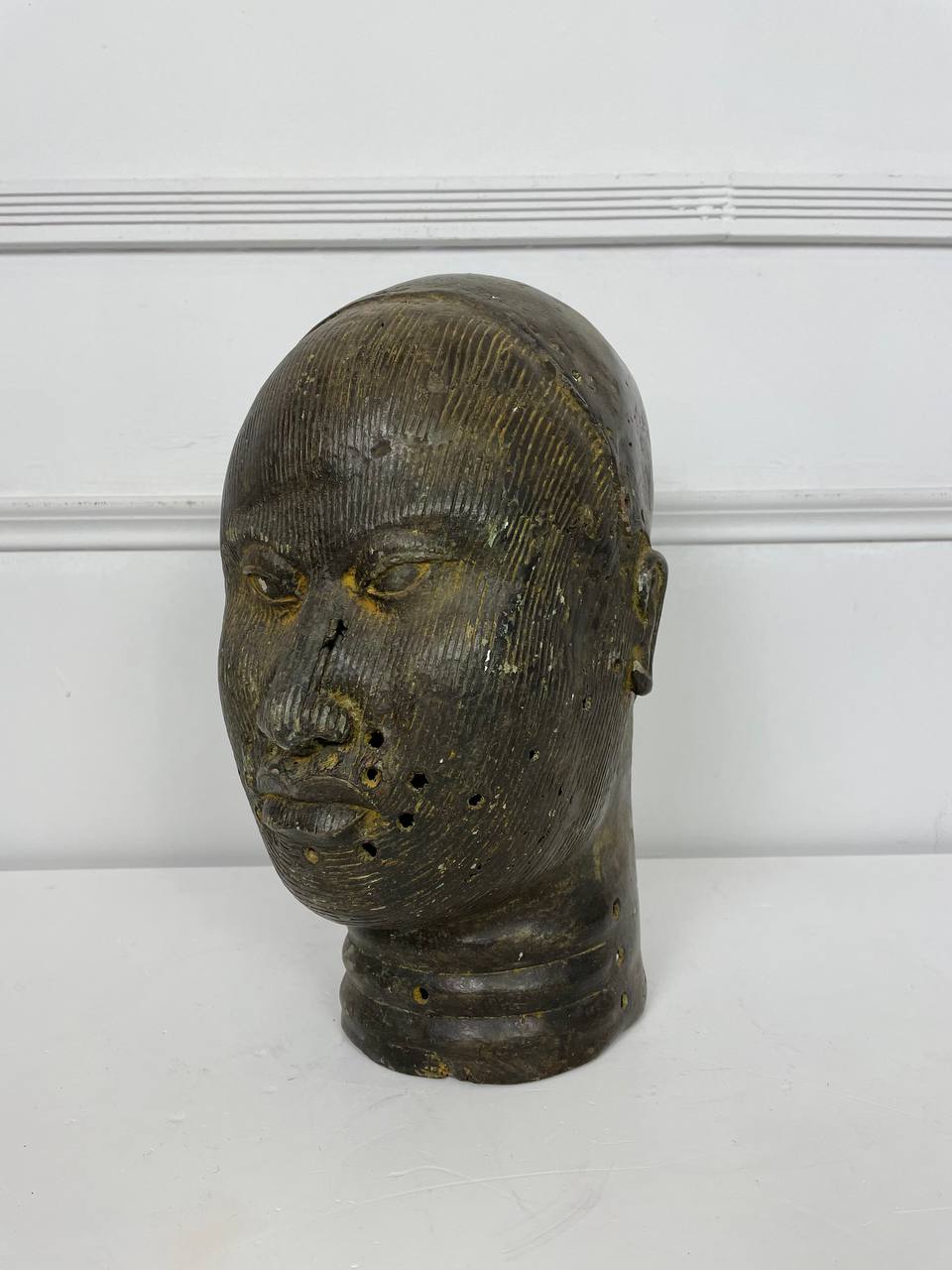Скульптурное изображение царицы, Бенин/Ифе (Нигерия), ХIX-XX век (?). Металл, литье, техника утраченного воска. Имеются небольшие отверстия вокруг губ для крепления бусин и подвесок. Высота 33 см. "Бенинская бронза" считается одним из высших достижений африканского искусства. Несмотря на закрепившиеся название, скульптура древнего Ифе и Бенина изготавливалась преимущественно из различных сплавов на основе меди. Техника литья методом утраченного воска являлась привилегией королевских мастеров, которые держали ее в строжайшей тайне. Большую группу произведений составляют "бронзовые" головы правителей и предков, выполненные в натуральную величину с большой долей реалистичности. Государства Ифе и Бенин занимали территорию современной Нигерии до 1890-х годов. Древние традиции мастеров-литейщиков сохранялись здесь на протяжение всего ХХ века.