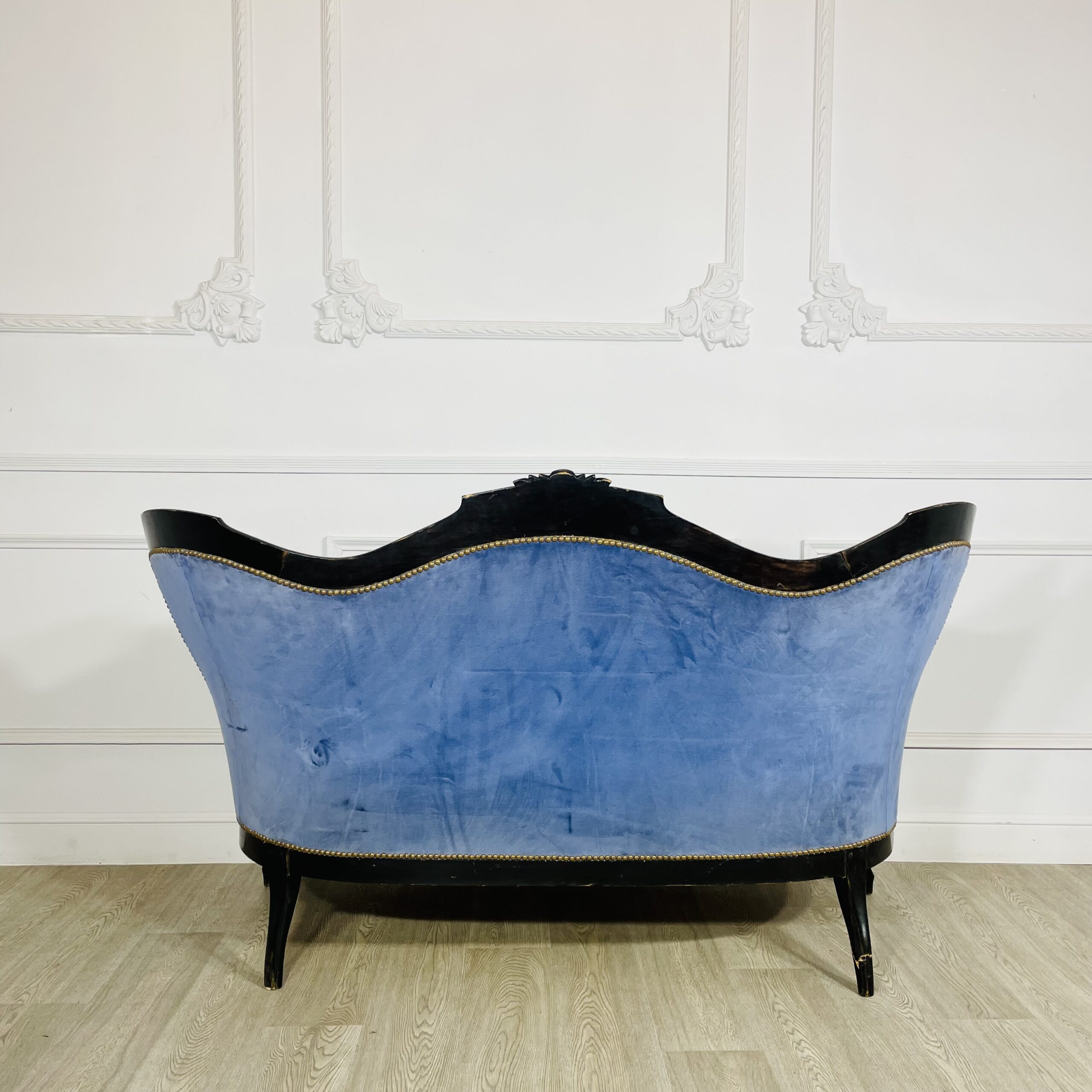 Низкий антикварный диван ярко синего цвета середины XX века, Франция. Выполнен из массива дерева и ярко синего велюра. Размер 155х80х96h см.