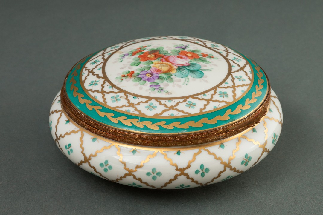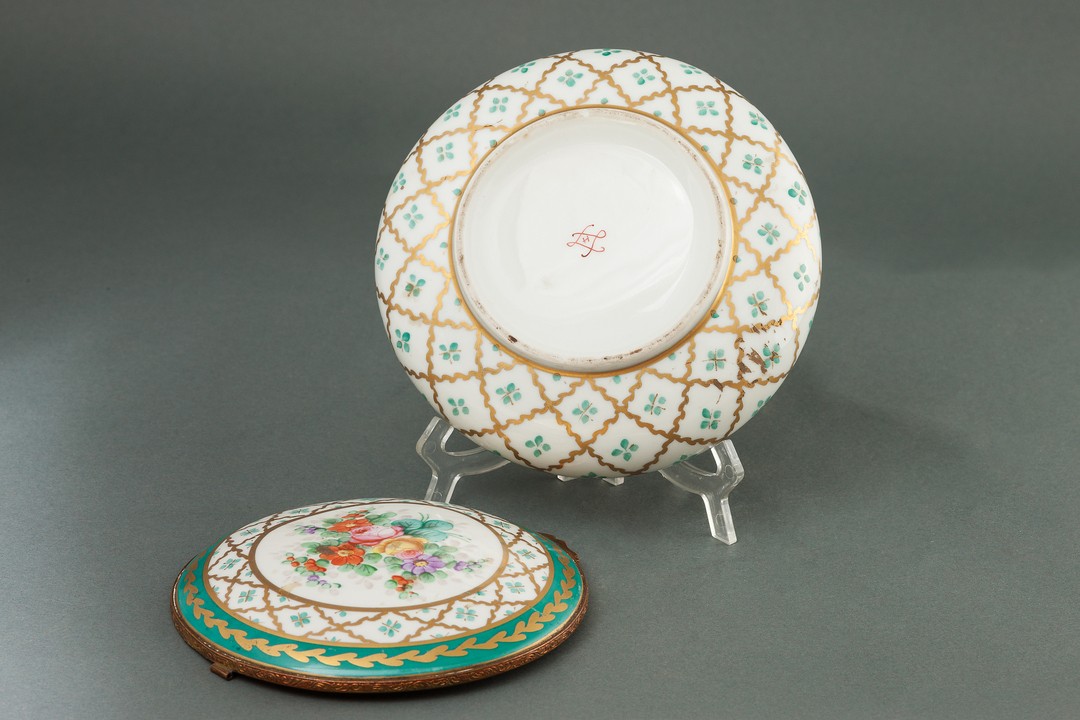 Антикварная шкатулка для украшений в стиле Sevres, конец XIX века, Франция. Фарфор, ручная роспись. Диаметр 17 см Высота 8 см.