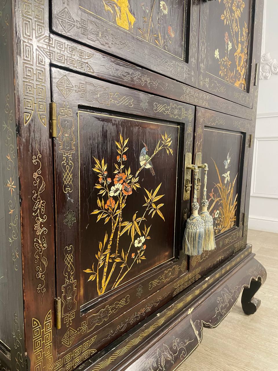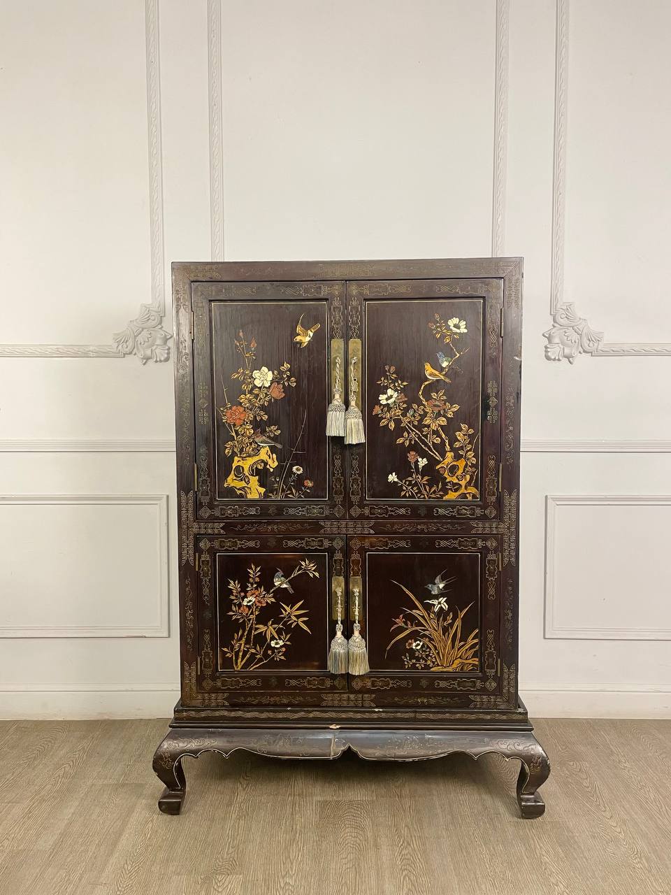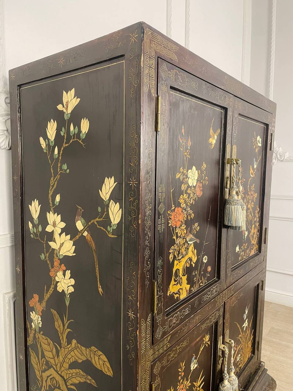 Антикварный шкаф в стиле Шинуазри на подставке первой половины XX века, Китай. Выполнен из массива дерева, тонирован в коричневый цвет с ручной росписью на тему «цветы и птицы». В нижней части полка, верхняя часть предназначена для ТВ. Оригинальная латунная фурнитура. Размер 105х58х149h см.