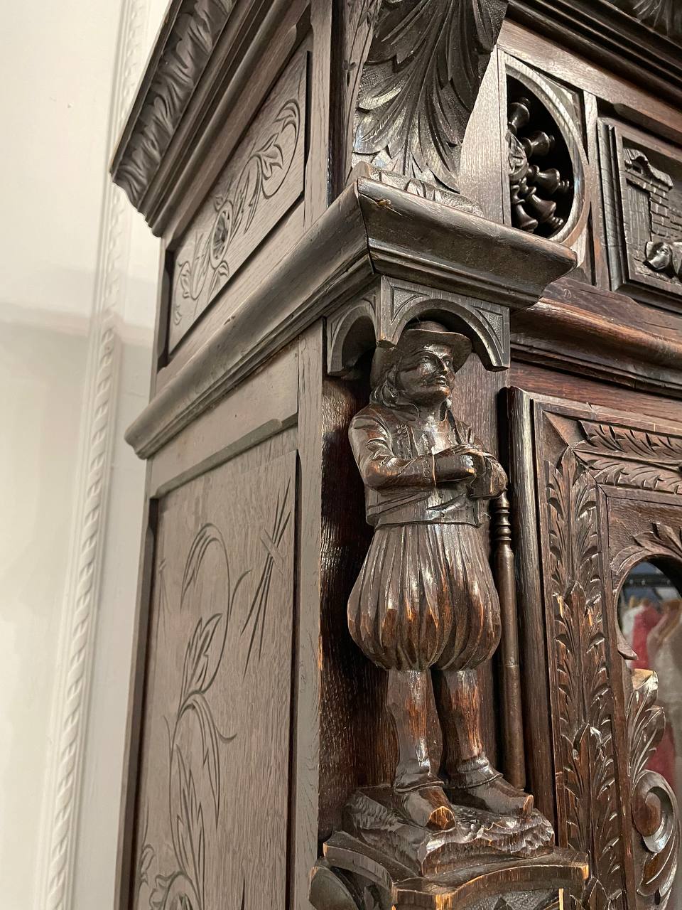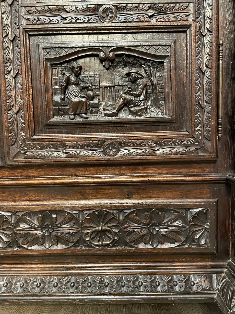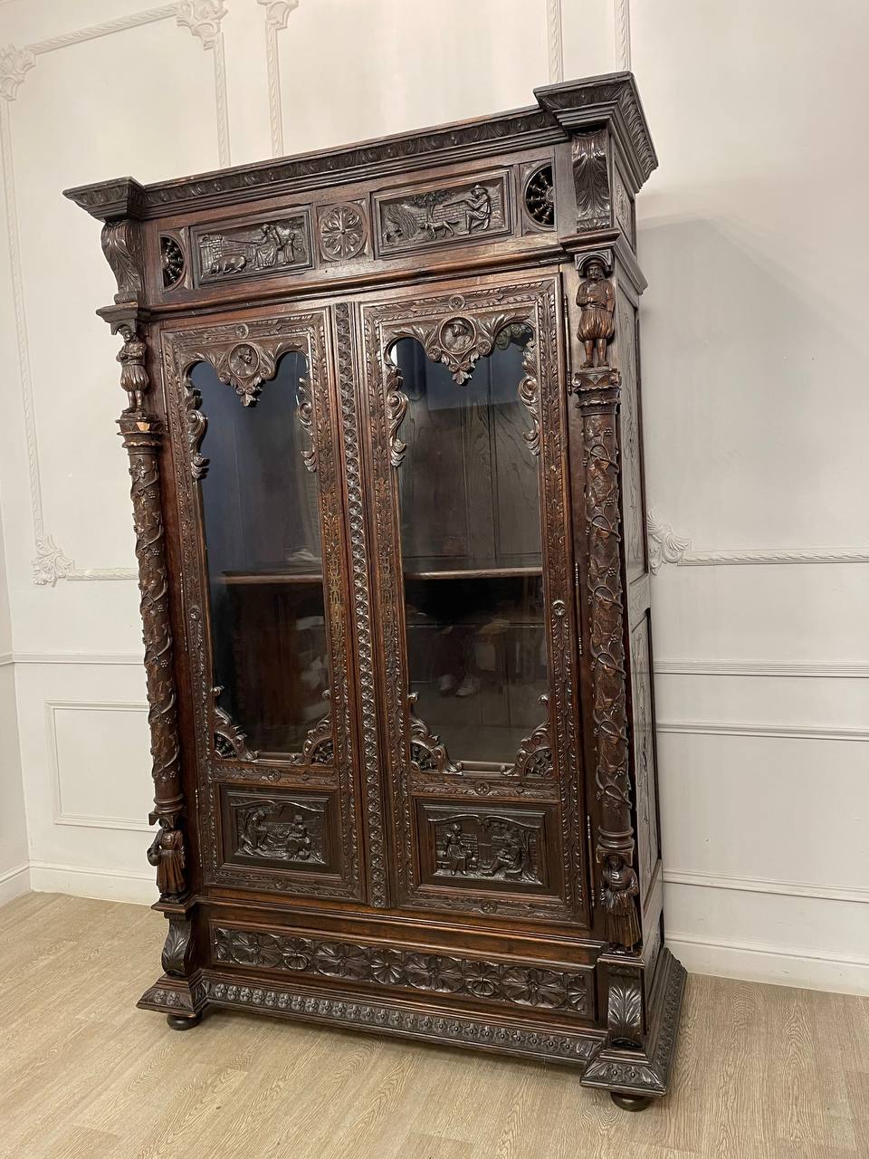 Книжный шкаф в Бретонском стиле конца XIX века, Франция. Выполнен из массива дуба. Богатая резьба в стиле северной части Франции. Внутри две оригинальные полки. 151х58х239h см.