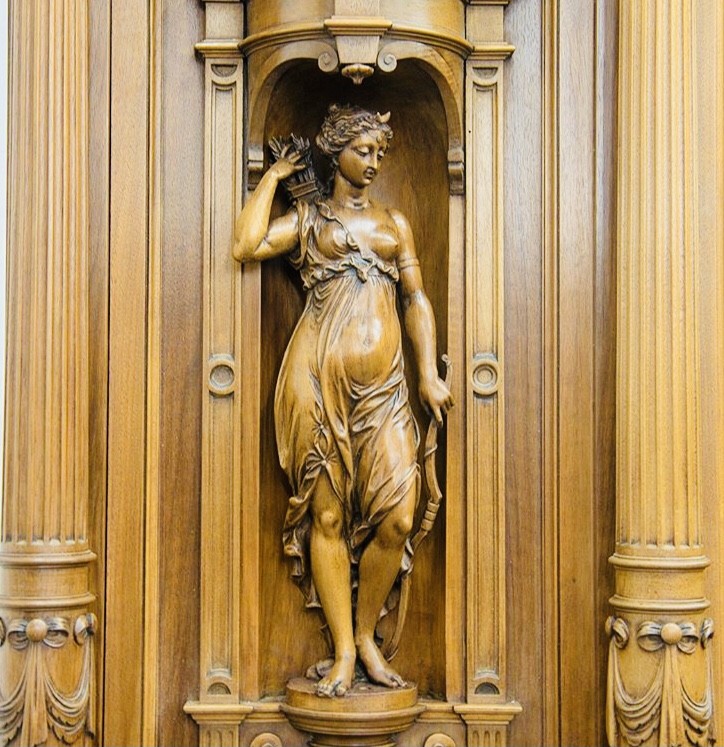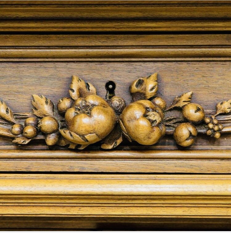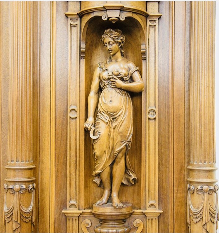 Музейного уровня шкаф-поставец уникально крупного масштаба с зеркалом XIX века, Франция. Выполнен из ореха, высокохудожественная резьба. Все элементы выполнены вручную. Был изготовлен по индивидуальному заказу для одного из замков Луары. Оригинальное зеркало с фацетом. Размер 245х62х345h см.