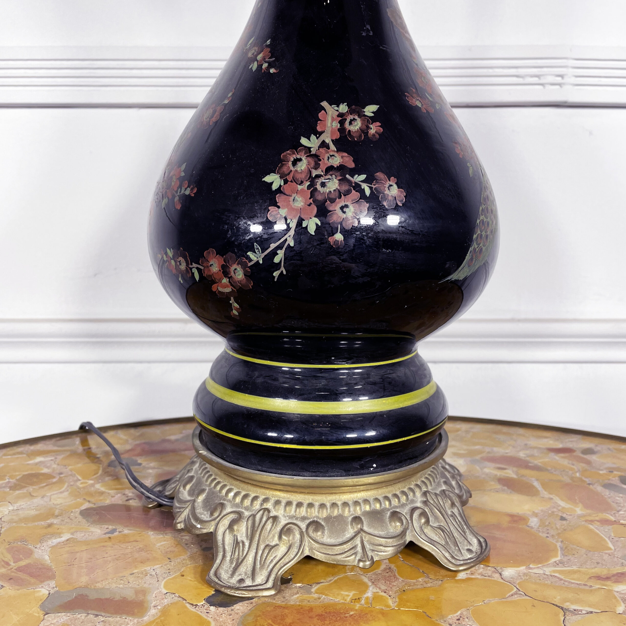 Лампы парные антикварные, XIX век, Франция. Когда-то были керосиновыми, позднее их переделали в электрические. На иссиня-черном фарфоре изображены павлины, ручная роспись В рабочем состоянии. Высота 84 см. Диаметр основания 20 см.