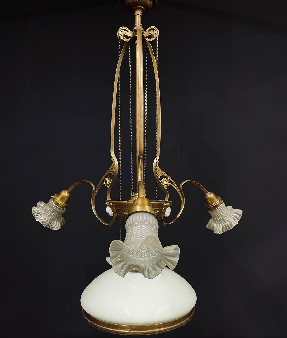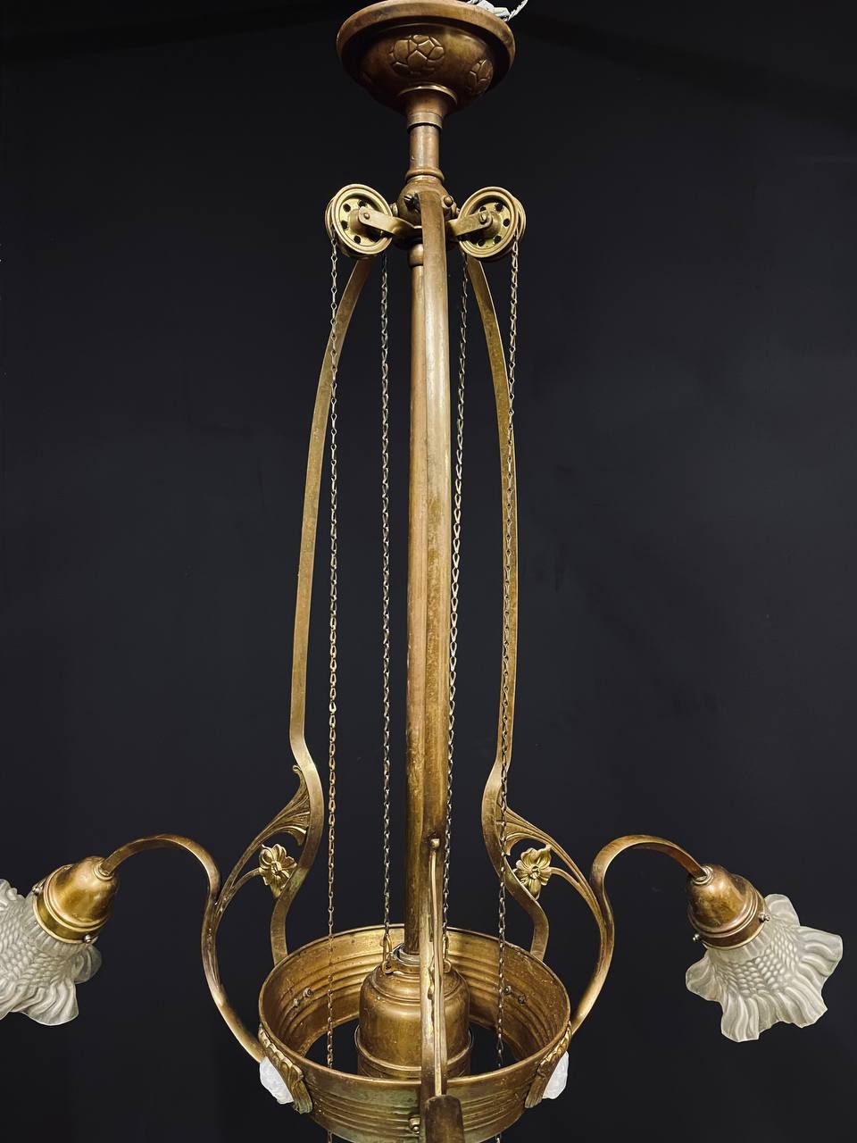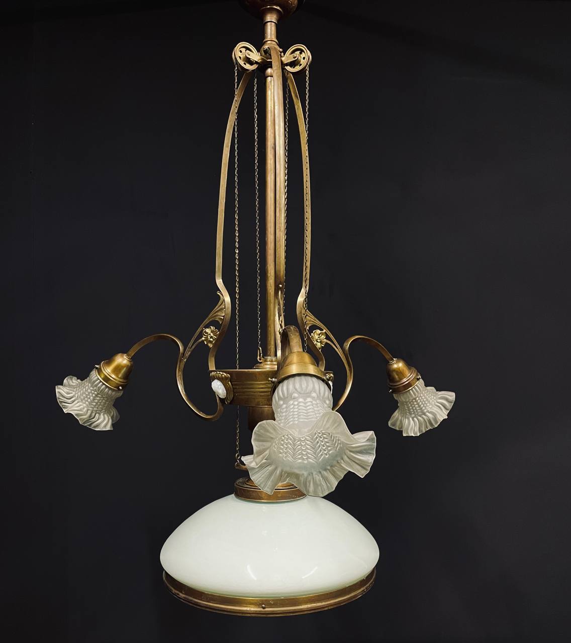 Люстра Ар-нуво начала XX века, Россия. Выполнена из латуни. Оригинальный центральный плафон. Механизм для регулировки высоты. Д 90 см. В 100-138h см.