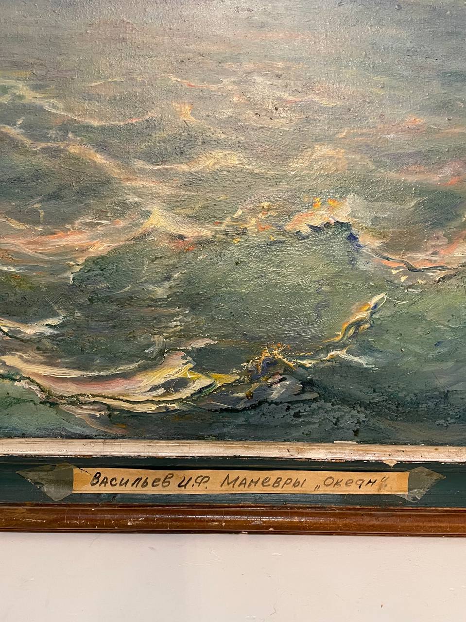 «Маневры Флота» И.Ф. Васильев, 1981 год, Москва. Оригинальный багет с подвесами. Есть небольшой разрыв (возможно отреставрировать в нашей реставрационной мастерской). Подпись правый нижний угол. Размер 106х73 см. Васильев Илья Федотович 1925 года рождения. Ветеран Вооруженных Сил СССР. Народная Изостудия ЦДСА им. Фрунзе.