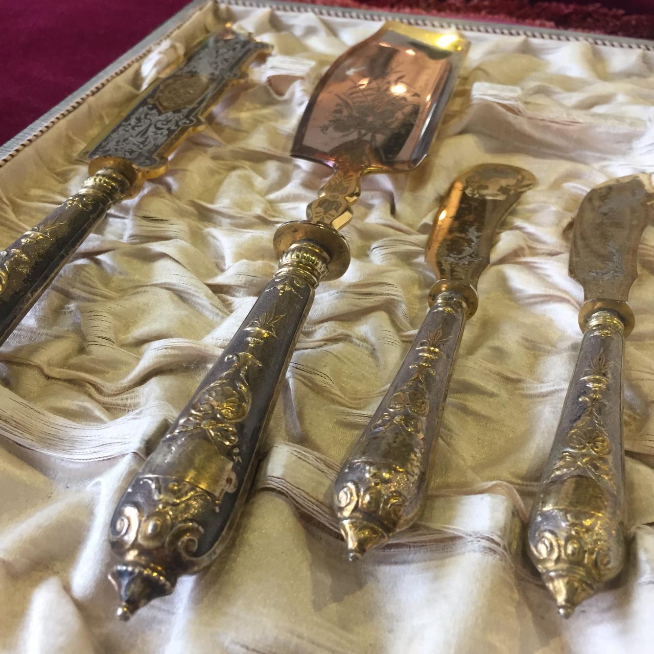 Набор десертных ножей, конец XIX века, Европа, серебрение, позолота, набор продаётся в родной коробке. Великолепное состояние! Размеры: большая лопатка 31 см, широкий нож 26, маленькие ножи по 19 см. Коробка 37*25 см.