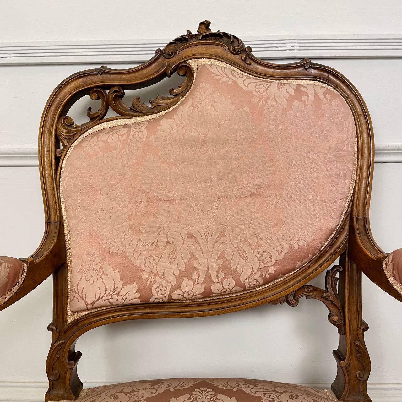 Пара антикварных кресел в стиле Louis XV рубежа XIX-XX вв, Франция. Выполнены из массива ореха. Изящная резьба ручной работы. Ткань под перетяжку. Размер 65х65х101h см