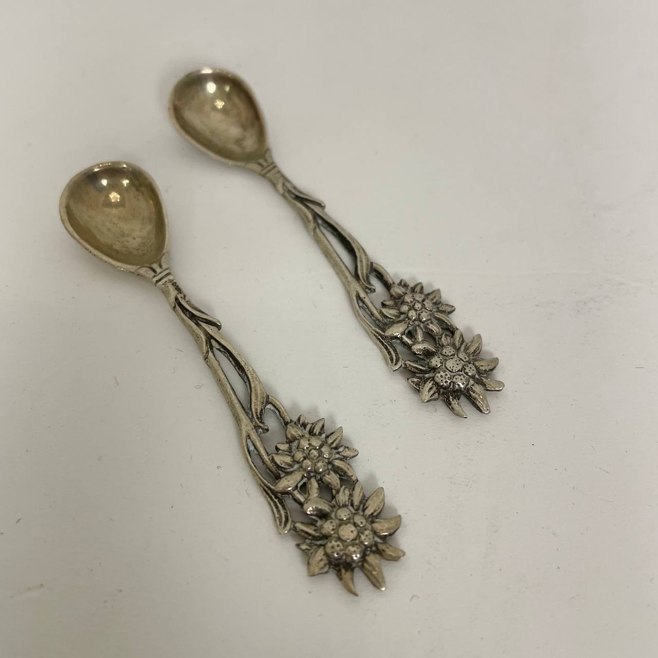 Пара серебряных солонок с ложечками начала XX века, Франция. Вставки выполнены из синего стекла. Размер 6х4х3,5h см