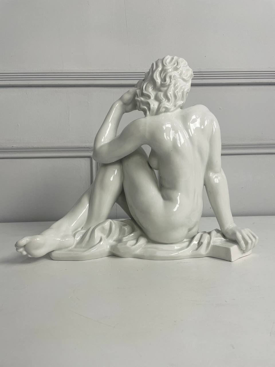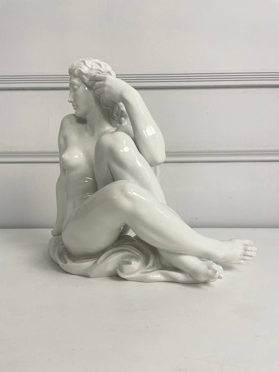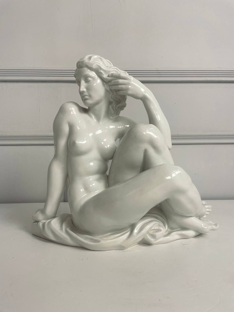 Парные фарфоровые скульптуры девушек «Смотрящая» и «Мечтающая» скульптора Robert Ullmann (1903-1966), легендарной мануфактуры Meissen, Германия. Работы 1939-1940 года. В тесте скрещенные мечи, Weiss, номер мод. Q 238-239. Robert Ullmann Размер 37х24х32h см. Цена за пару.
