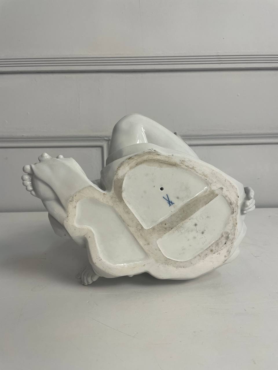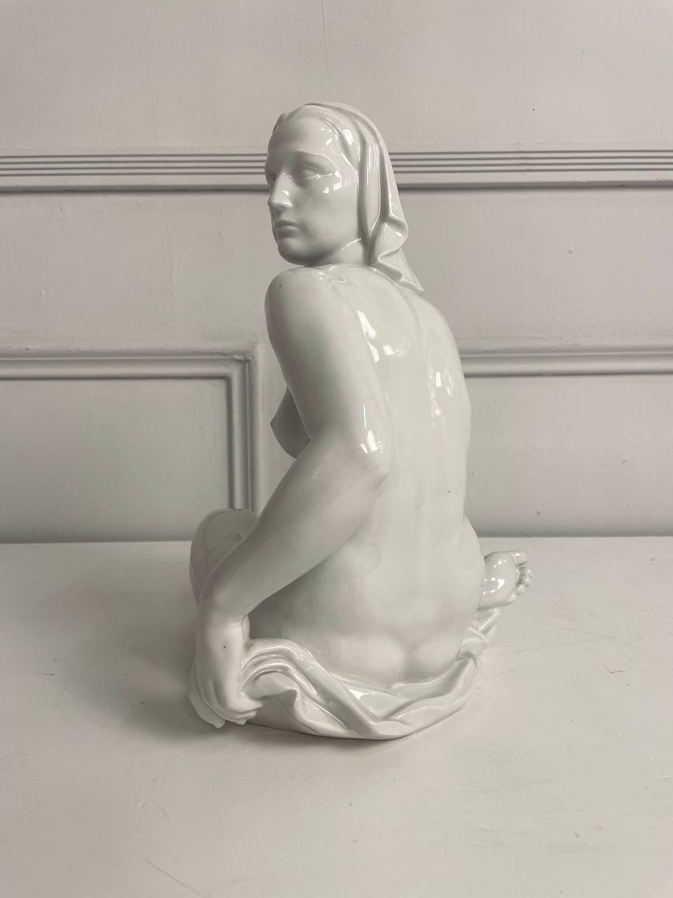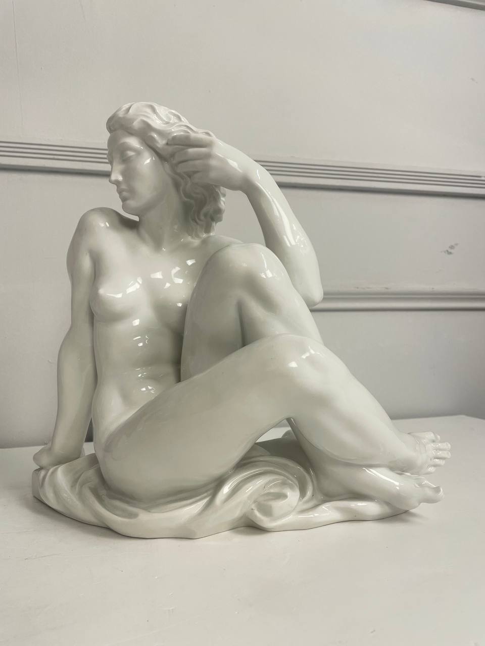 Парные фарфоровые скульптуры девушек «Смотрящая» и «Мечтающая» скульптора Robert Ullmann (1903-1966), легендарной мануфактуры Meissen, Германия. Работы 1939-1940 года. В тесте скрещенные мечи, Weiss, номер мод. Q 238-239. Robert Ullmann Размер 37х24х32h см. Цена за пару.