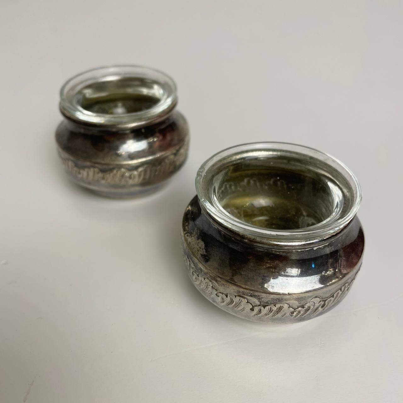 Парные солонки начала XX века, Франция. Серебрение, стекло. Маркировка. Диаметр 5 см Высота 4 см Цена за пару.