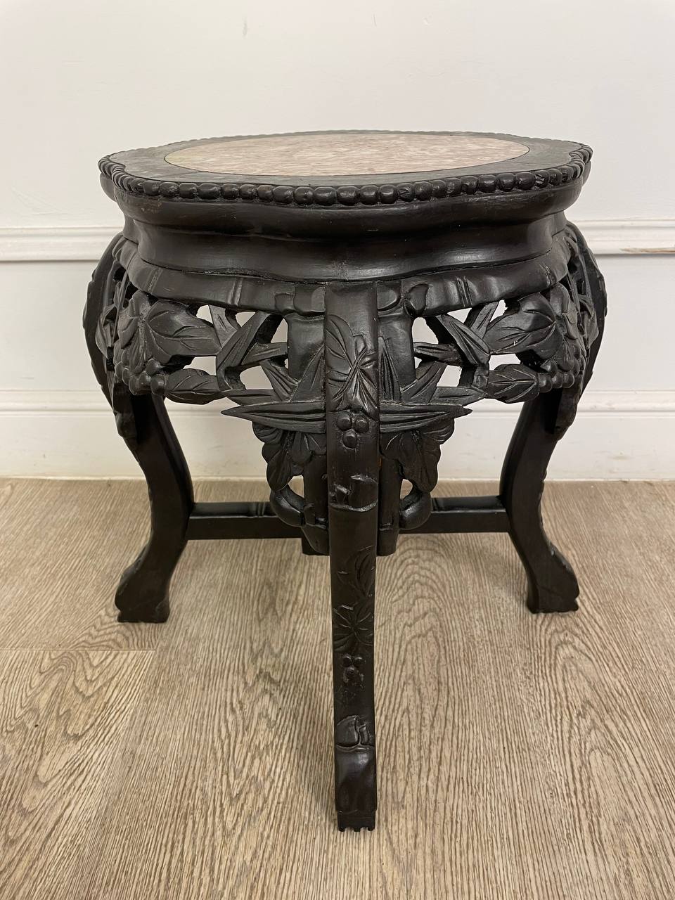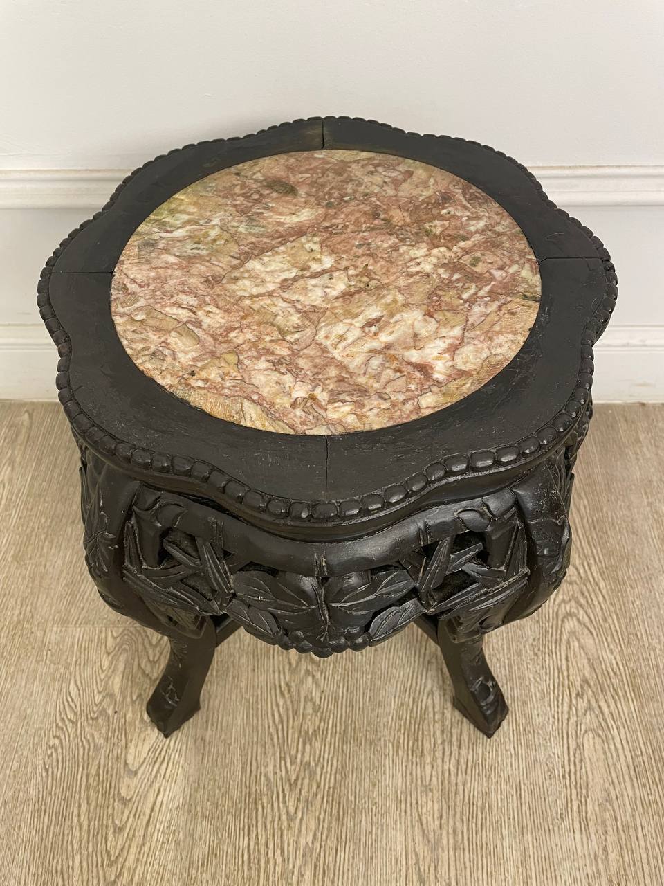 Подставка начала XX века, Китай. Фигурная столешница из оригинального мрамора. Богатая резьба из массива дерева. Д 38 см В 44 см