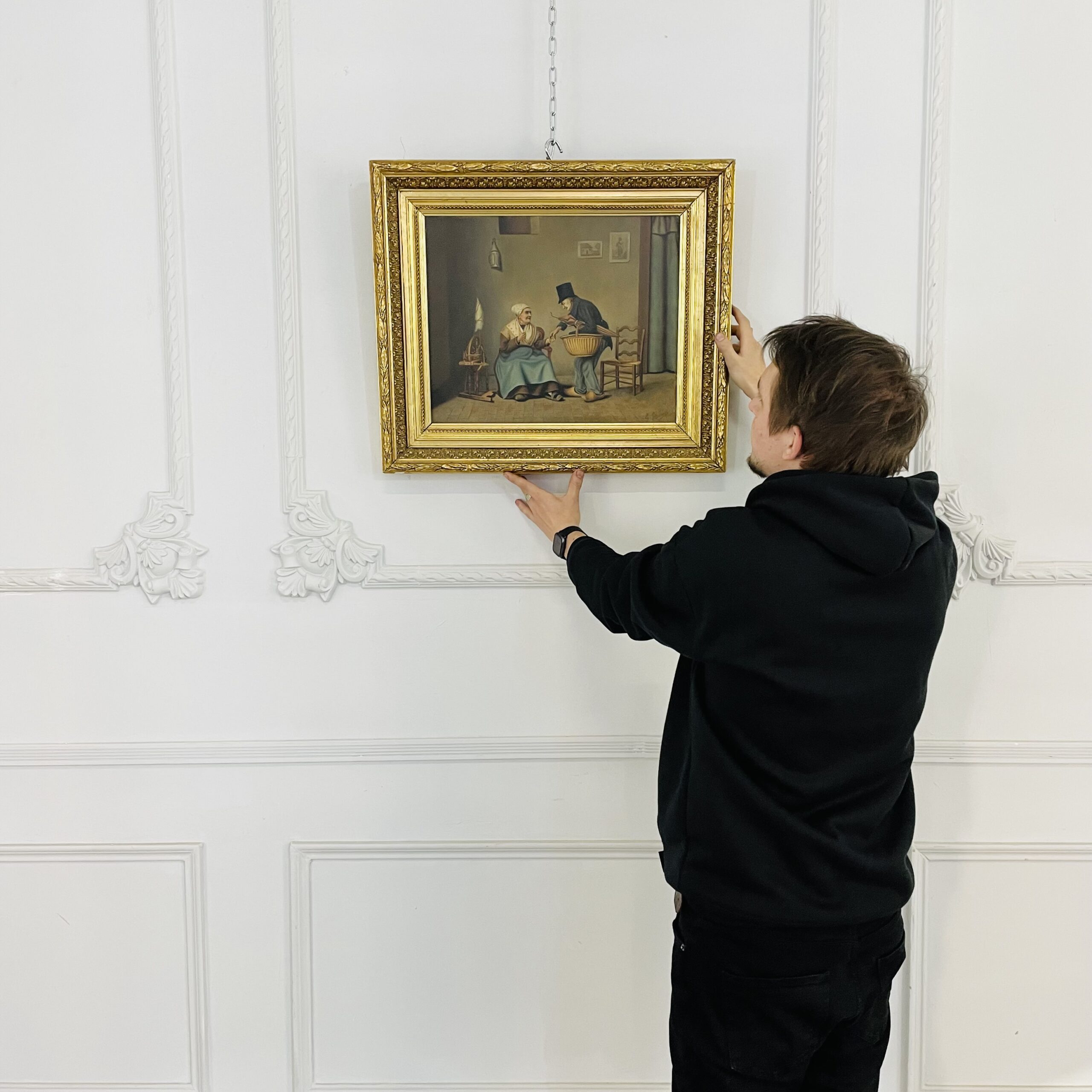 Очень милая, интерьерная работа первой половины XX века из Европы. Холст, масло. Стоит подпись автора. Оригинальный багет. Размер 62х54 см.