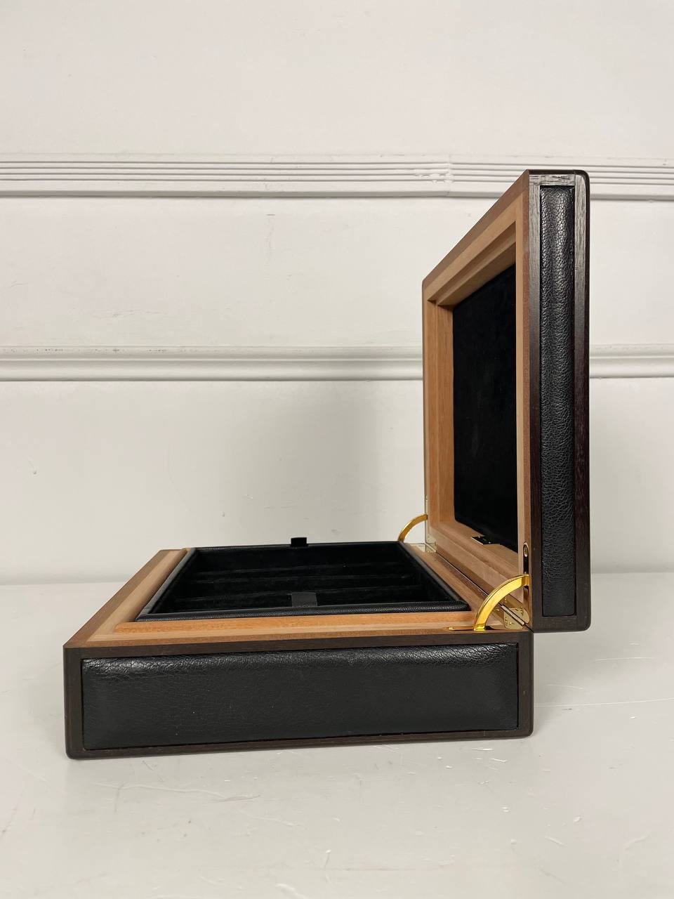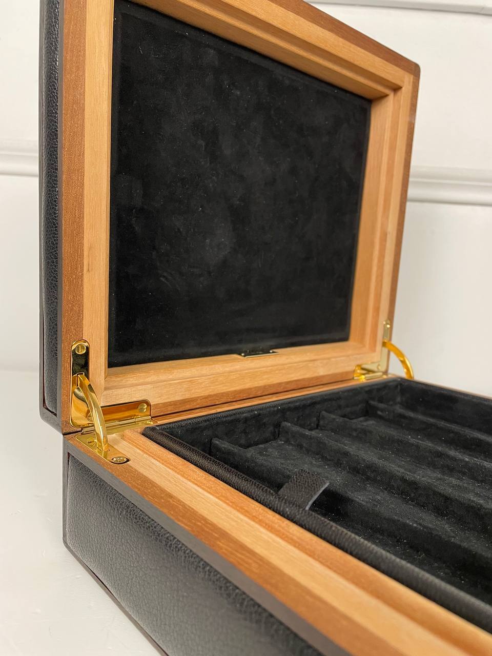 Выполнен из натуральной кожи, сандалового дерева и бархата.