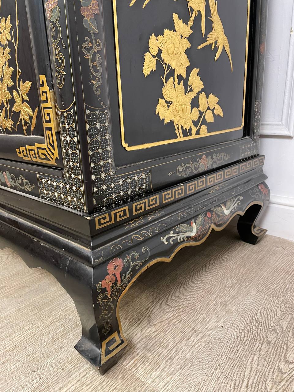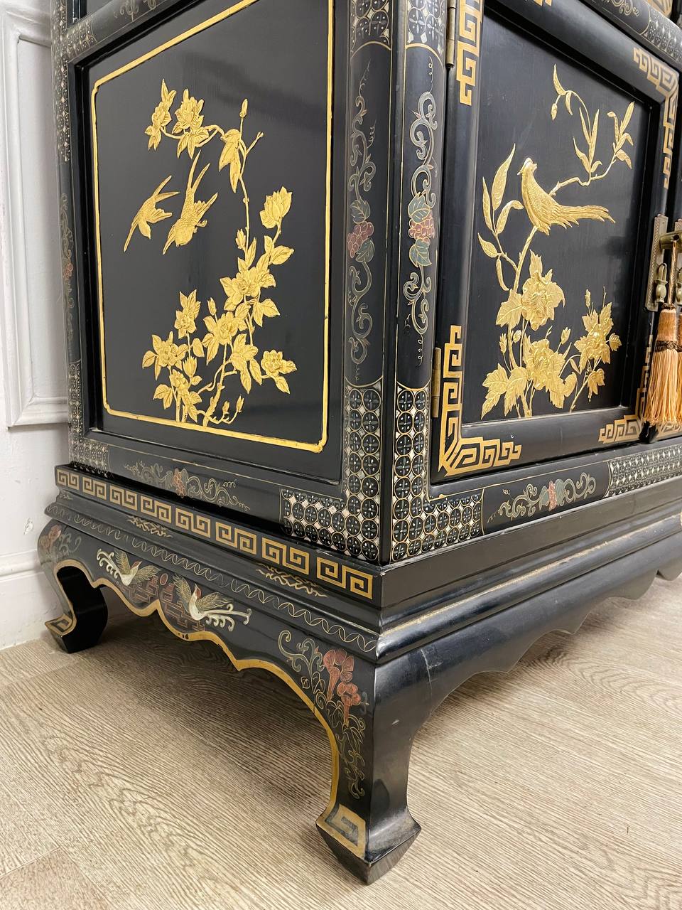 Шкаф в стиле Шинуазри середины XX века, Китай. Предназначался под TV. Ручная роспись. Оригинальная фурнитура из латуни. Размер 97х59х150h см.