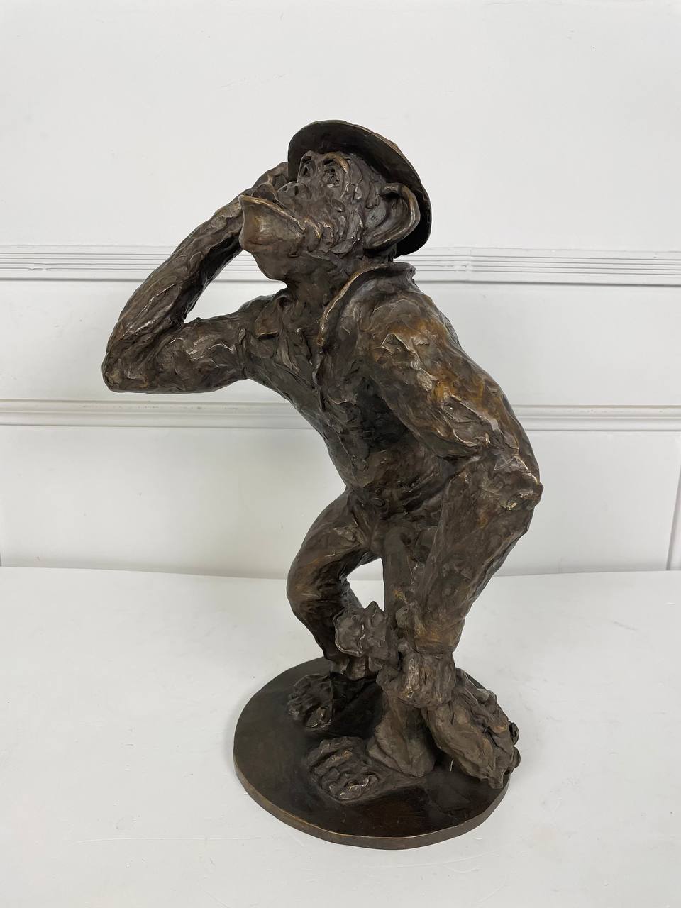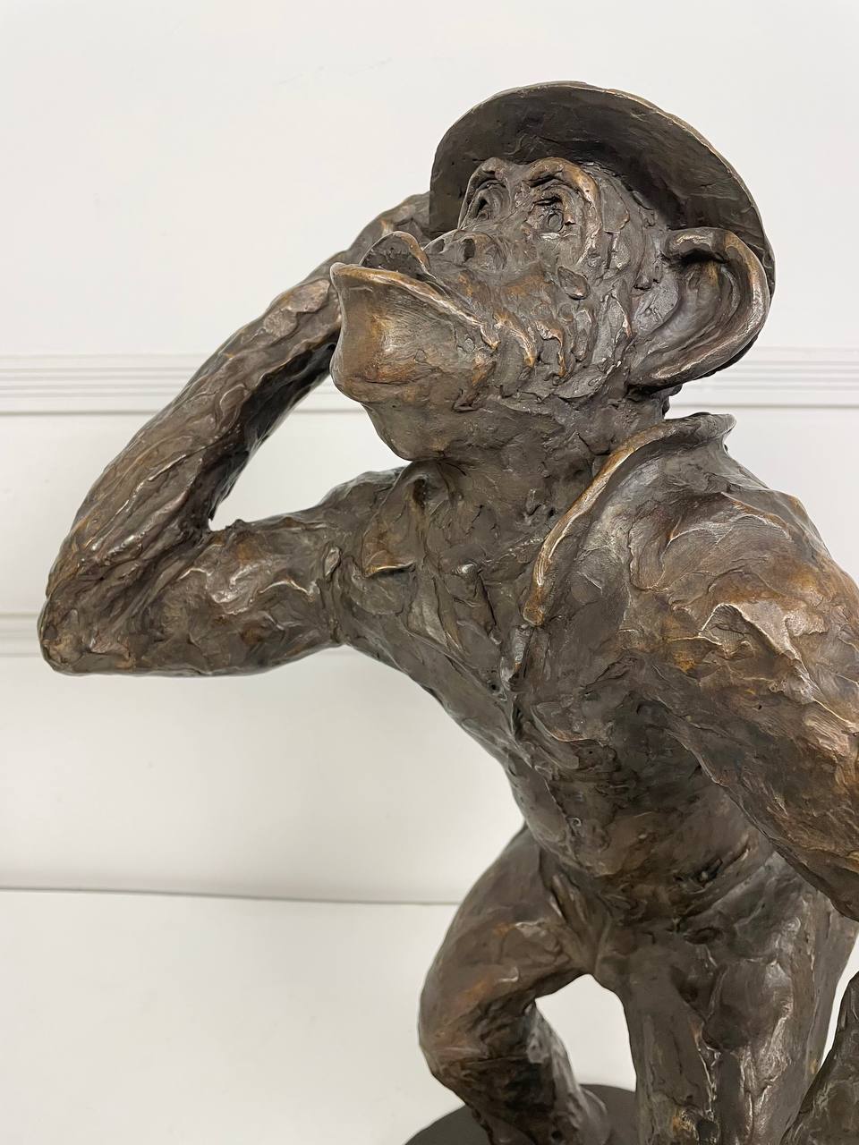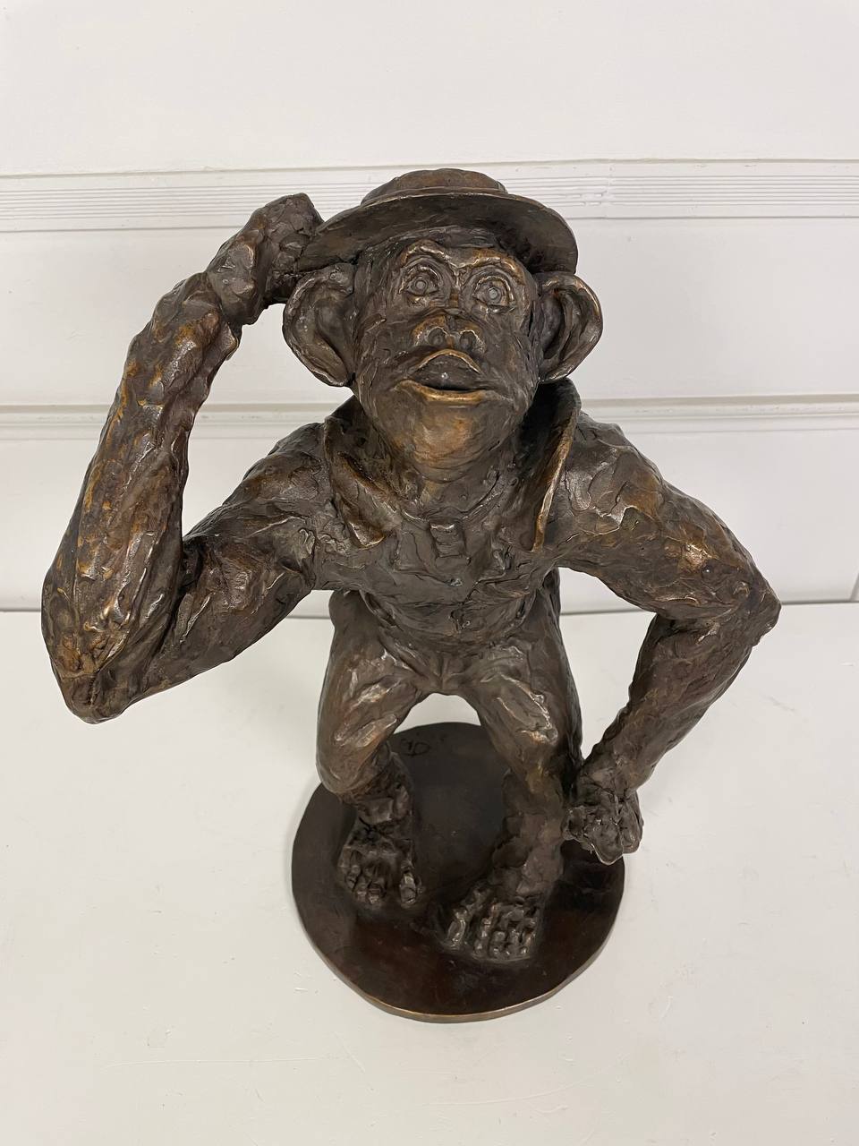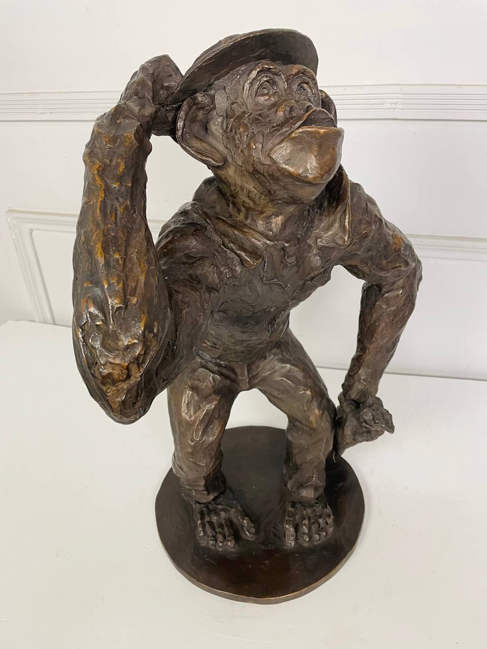 Авторская скульптура обезьянки, в исполнении Павлова Юрия Викторовича. Художественное литье, бронза, патина. Россия, 2015 г. Павлов Ю.В. - скульптор известный лишь небольшому кругу ценителей искусства. В основном трудился с изделиями под заказ, из-за чего большинство его работ производились в единственном экземпляре. Несколько творений скульптора выставлены в Центральном Парке Культуры. Размер 38х32х54h см.
