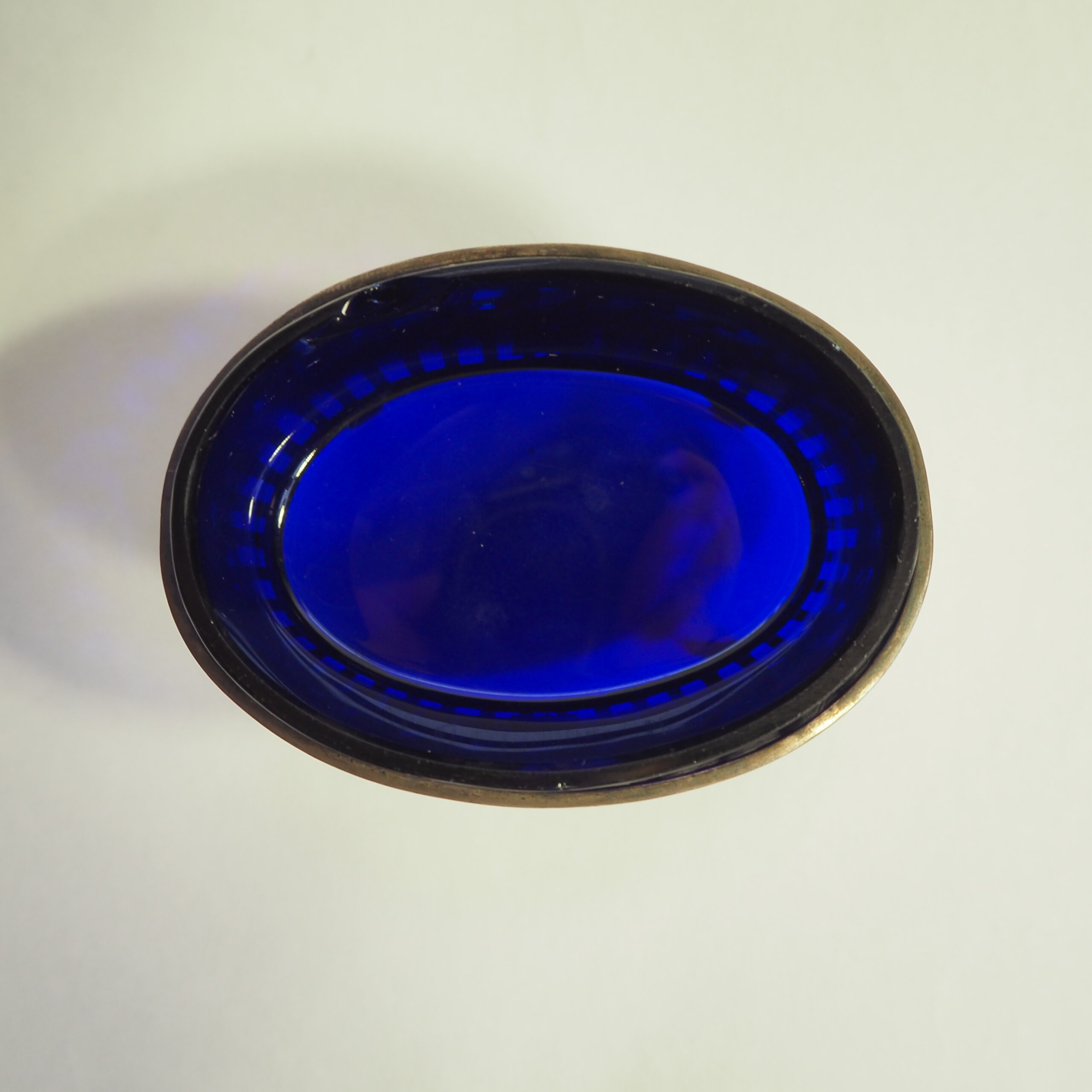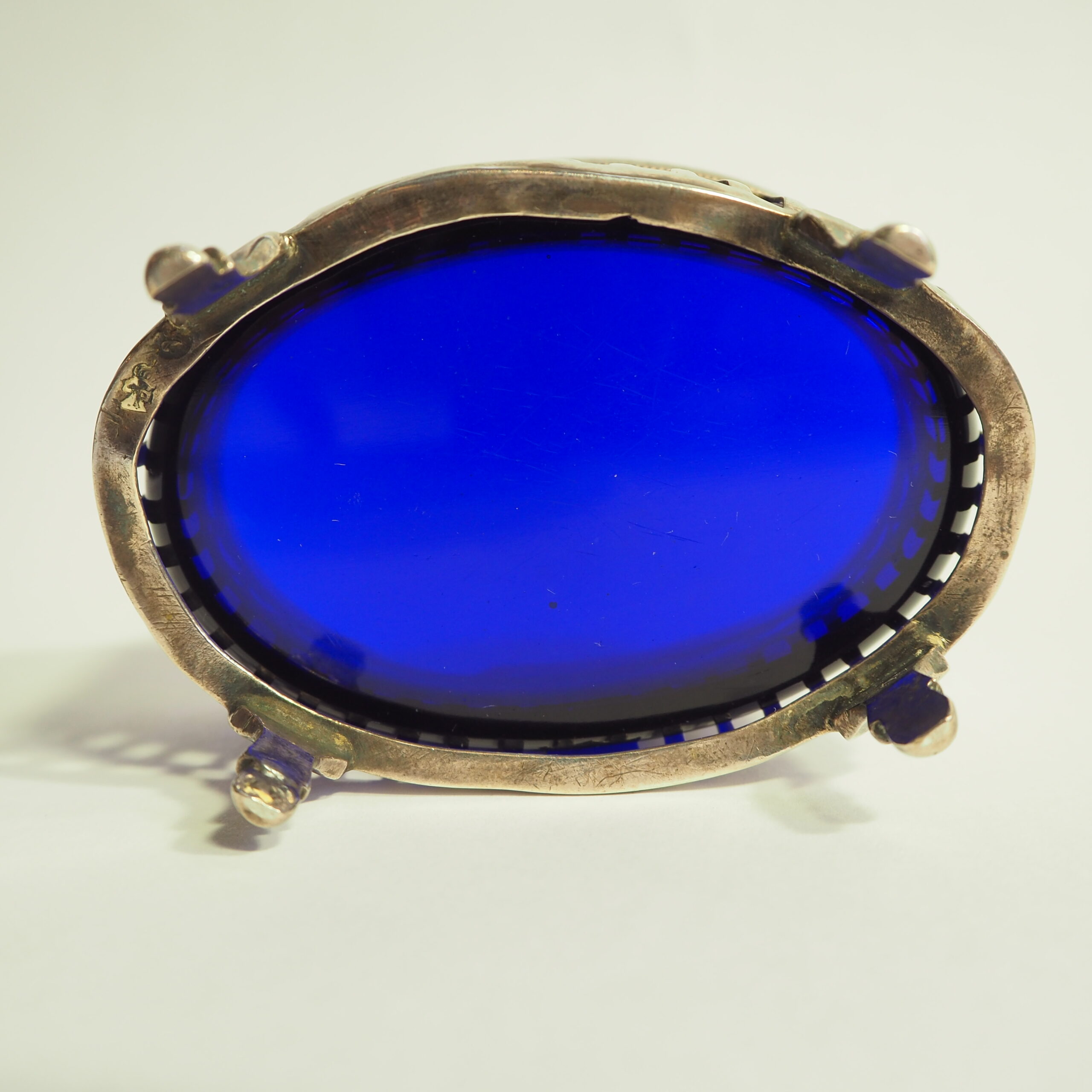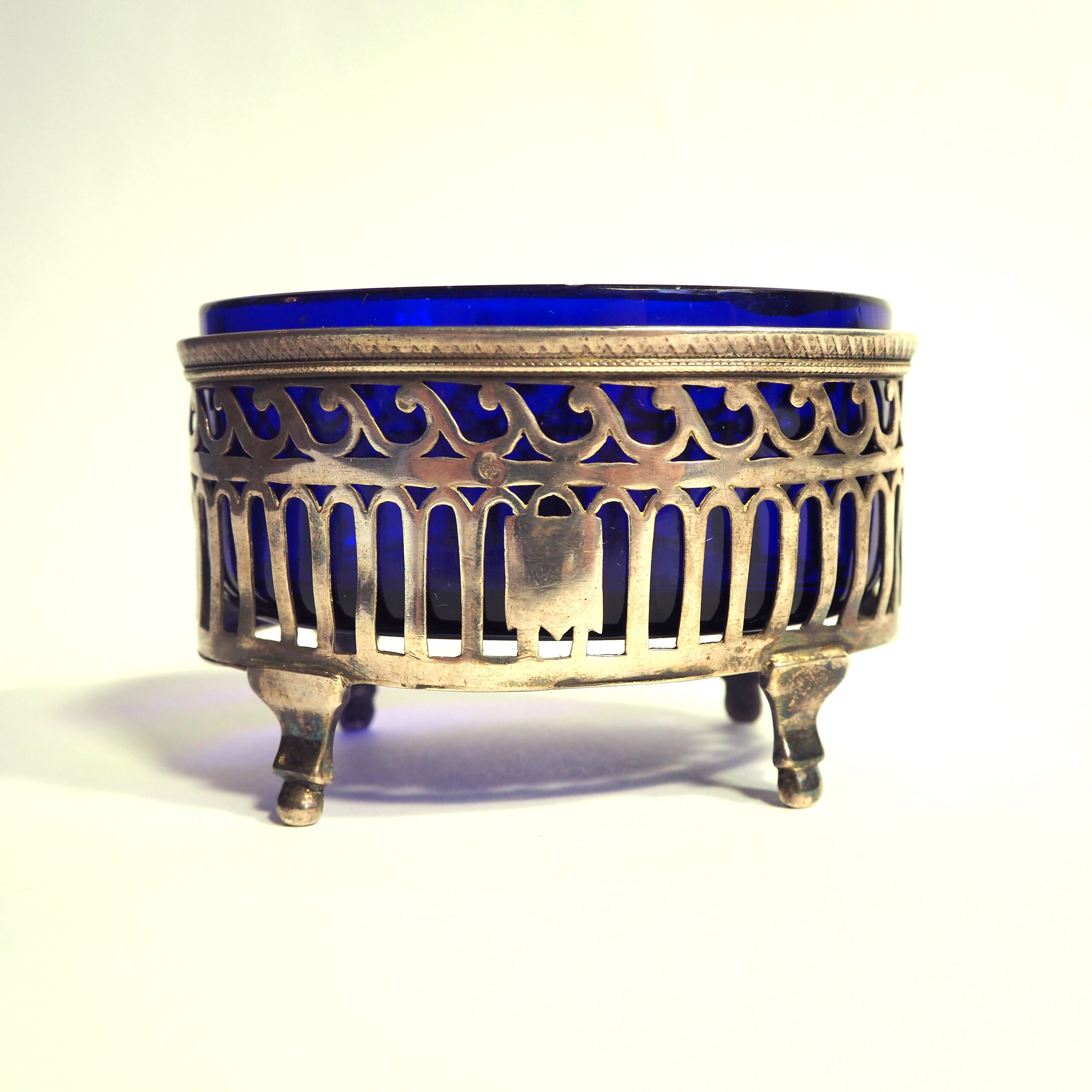 Солонка антикварная серебряная синего стекла конца XIX века.