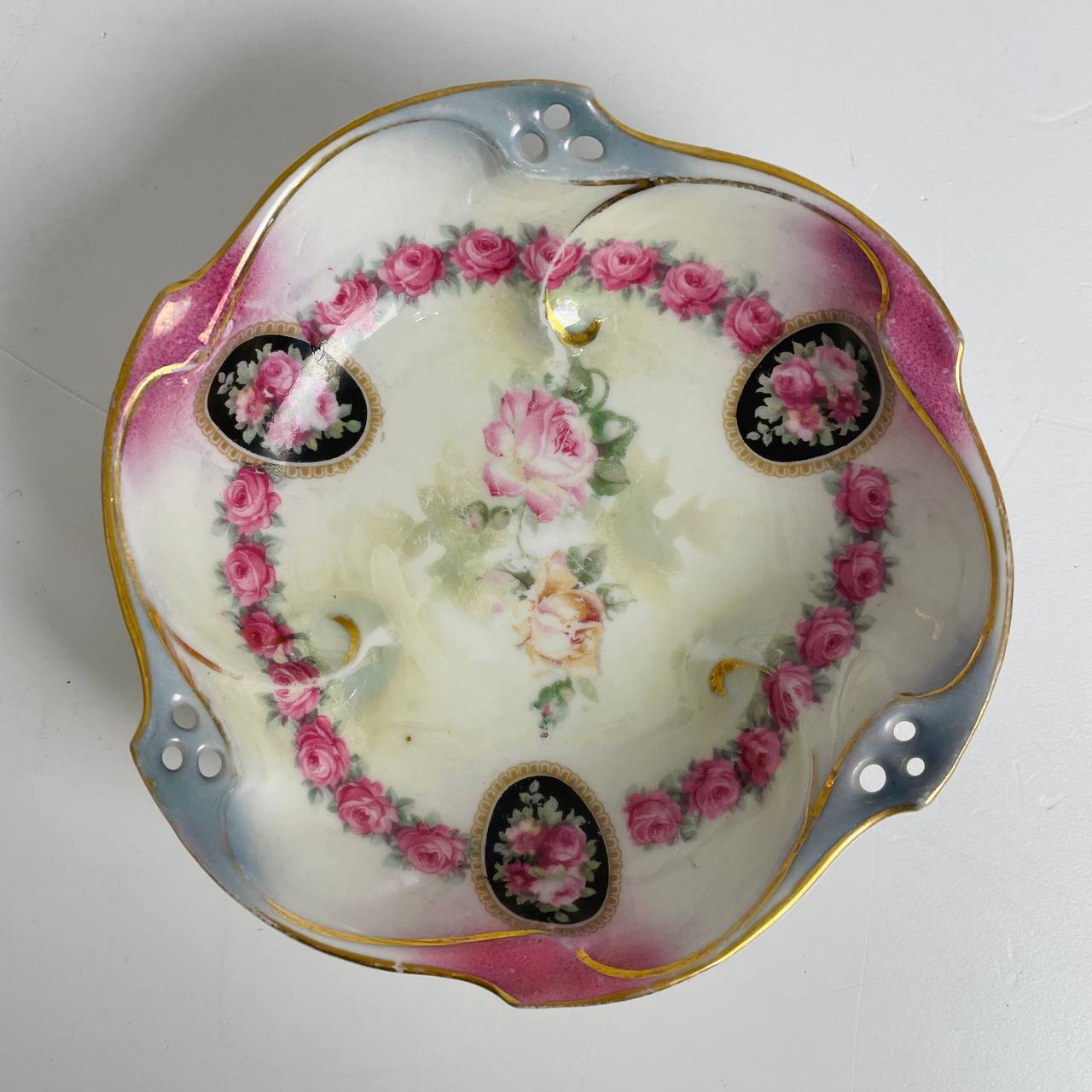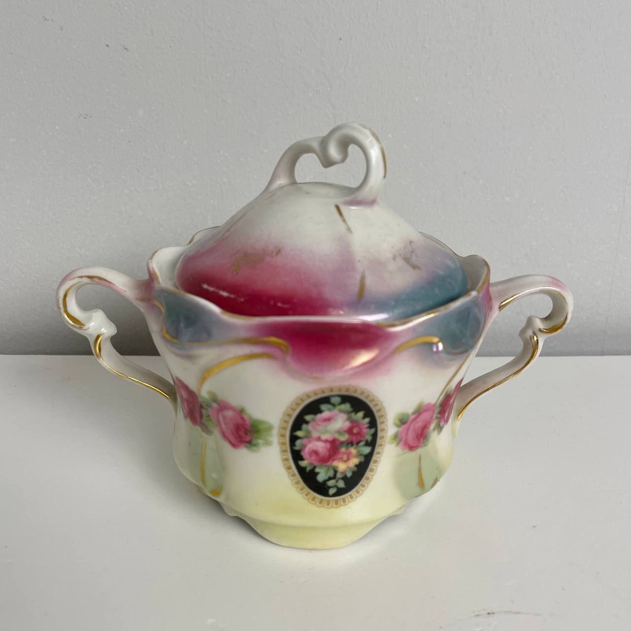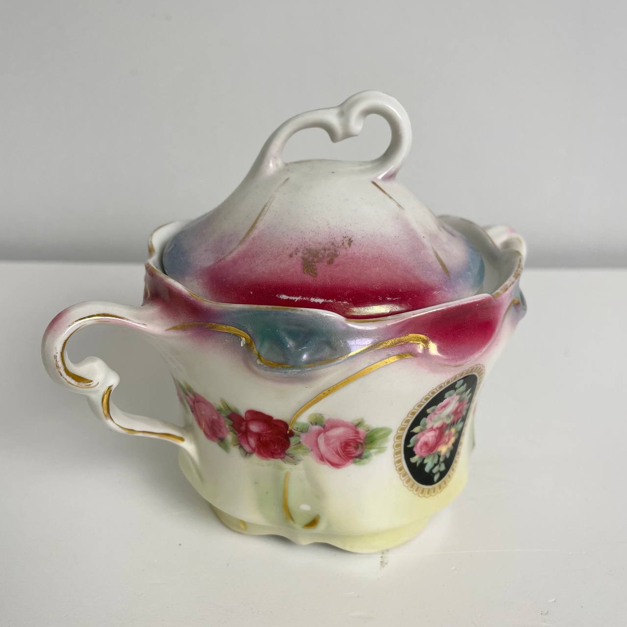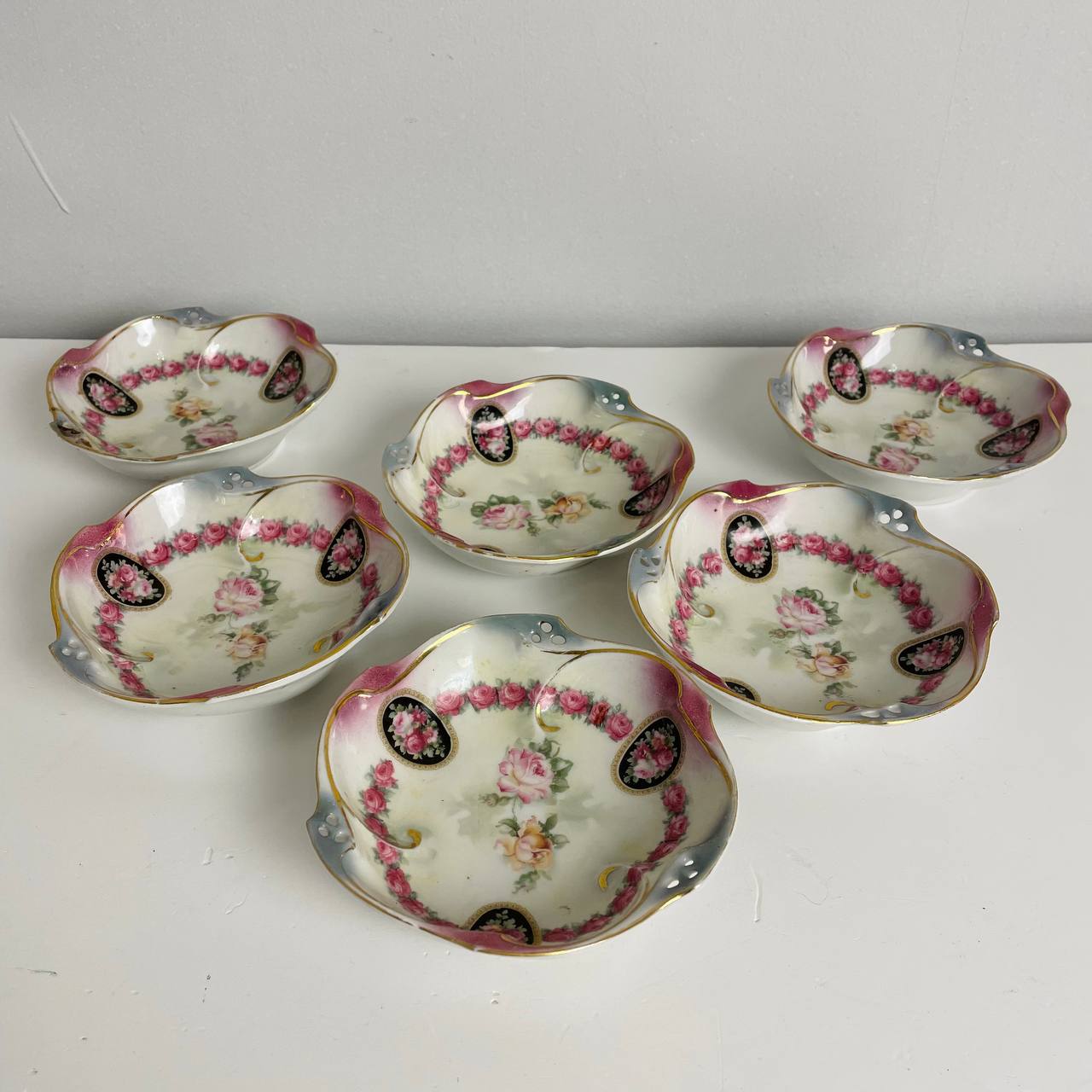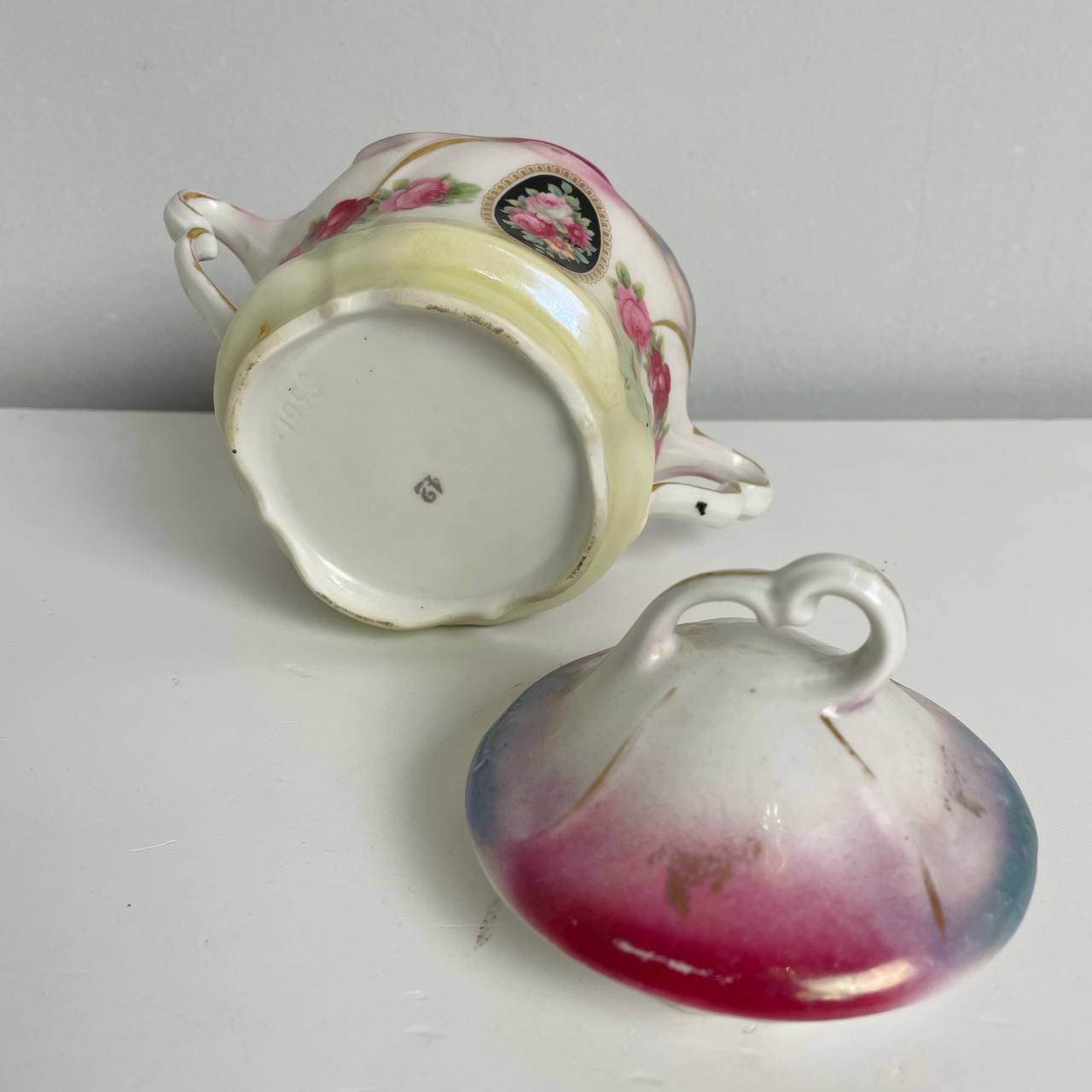 Старинный набор пиалок и сахарница первой половины XX века, Германия. Фарфор, деколь, позолота. Д пиал 12 см Сахарница 15х12h см