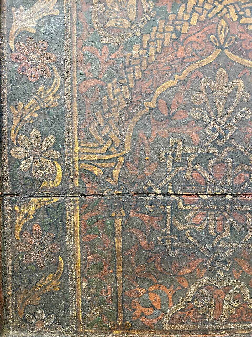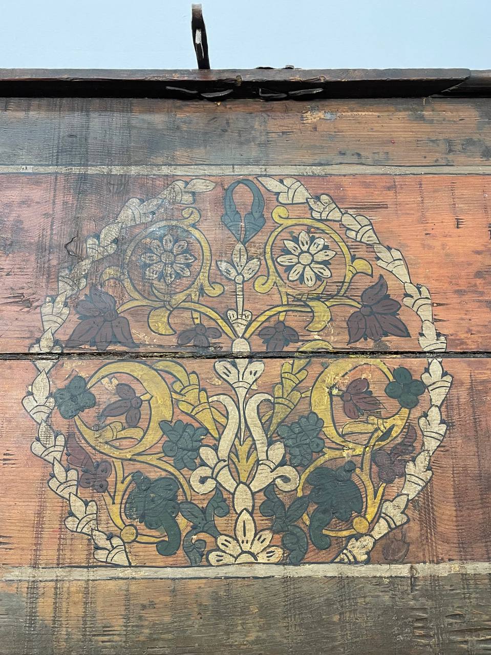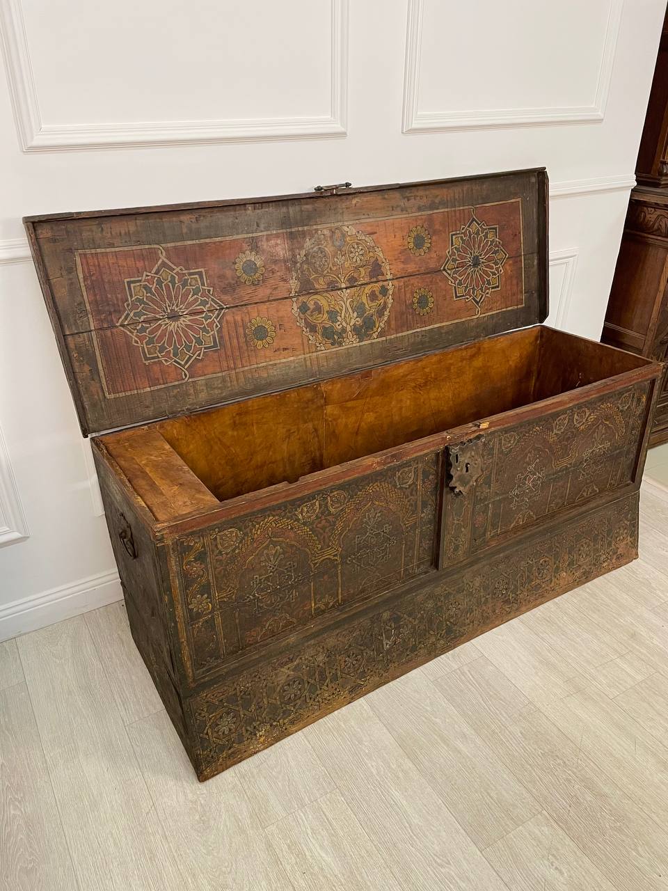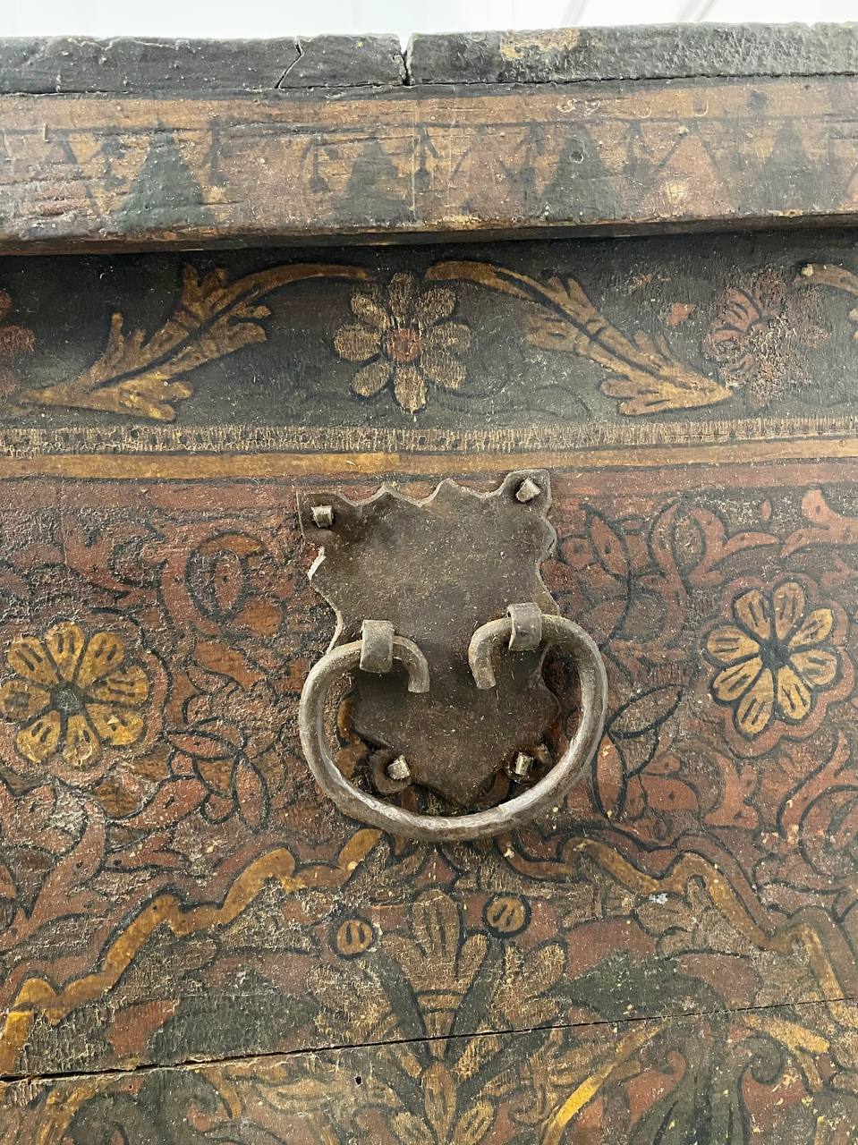 Старинный расписной сундук. Берберский сундук XVIII-XIX вв (?), Марокко. Массив сосны, орнаментальная роспись с трех сторон. Крышка сундука внутри также украшена ручной росписью. Внутри кожа. Имеется небольшой отсек для хранения мелких предметов. Оригинальная металлическая фурнитура. Ширина 143 см. Глубина 48 см. Высота 61 см.
