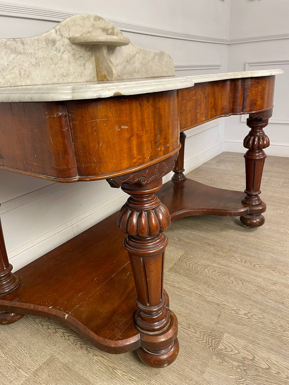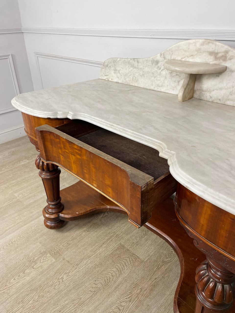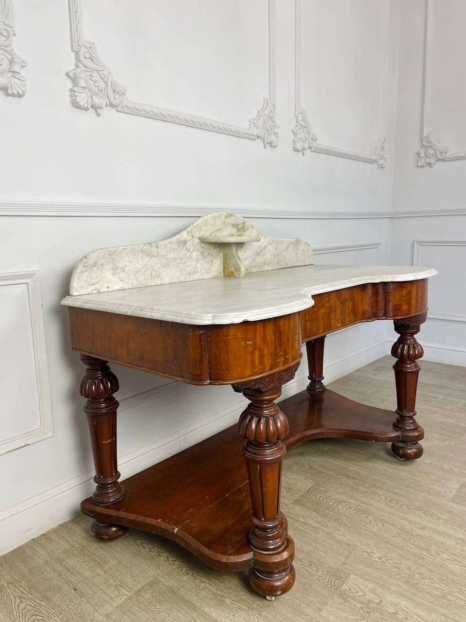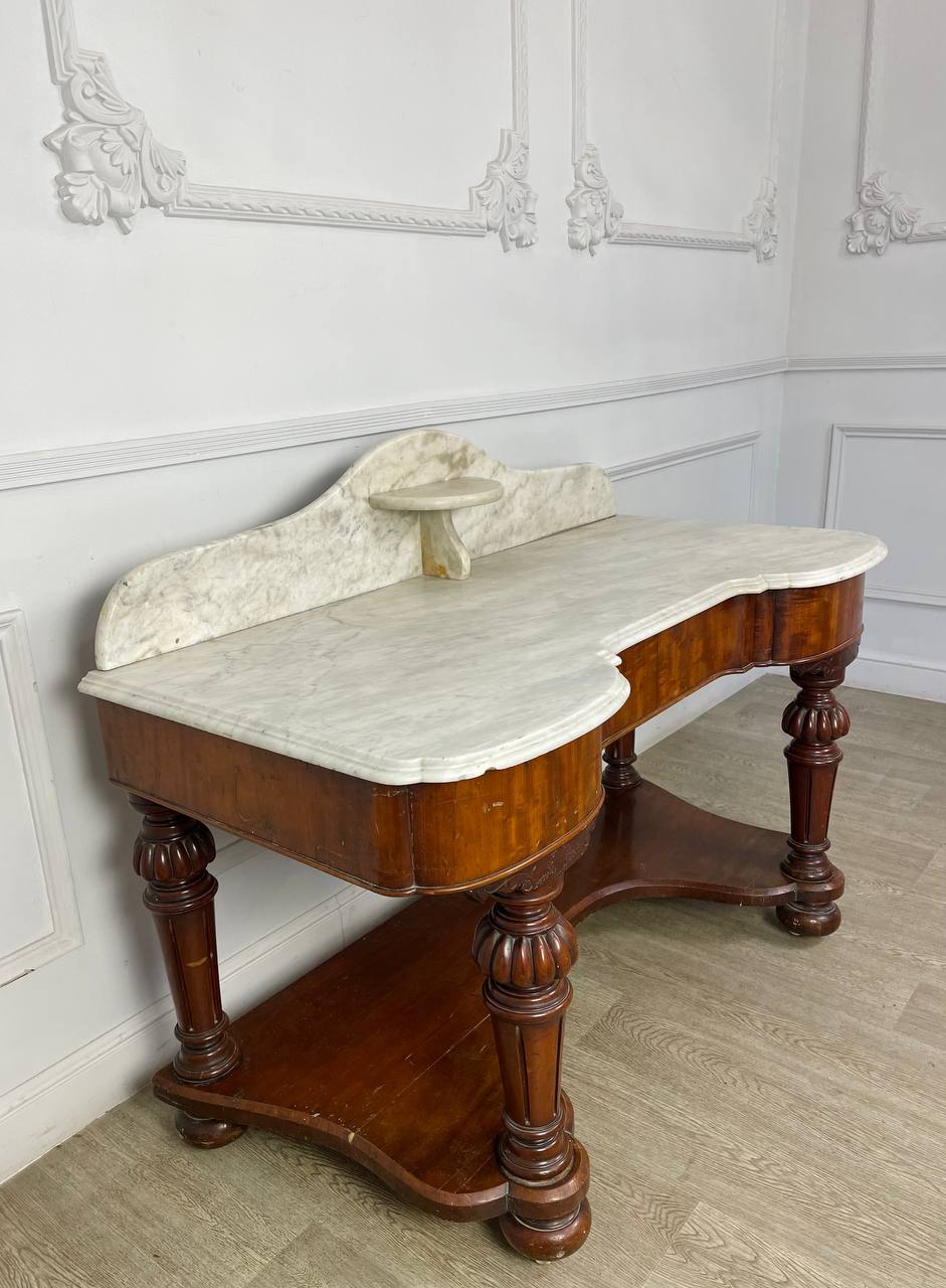 Столик для умывания конца XIX века, Россия. Выполнен из красного дерева и фигурного белого мрамора. Выдвижной ящик по центру. Размер 131х62х97h см Высота до столешницы 74 см.