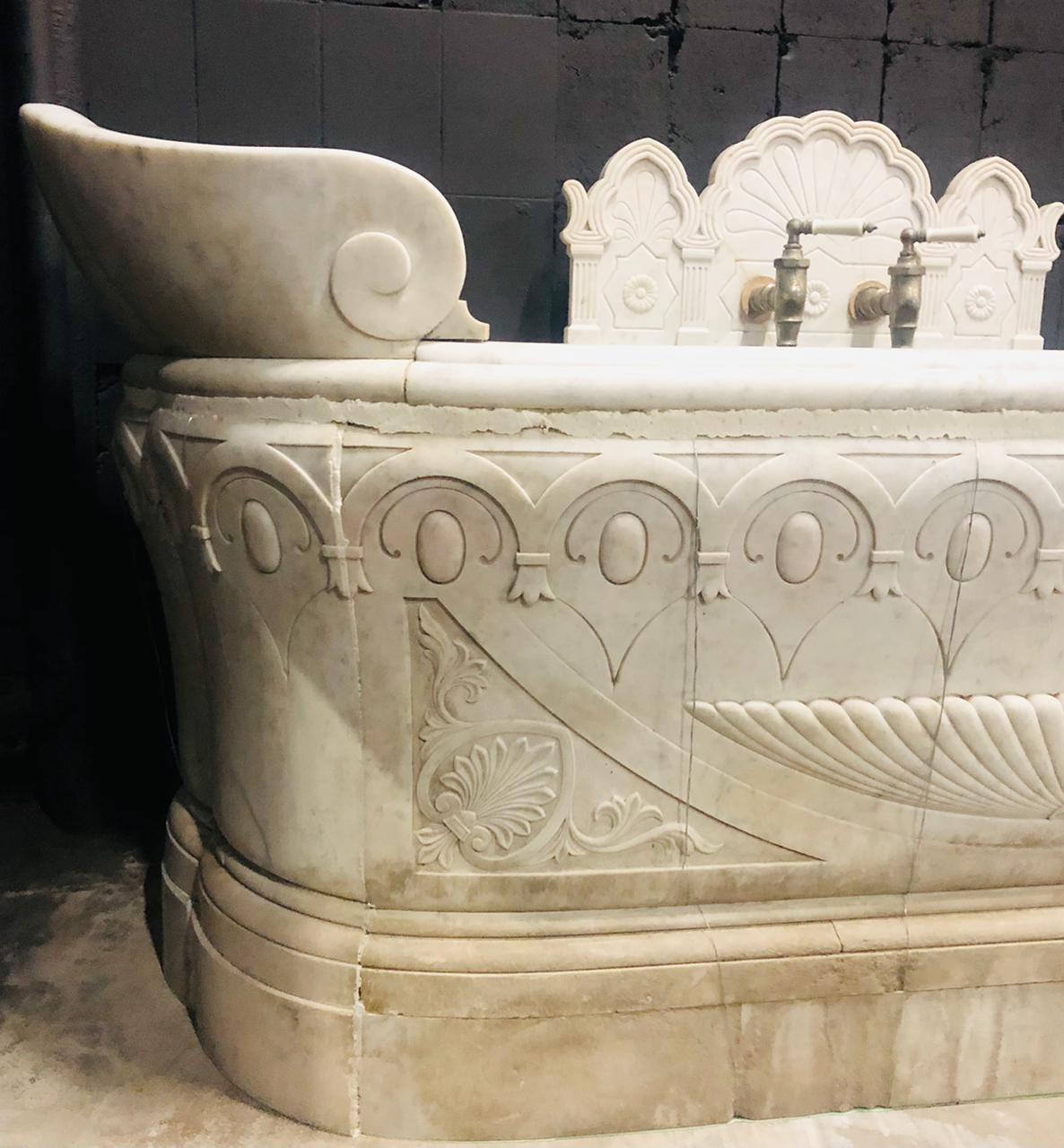 Эксклюзивный предмет в нашем собрании с выдающимся провенансом. Ванна белого мрамора создавалась для никого иного как королевы Изабеллы II (1830-1904), которая правила Испанией в неспокойные переломные для испанской монархии времена. Ванну из мрамора создавали по индивидуальному заказу для кастильского замка королевы в середине XIX века (1840 -1850 годы). История странствий предмета начинается, когда в Испании случается государственный переворот и королеву свергают. Судьба оставшейся в покинутом дворце ванны остается неизвестной с 1868 до 1937 года, когда ее инсталлируют в люксовый номер SPA-отеля Majestique в Париже. Там она и находилась до недавнего времени, пока не была продана с аукциона. Спроектированный по индивидуальным меркам внутренний резервуар имеет крупные, поистине королевские габариты. Внутреннее пространство, медное, кстати говоря, посеребрено. За полтора века серебрение частично утратилось, но первоначальный вид сегодня совсем несложно восстановить. Такие предметы - редкость масштаба лучших аукционных домов. Приходите в гости на территорию завода Кристалл в Лефортово и посмотрите на эту и множество других диковинок с душой и историей. Материалы: мрамор. Внутренний резервуар: медь, серебрение. Высота 120 см. Ширина 240 см. Глубина 110 см.