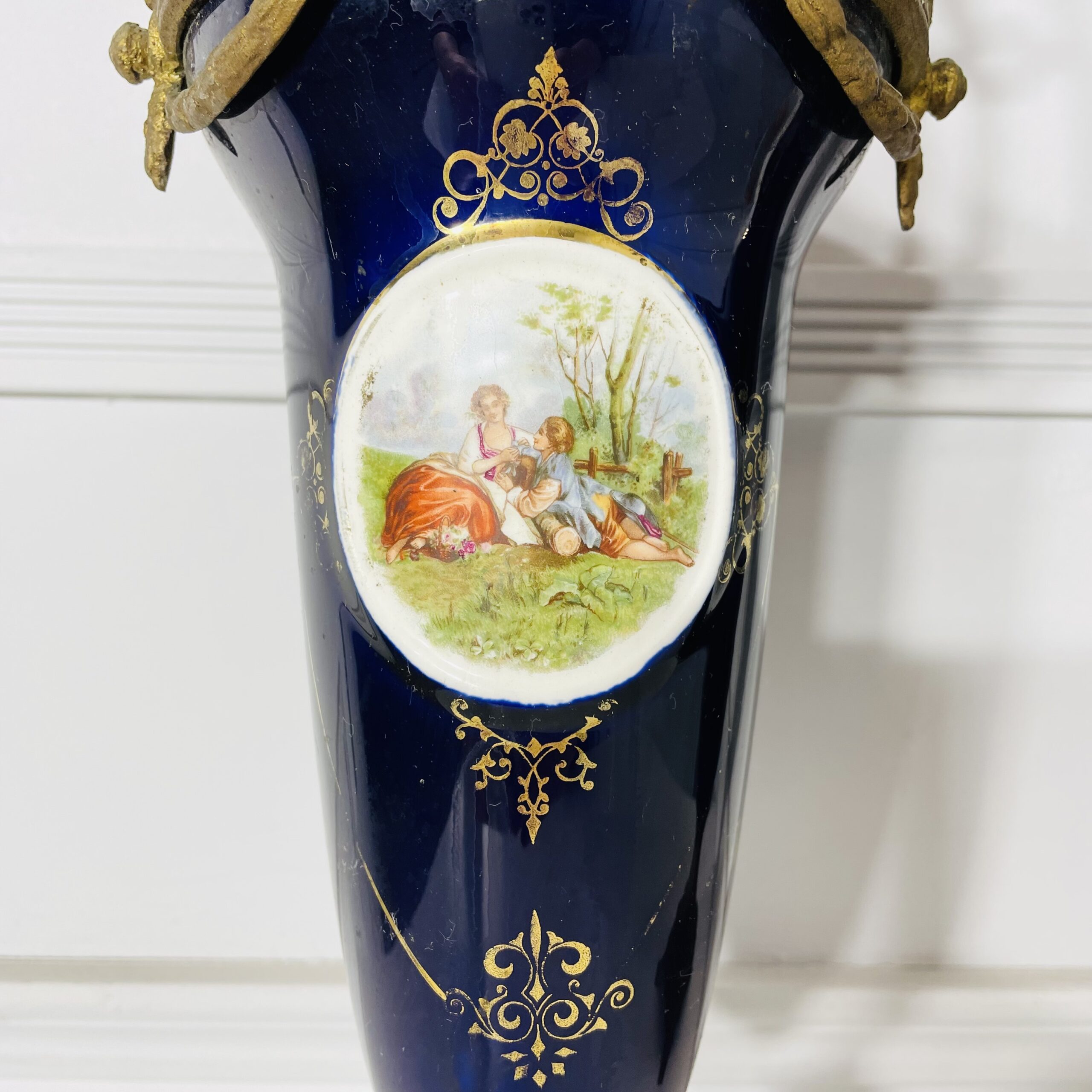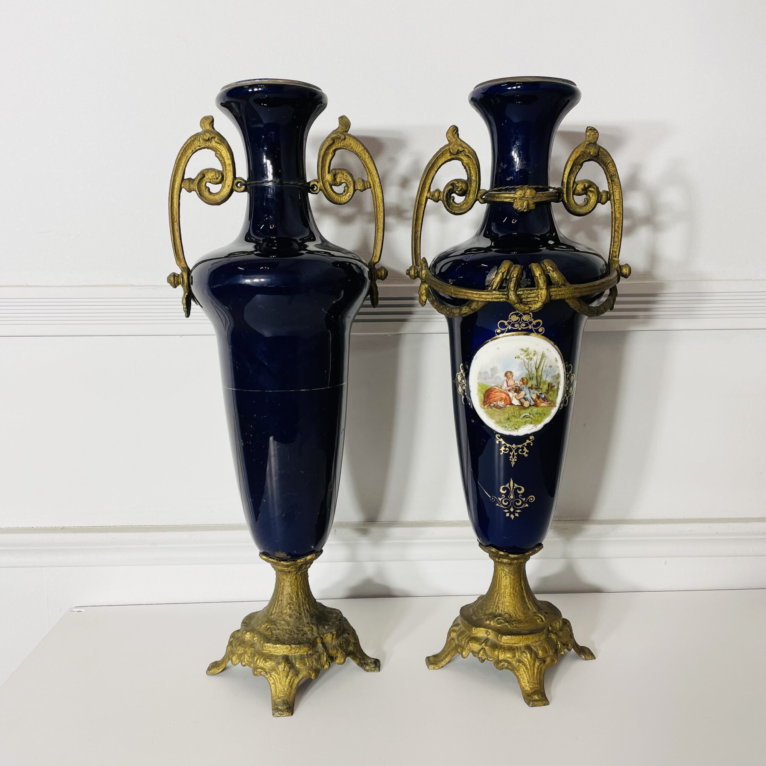 Парные вазы начала XX века, Франция. Выполнены из кобальта и шпиатра. Ручная роспись, позолота. Незначительные следы бытования. Высота 41 см. Цена за пару.
