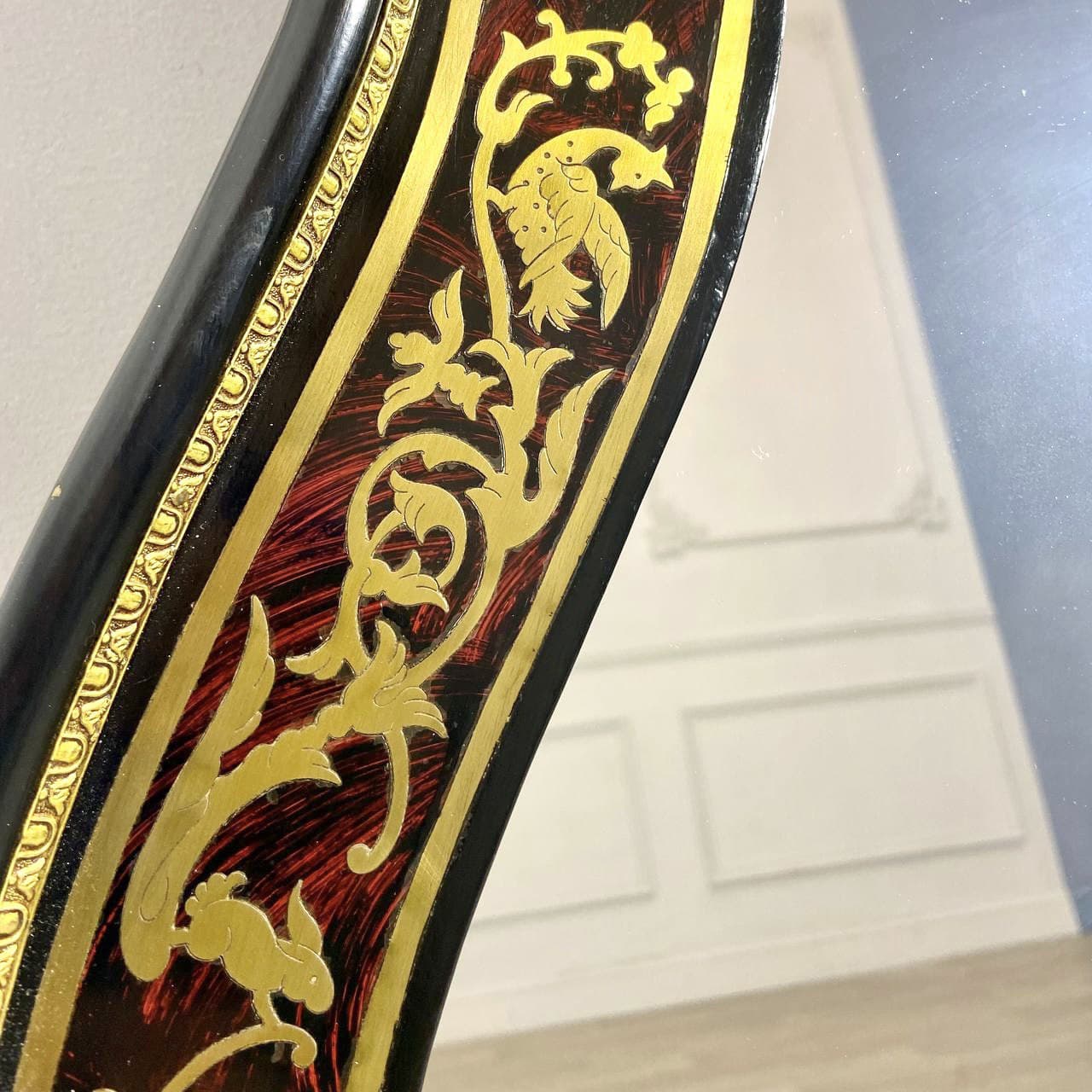 Редкая пара антикварных зеркал с декоративными рамами, выполненными в технике Буль около 1960 года, Франция. Деревянные рамы украшены тонкой бронзовой инкрустацией с растительно-зооморфным орнаментом и фигурными накладками из литой бронзы. Размер 66.5 х 108h см. Цена указана за пару.