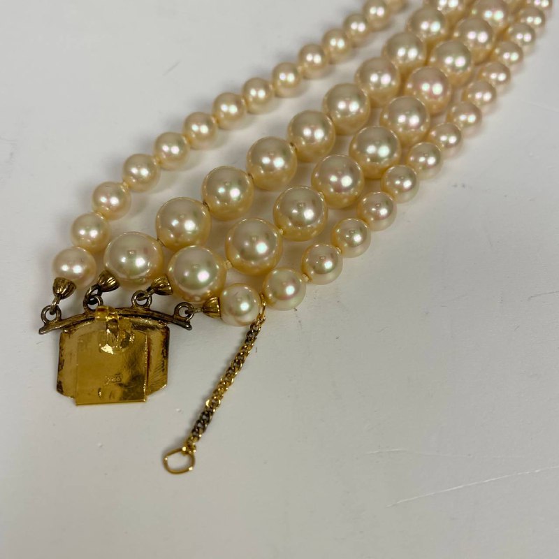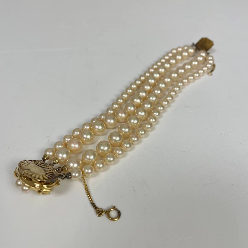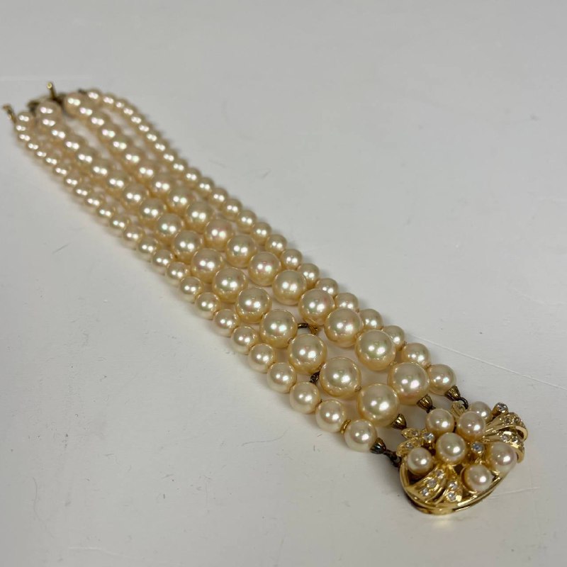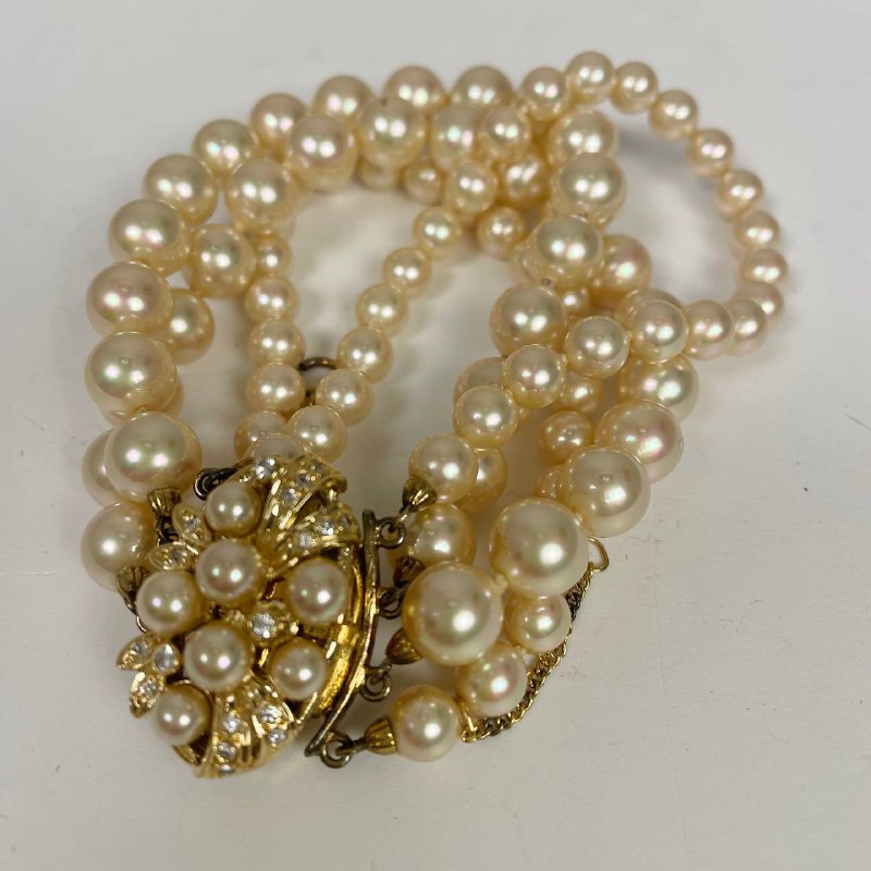 Браслет витражный 1960х, Majorica, Испания. Органический жемчуг, фианиты, позолота. Цепочка с предохранителем. Размер 18 см.