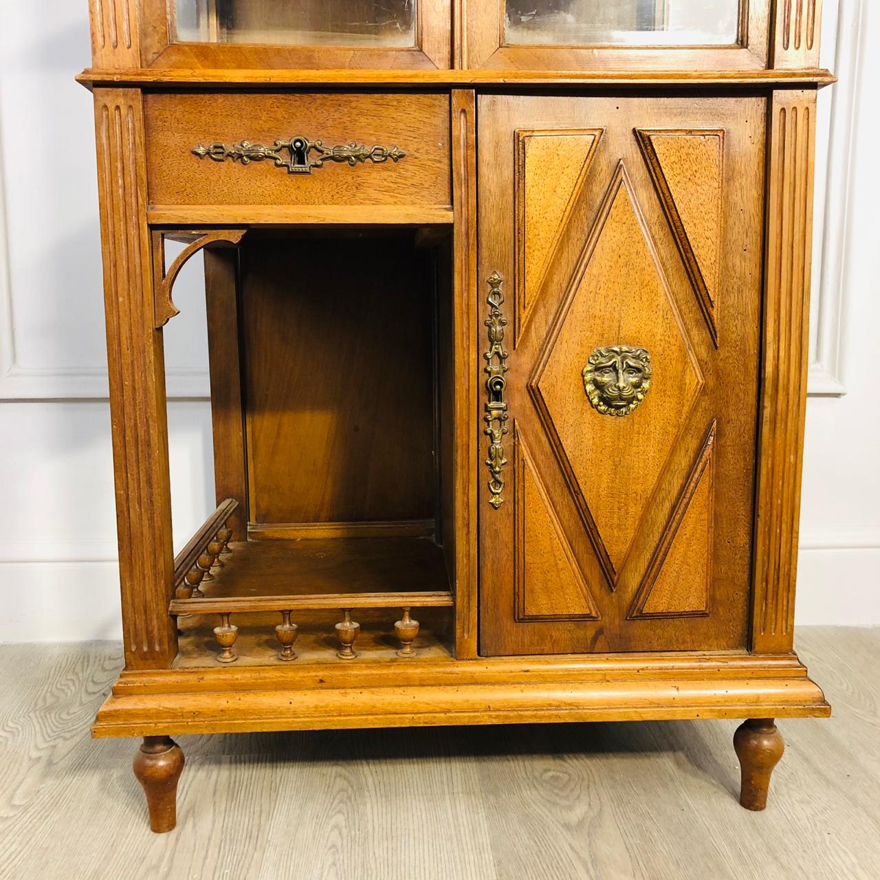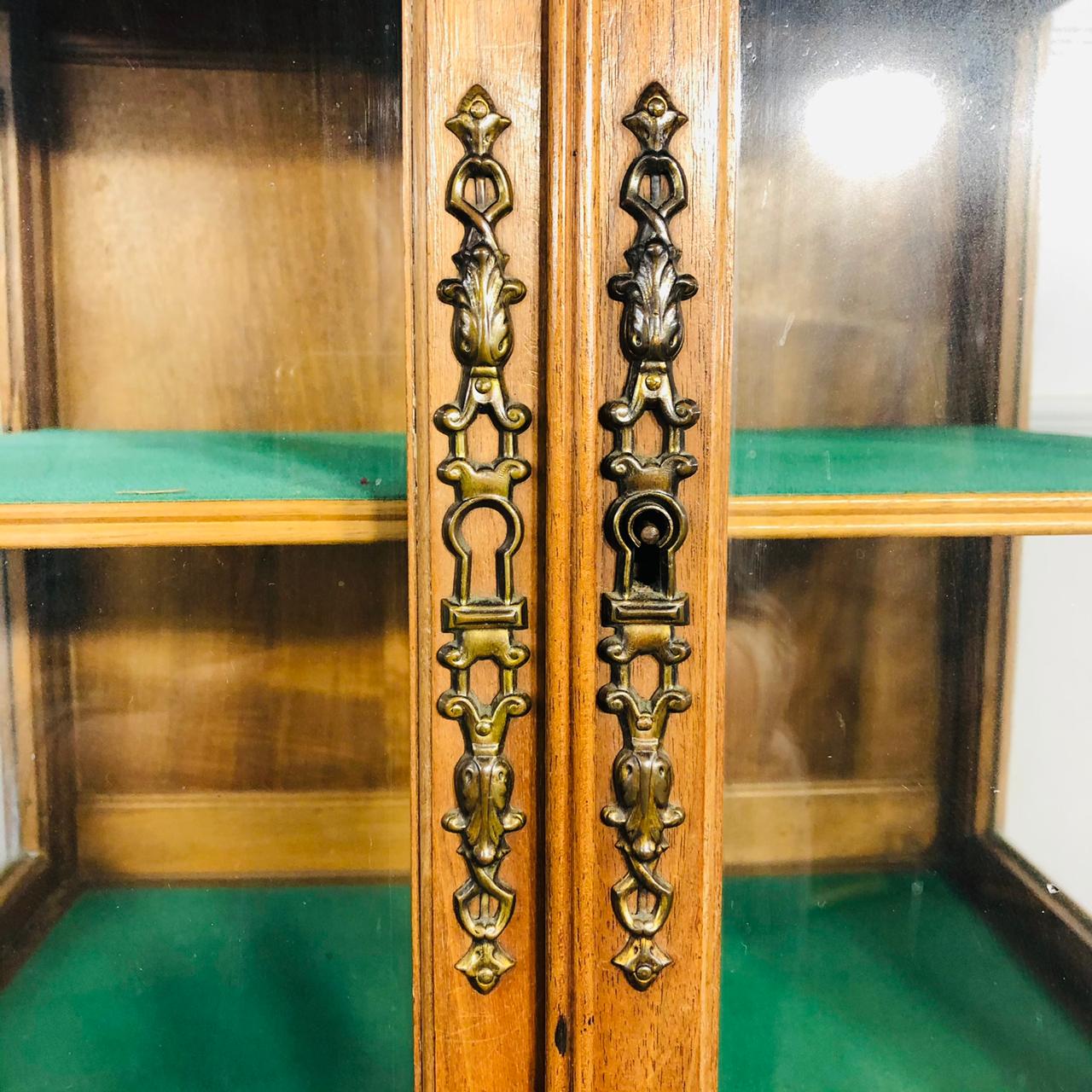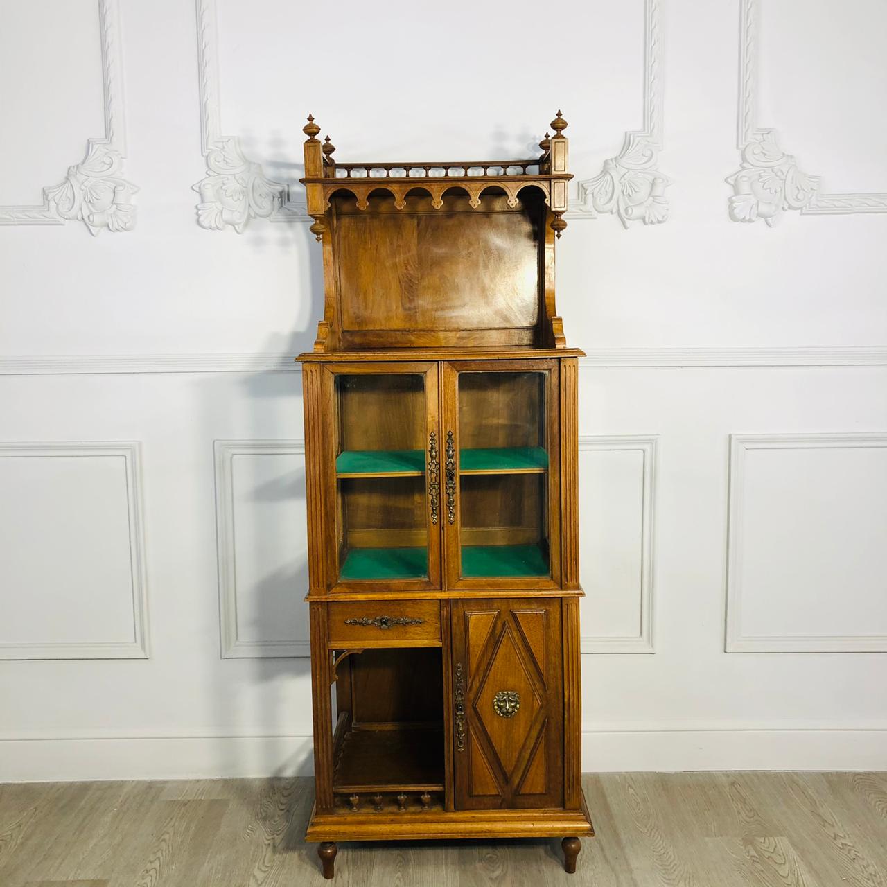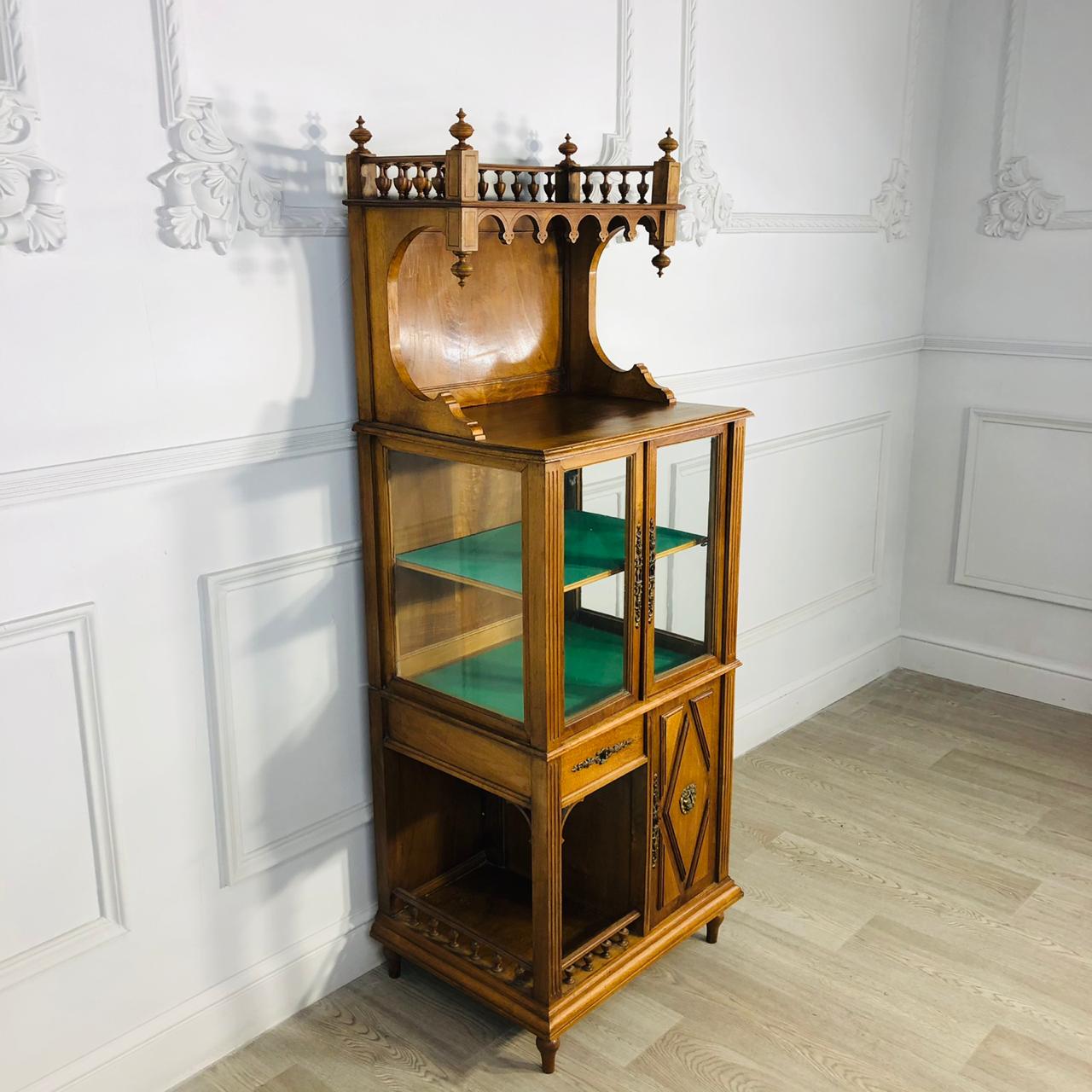 Небольшая антикварная витрина начала XX века Франция. Выполнена из ореха. Внутри зеленое сукно. Украшена оригинальной латунной фурнитурой. Размер 53х41х145h см.