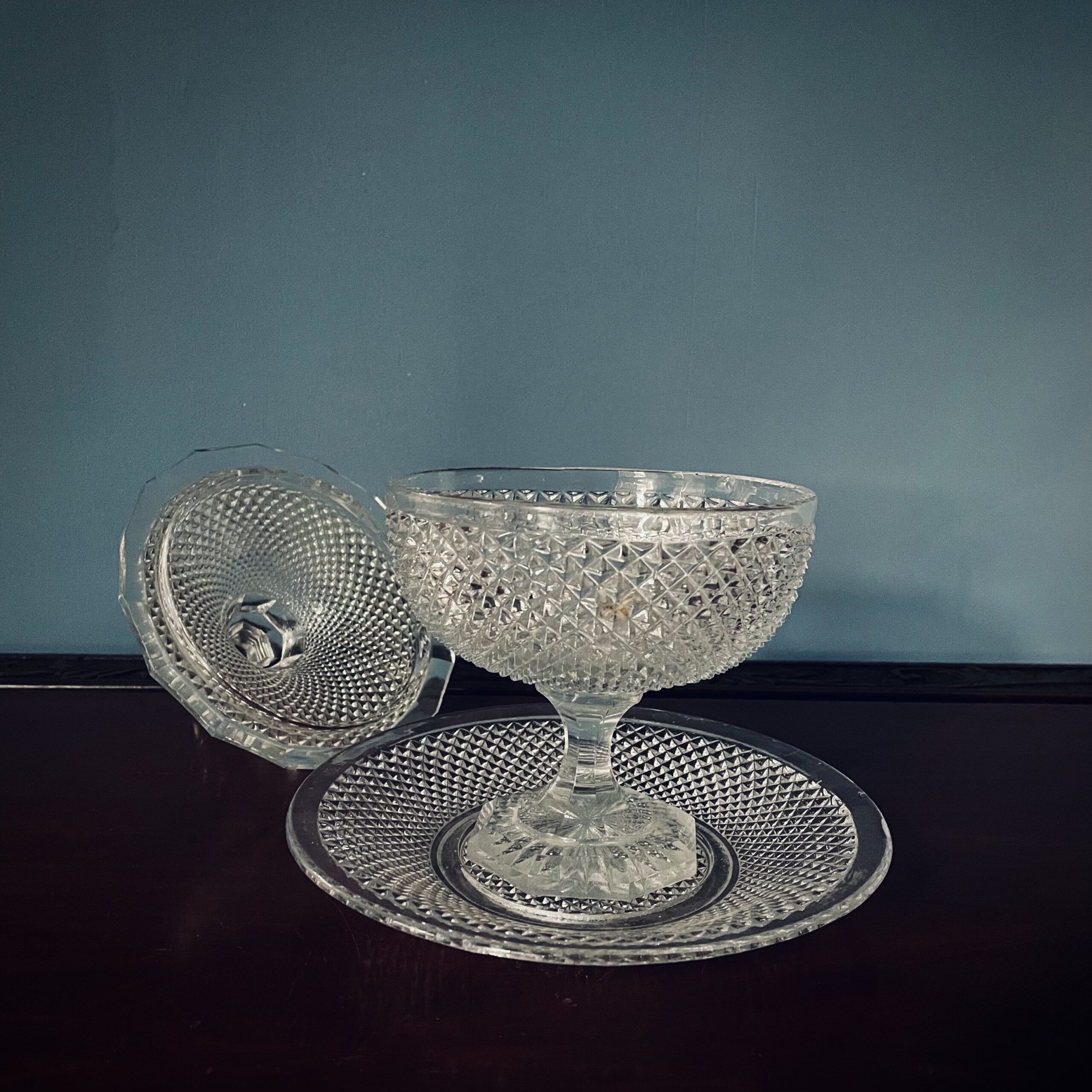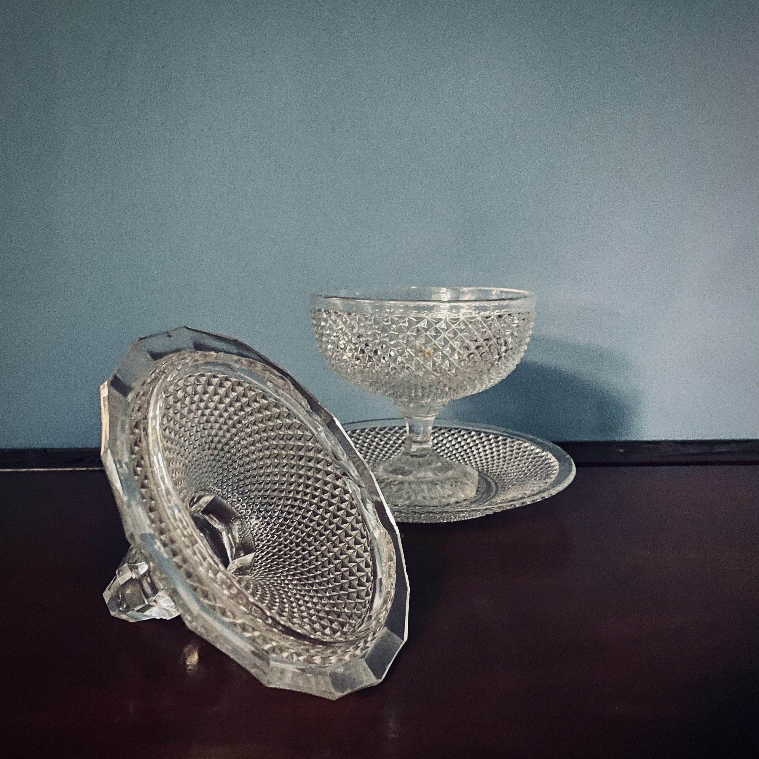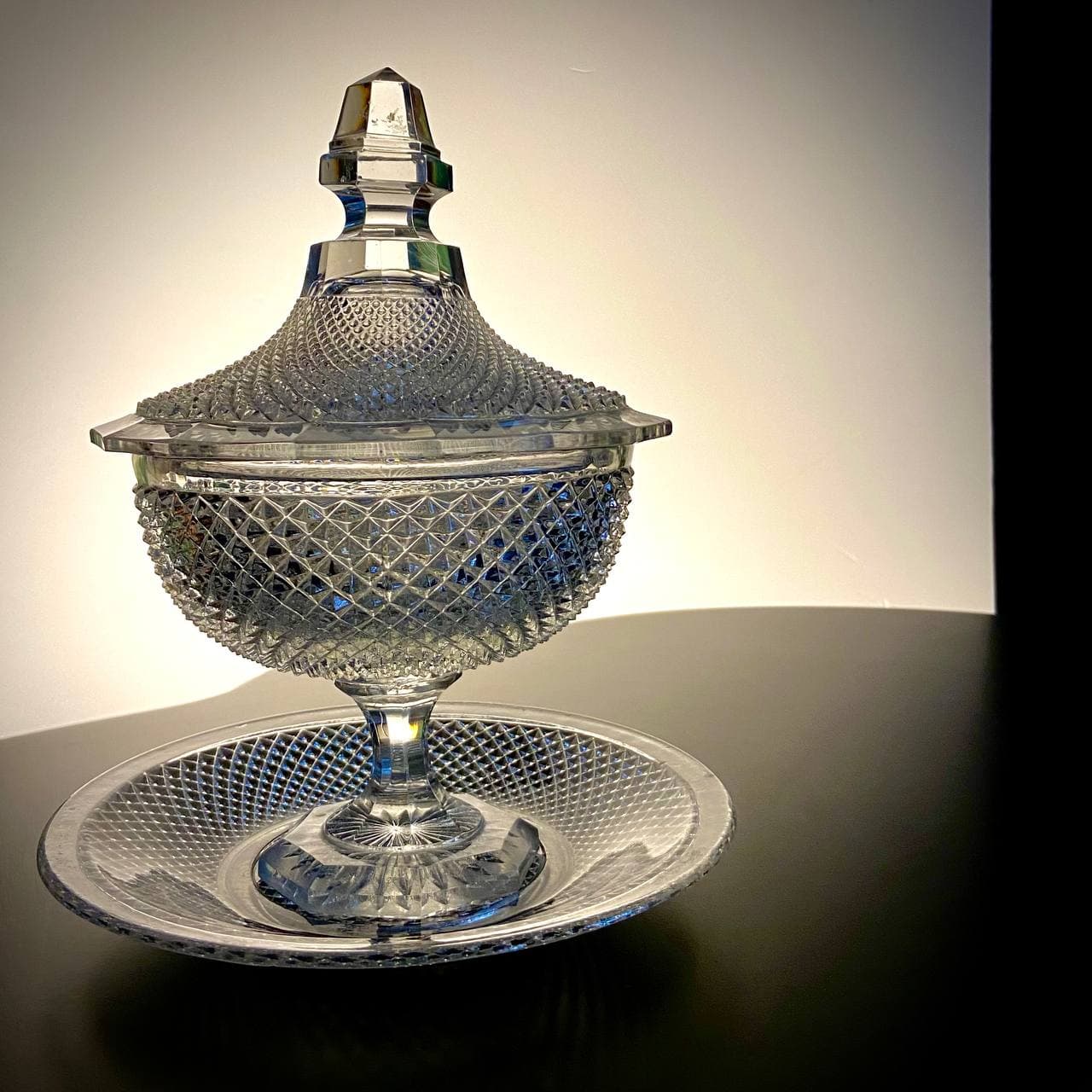 Хрустальная вазочка на поддоне Baccarat начала XX века (1910-1930гг), Франция. Диаметр блюда 20 см. Диаметр вазочки 16 см. Высота 26 см. Незначительные сколы по краю крышки.