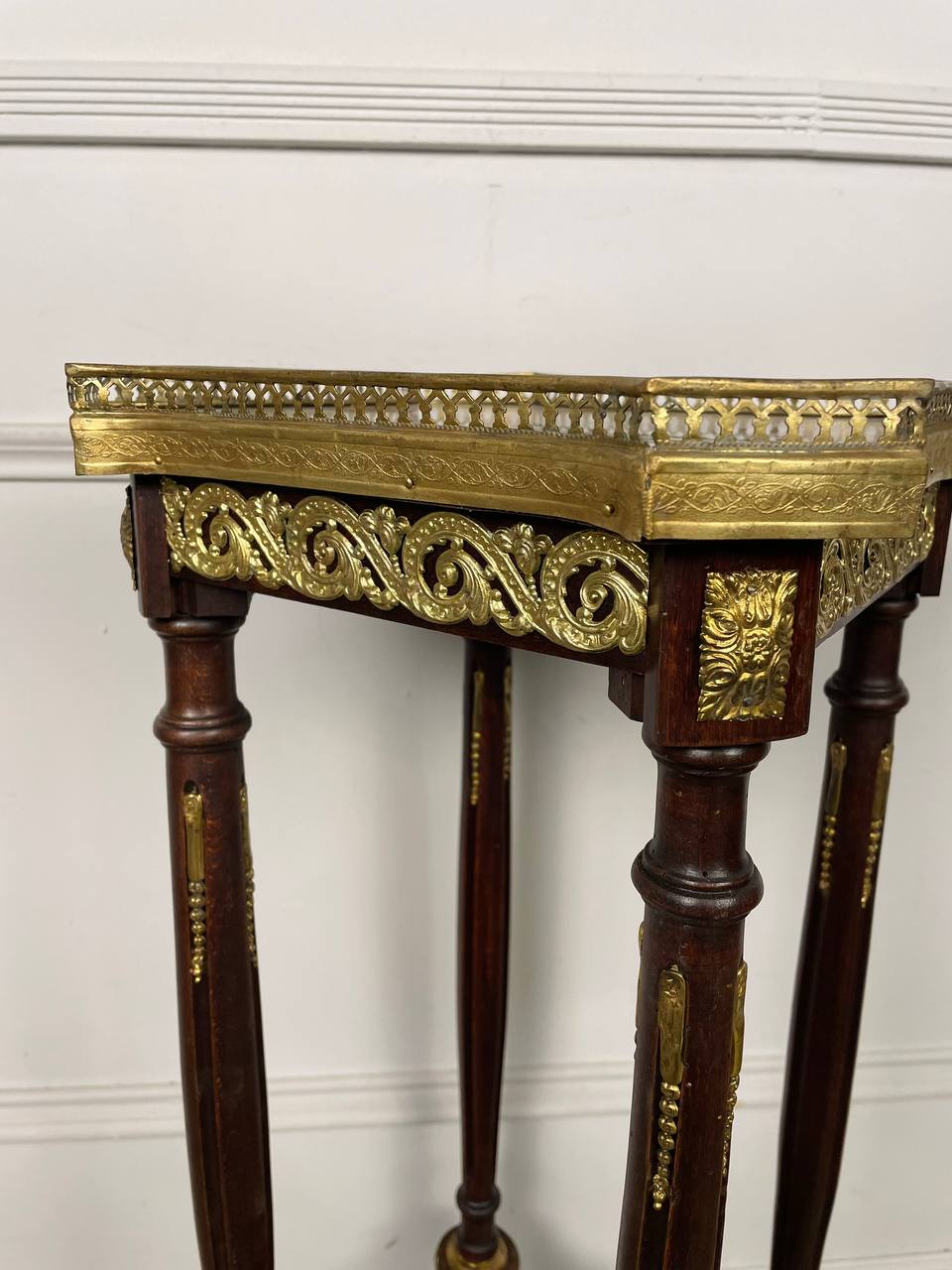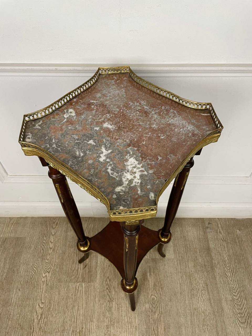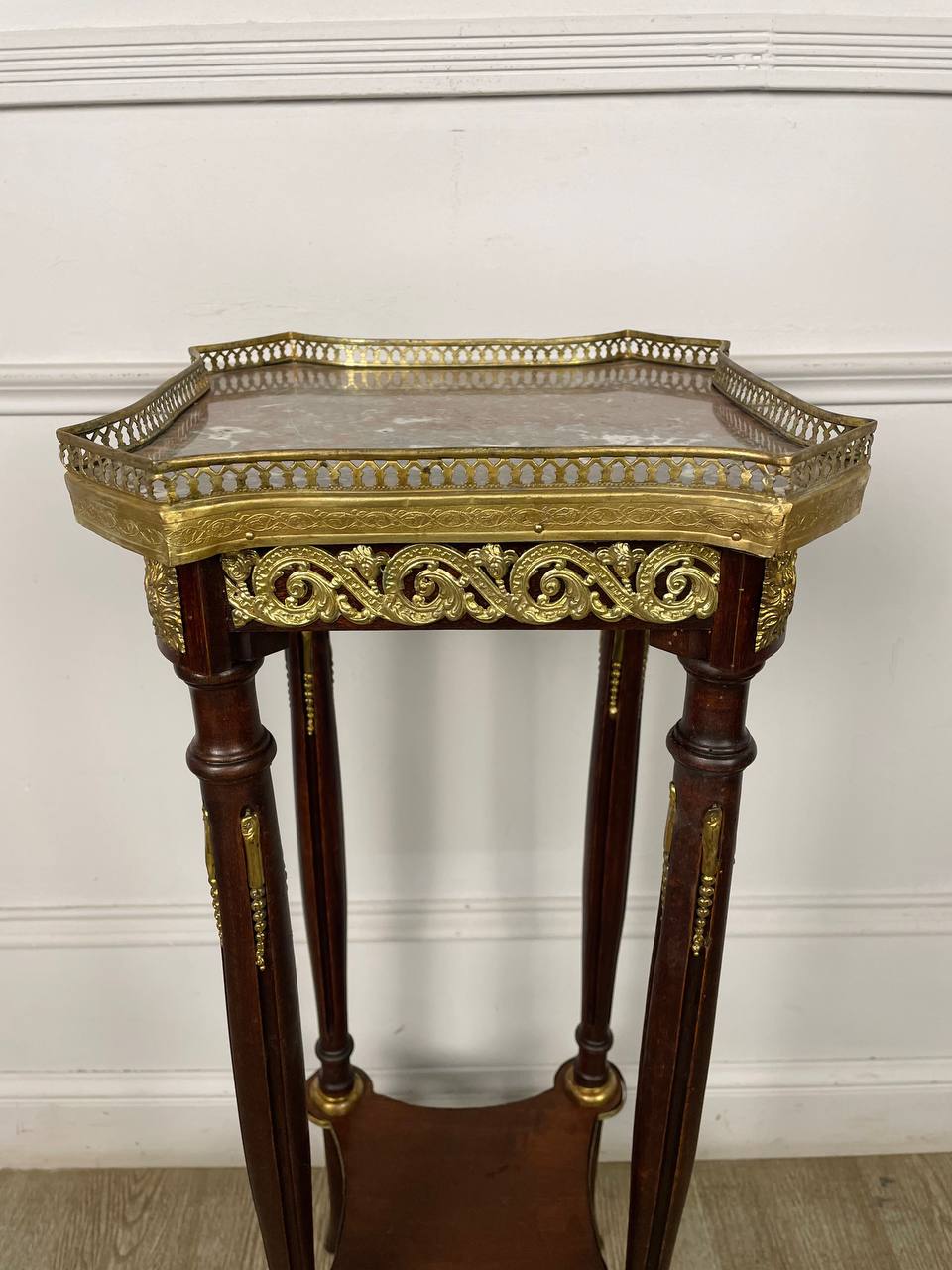 Подставка в стиле Луи XVI конца XIX века, Франция. Выполнена из массива ореха. Столешница выполнена из оригинального мрамора. Оригинальная фурнитура из бронзы и латуни.
