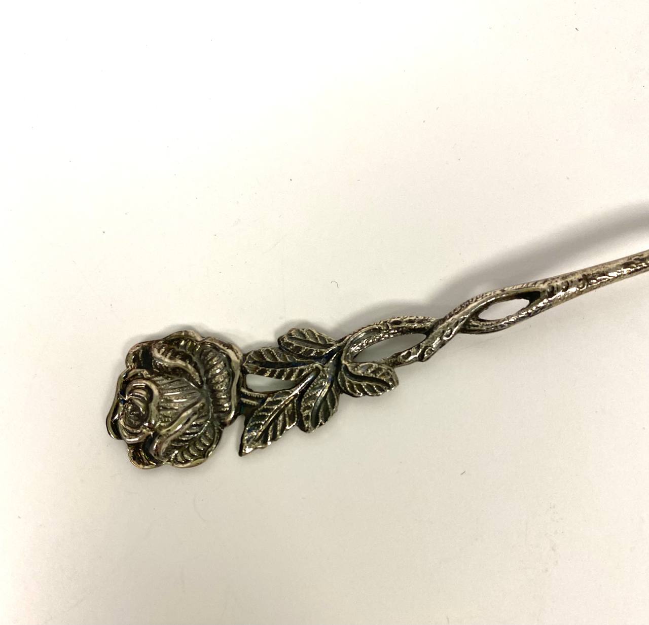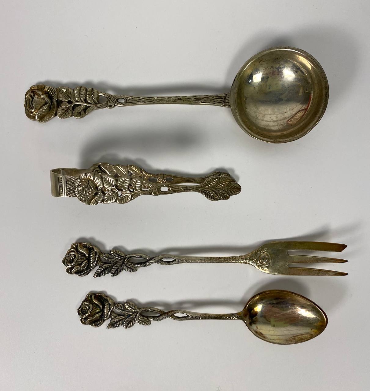 Десертный набор "Хильдесхаймская роза", Pfeiffer Bestecke, Германия, 1960-70-е годы. Серебро 800 пробы. В комплекте 6 кофейных ложечек, 6 вилочек, лопатка, щипцы для сахара, ложечки для компота, варенья, мороженого. Оригинальный кофр. Размер кофра: 26,5х22 см