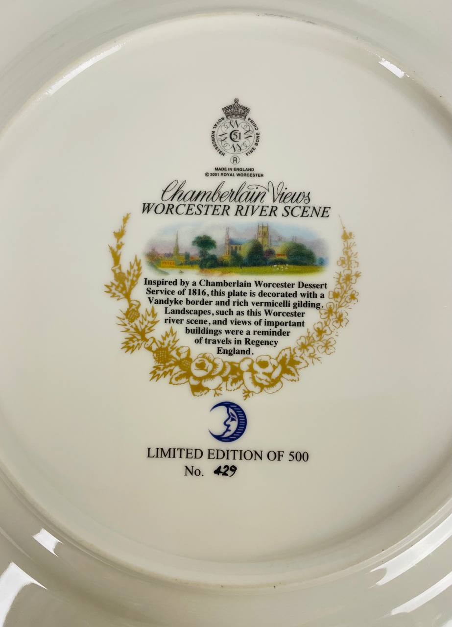 Эта тарелка, созданная по мотивам сервиза для десертов Chamberlain Worcester 1816 года, украшена бордюром в стиле Вандайк и богатой позолотой.