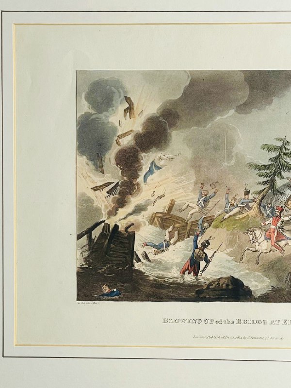 Антикварная гравюра "Взрыв моста в Эльстере", ХIХ век, Англия. Издательство Джеймса Дженкинса, 1815, Лондон. Цветная акватинта с ручной раскраской акварелью. Размер: 51х42,5 см.