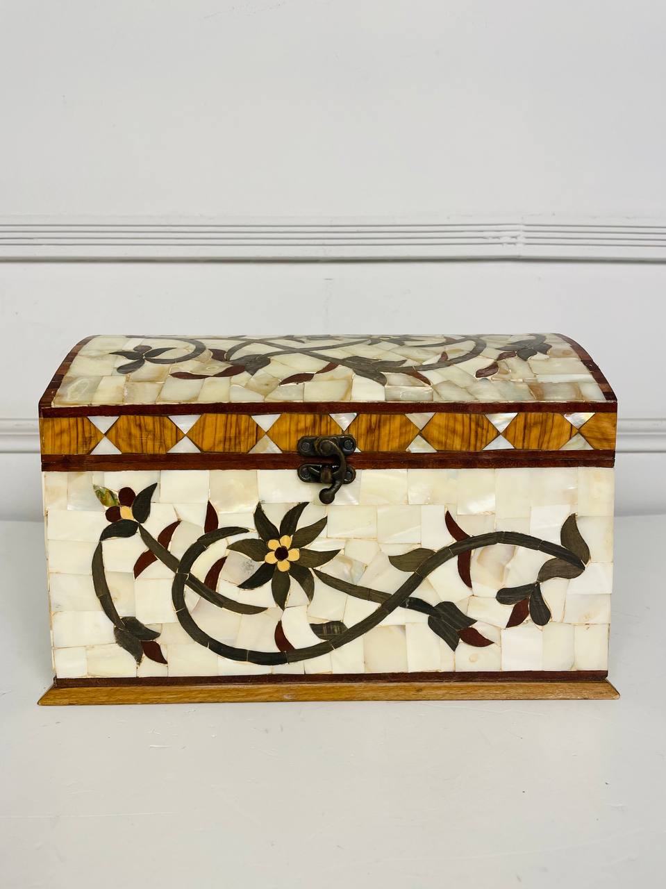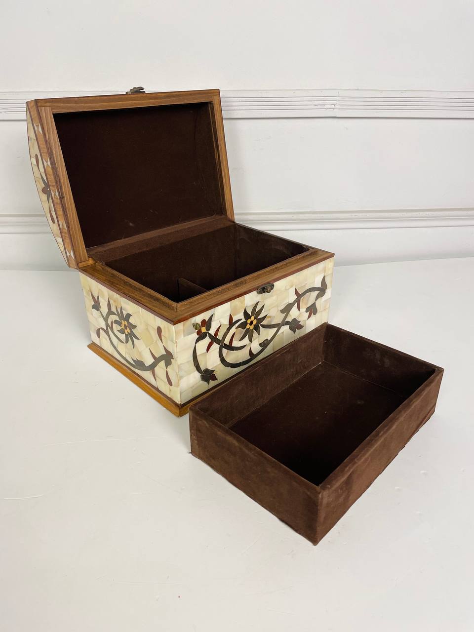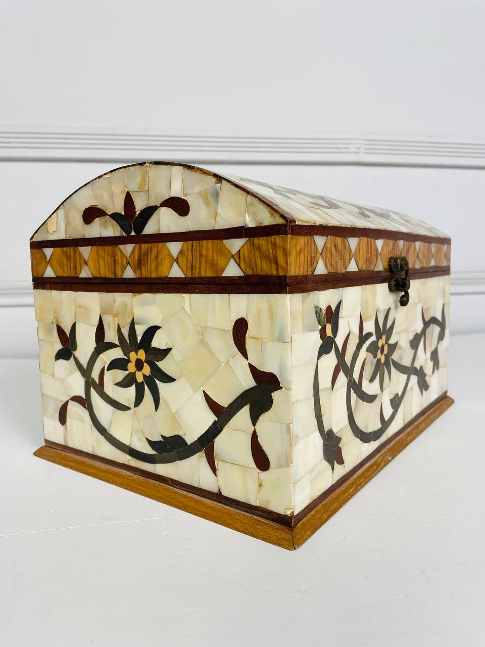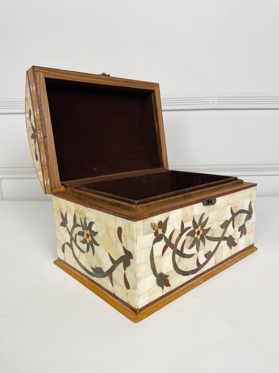 Антикварная БОЛЬШАЯ шкатулка середины XX века. Выполнена из натурального перламутра и ценных пород дерева. Внутри два яруса для хранения. Размер 29х21х19h см.