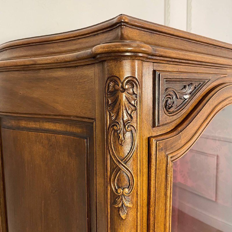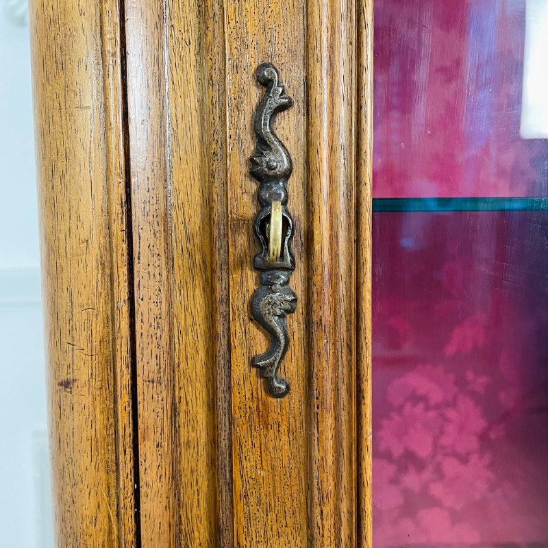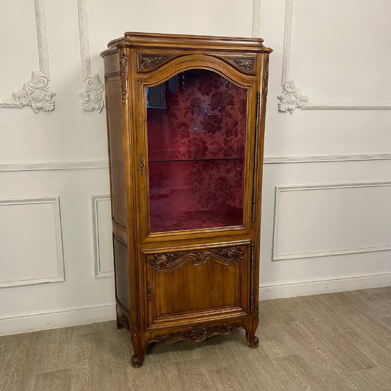 Старинный шкафчик-витрина из массива ореха, начало ХХ века. Декоративная резьба, внутренняя стенка отделана атласной тканью.