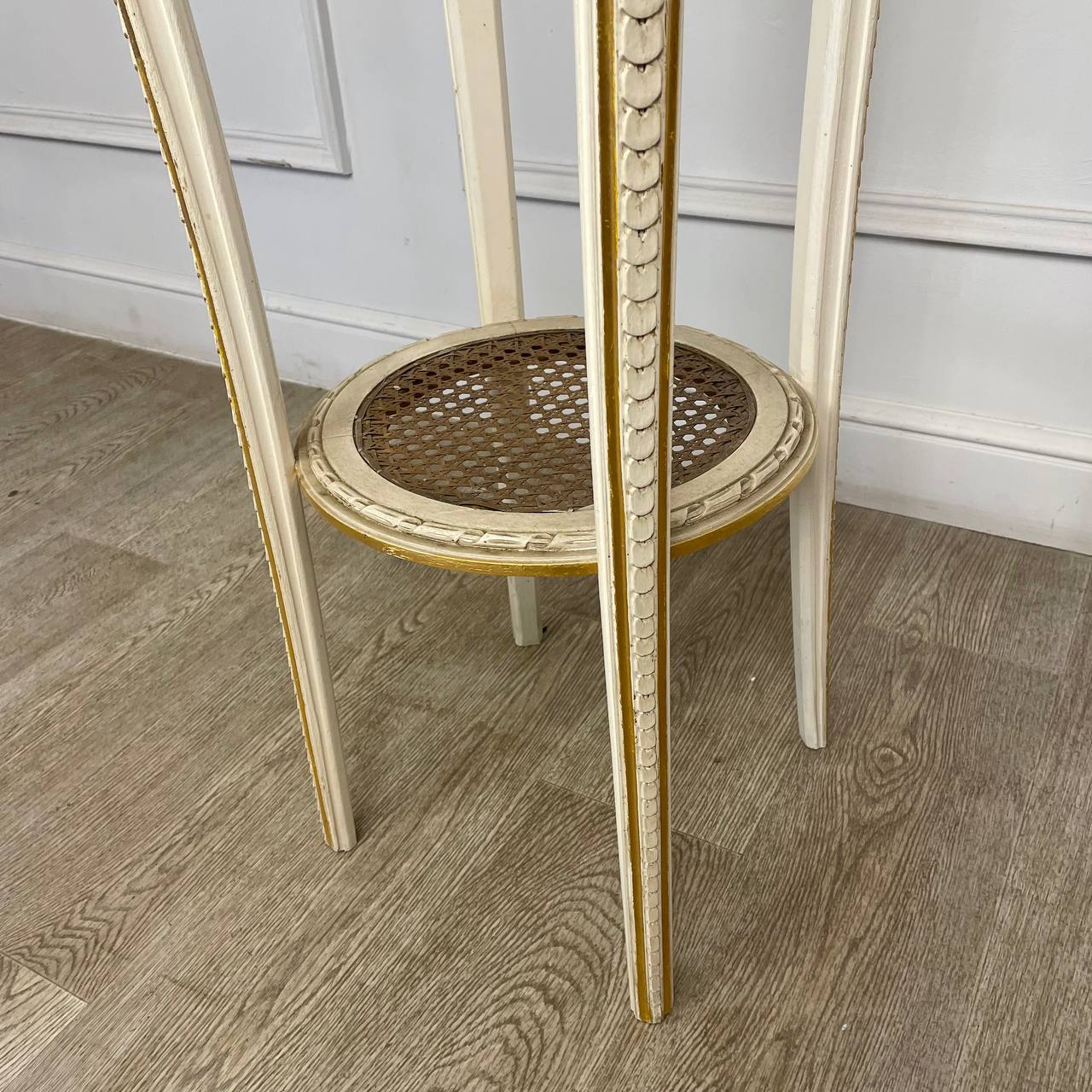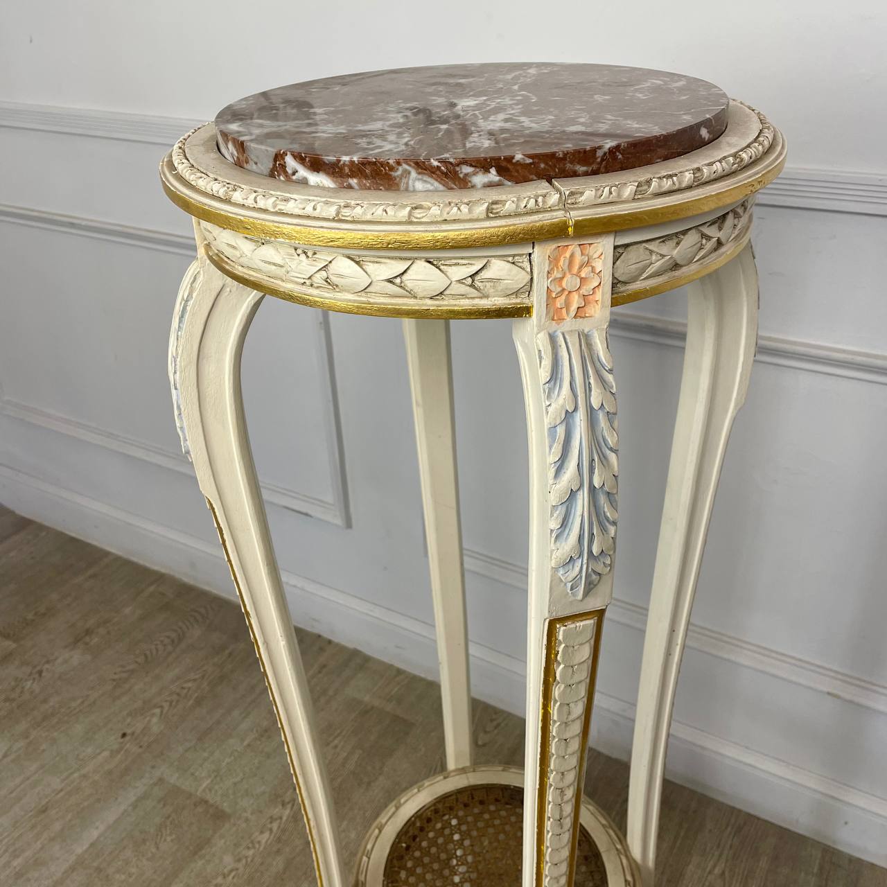 Старинная высокая подставка или столик в стиле Людовика XVI Европа, Франция. Первая половина XX века. Выполнена из ореха и натурального Ротанга. Столешница из натурального оригинального мрамора. Покрашена в белый цвет с позолотой. Диаметр столешницы 40 см. Высота 115 см.