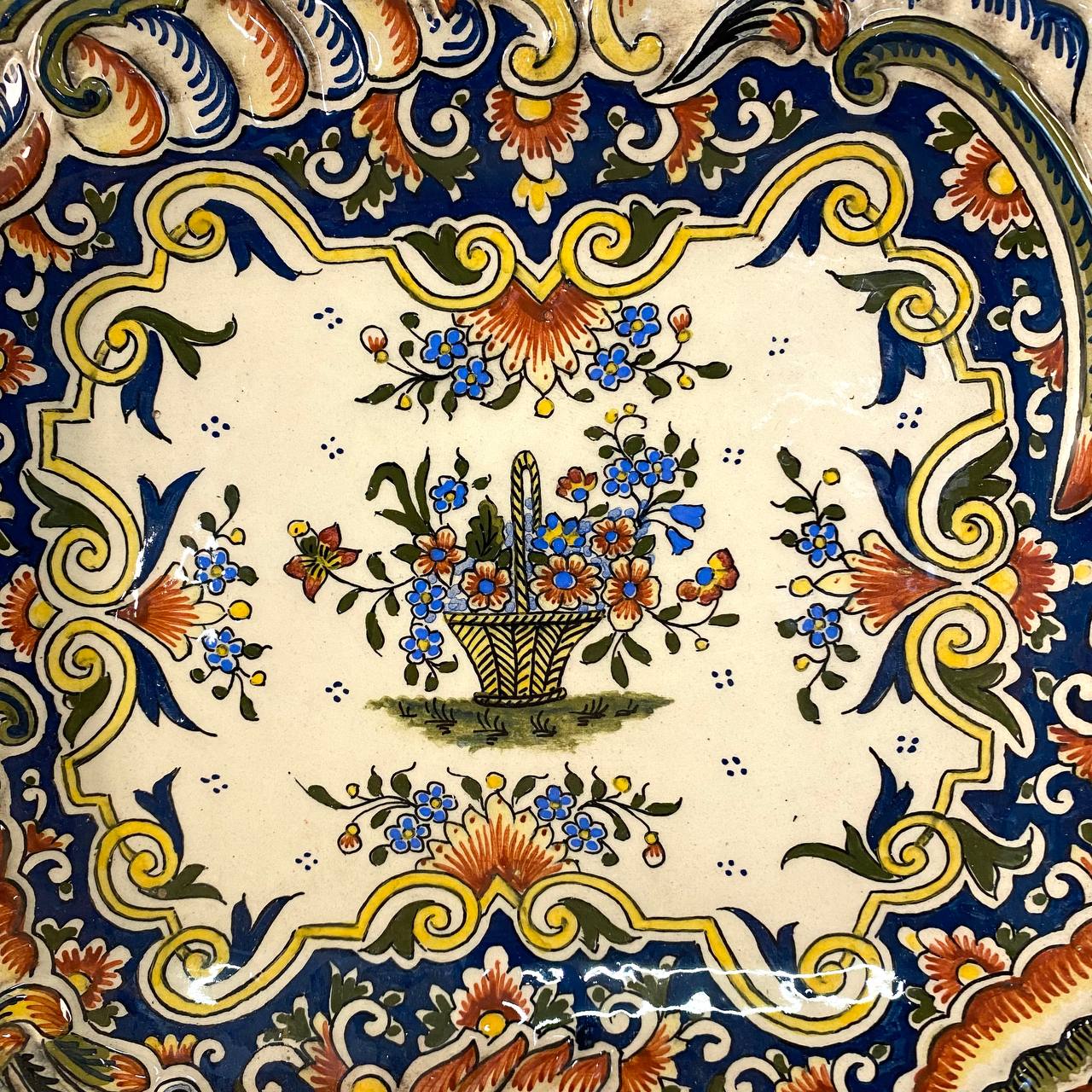 Антикварное блюдо известной мануфактуры Rouen (Нормандия), Франция. Начало XX века. Руан был центром производства французского фаянса и глиняной посуды с оловянным покрытием, по крайней мере, с 1540-х годов. Руанский фаянс был полностью французским по стилям, хотя позднее на него оказал влияние китайский фарфор. В Руане было разработано несколько стилей, рисунков с характерным орнаментом, который стал их визитной карточкой во всем мире. Фаянс, ручная роспись. Размер 37х25х5h см.