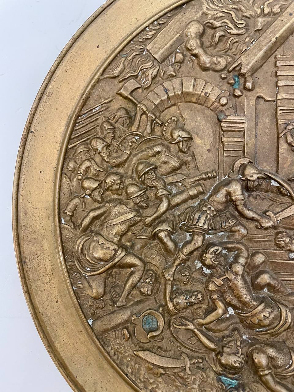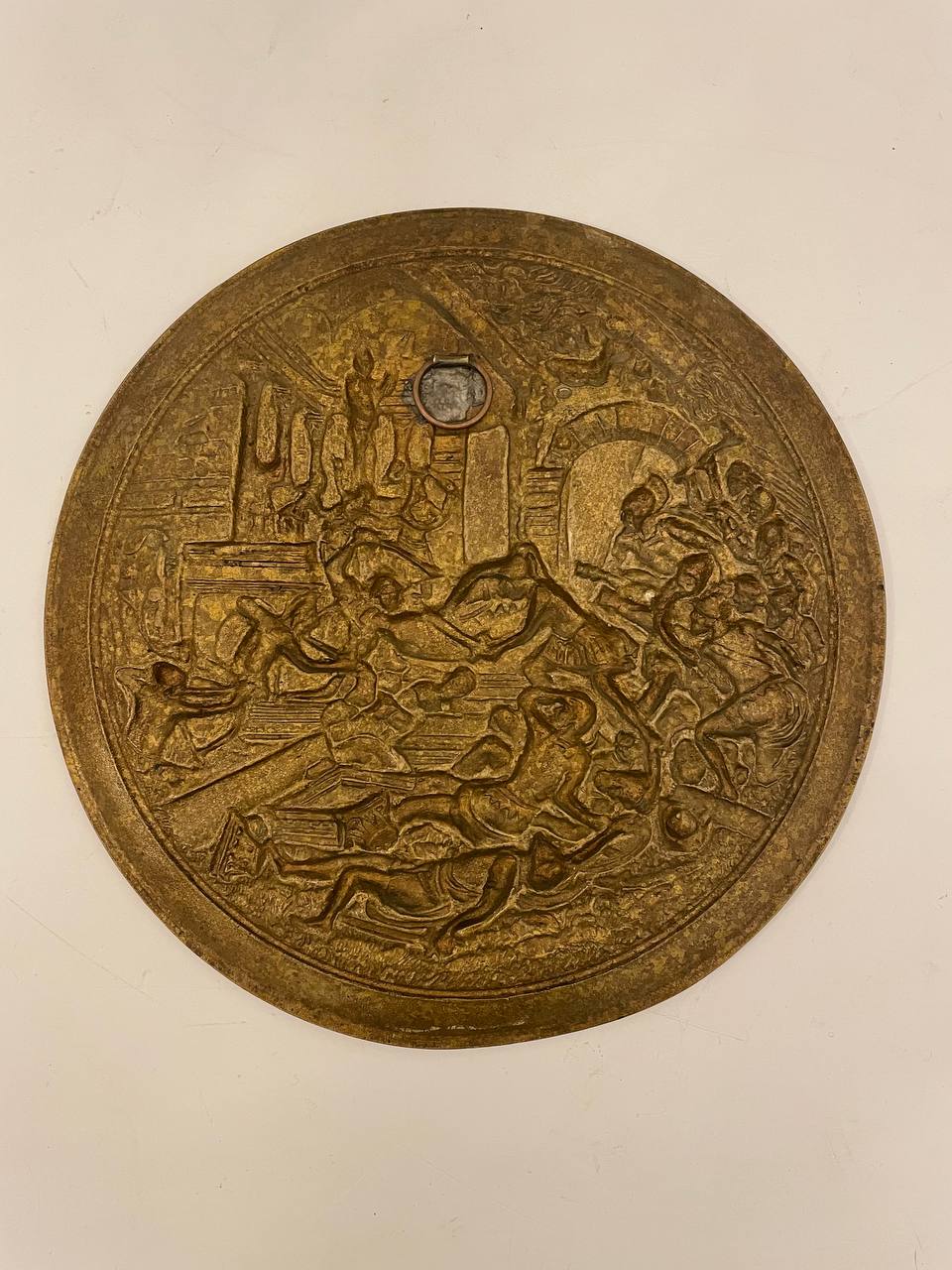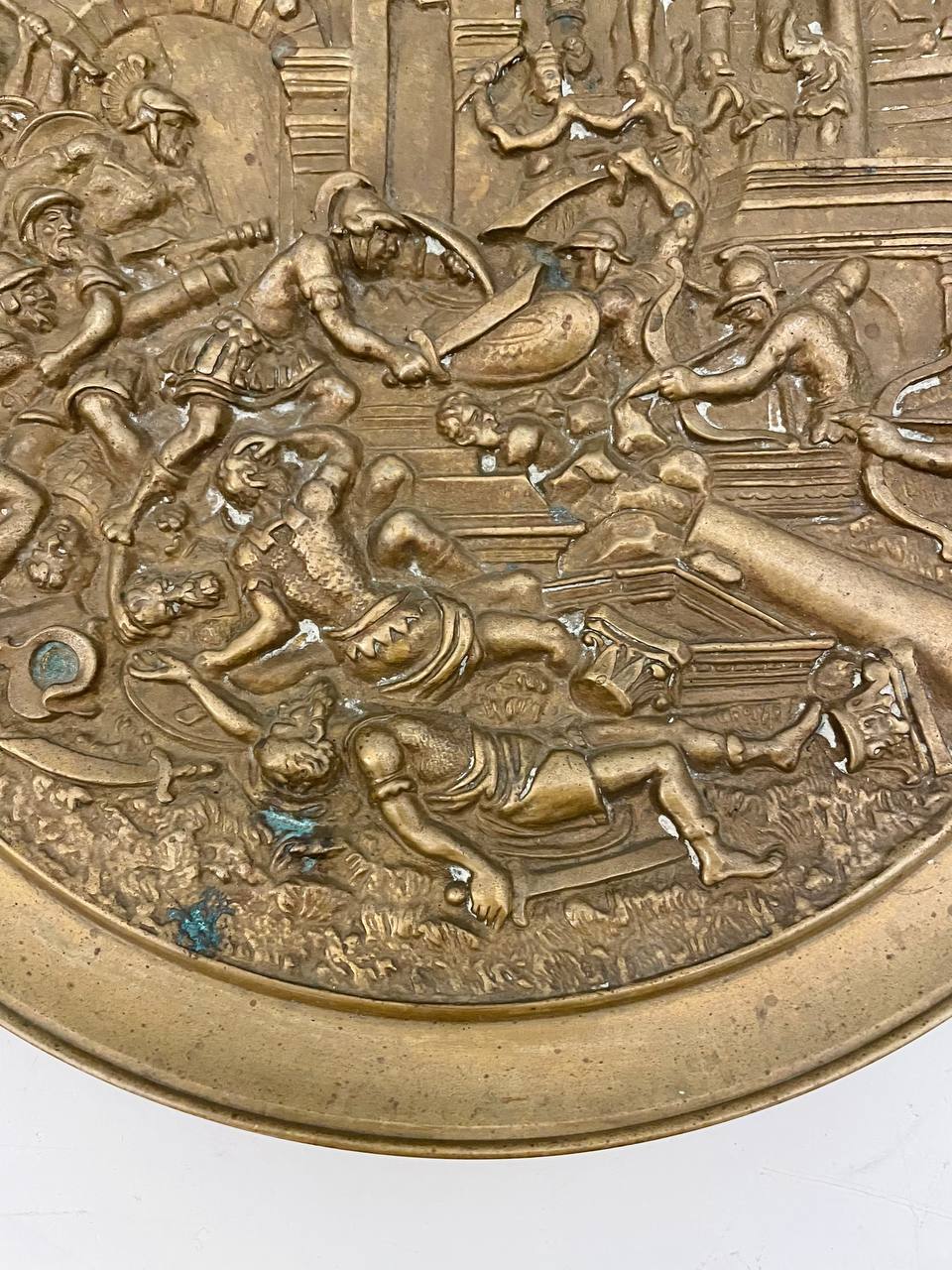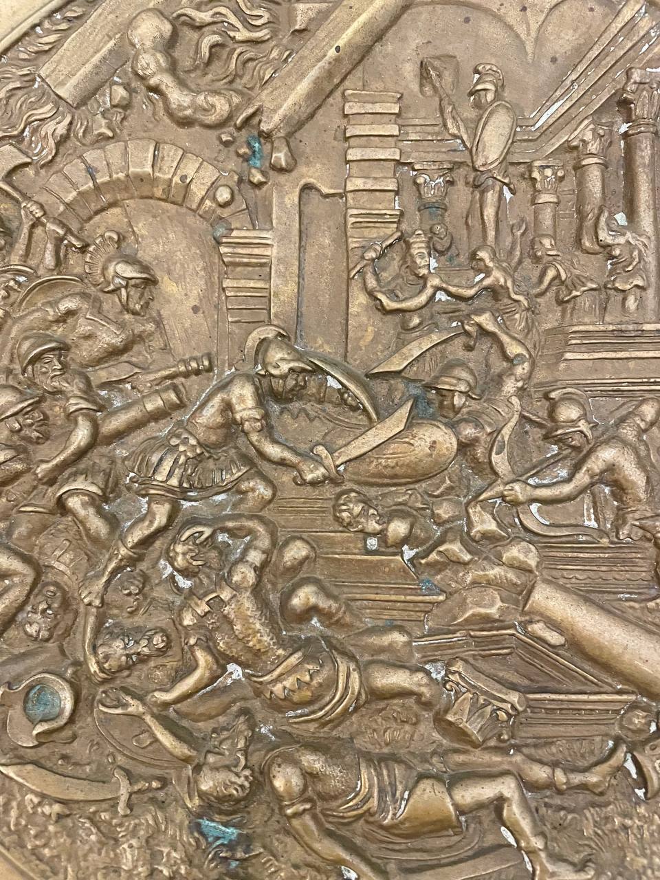 Антикварное блюдо «Битва» Антикварное блюдо батального жанра выполнено из бронзы, начало XX века, Европа. Диаметр 26 см.