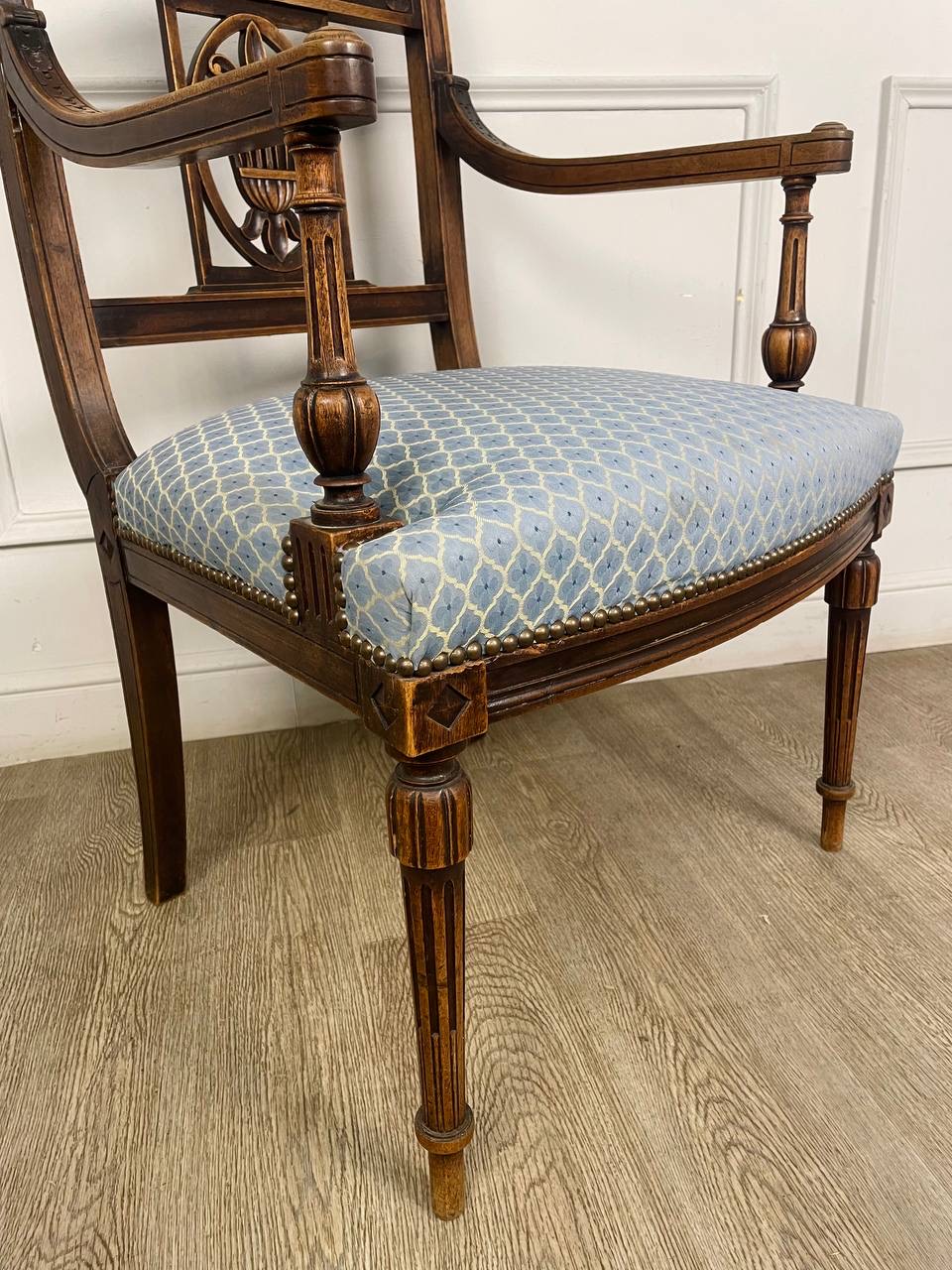 Антикварное полукресло XIX века в стиле Людовика XVI, Франция. Выполнено из массива ореха. Центр спинки украшает Лилия. Великолепная резьба ручной работы. Размер 61х60х97h см. Высота сиденья от пола 48 см.