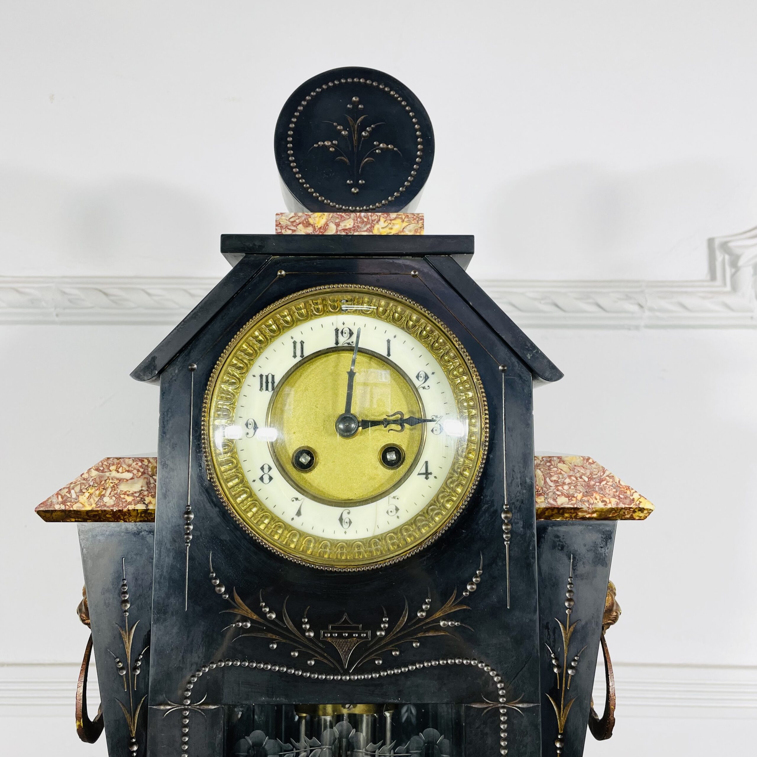 Антикварные часы в стиле Ар Деко De Royal Pasis Bargration, 1907 год. № 10867, мраморный корпус, новый пендельфедер. Завод 10-дневный, бой каждые полчаса. Высота 45 см.