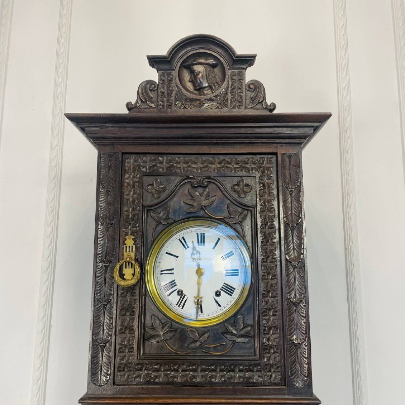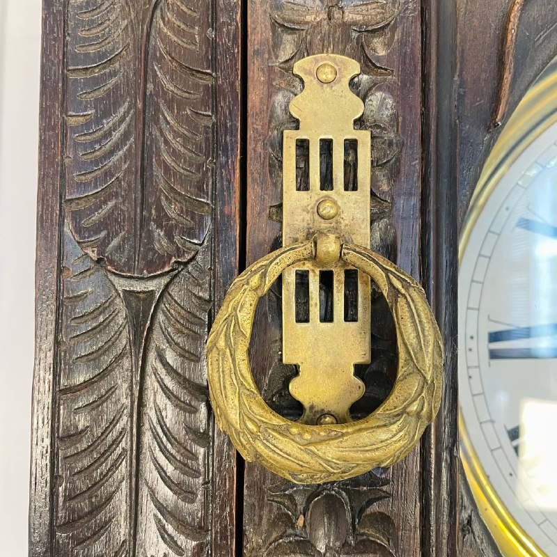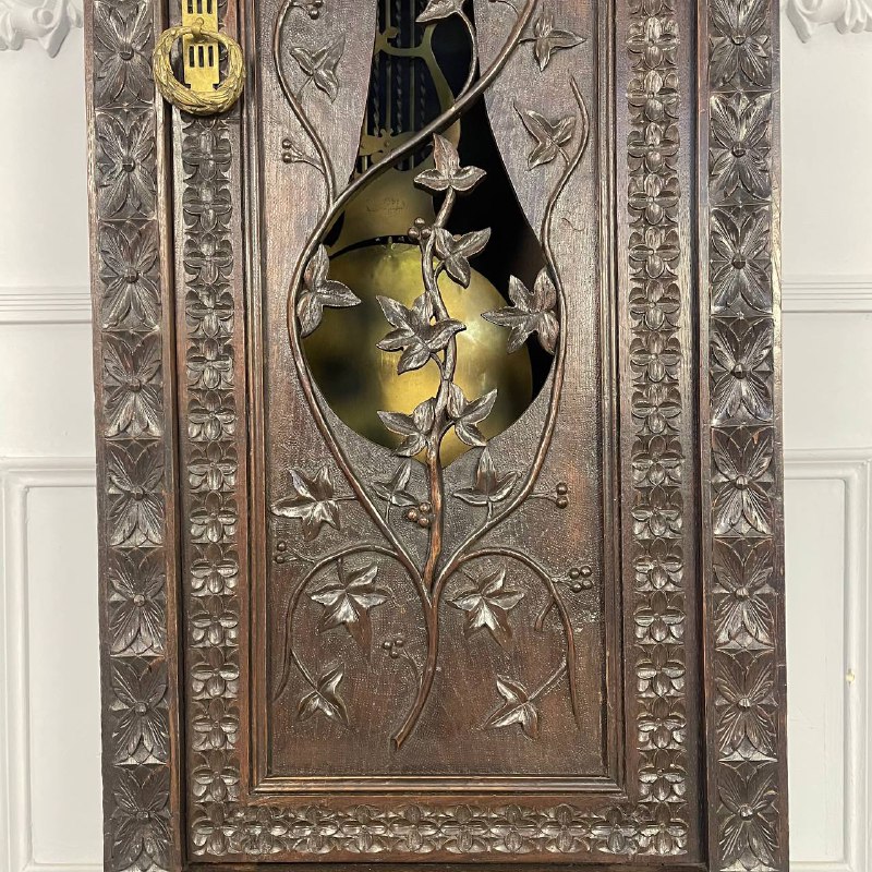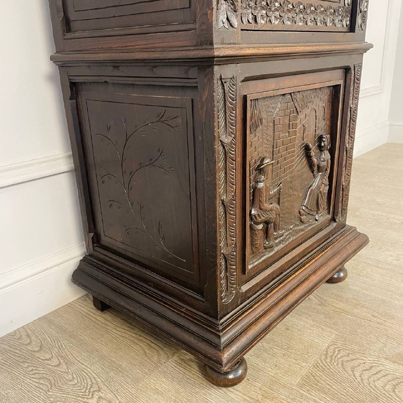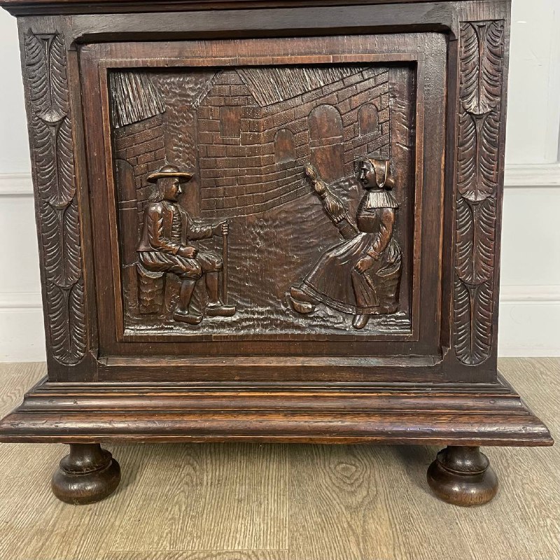 Напольные часы в бретонском стиле, конец ХIХ века, Франция. Массив дуба, резьба с жанровыми сценками, бронзовая фурнитура. Размер: 57х41х245h см.