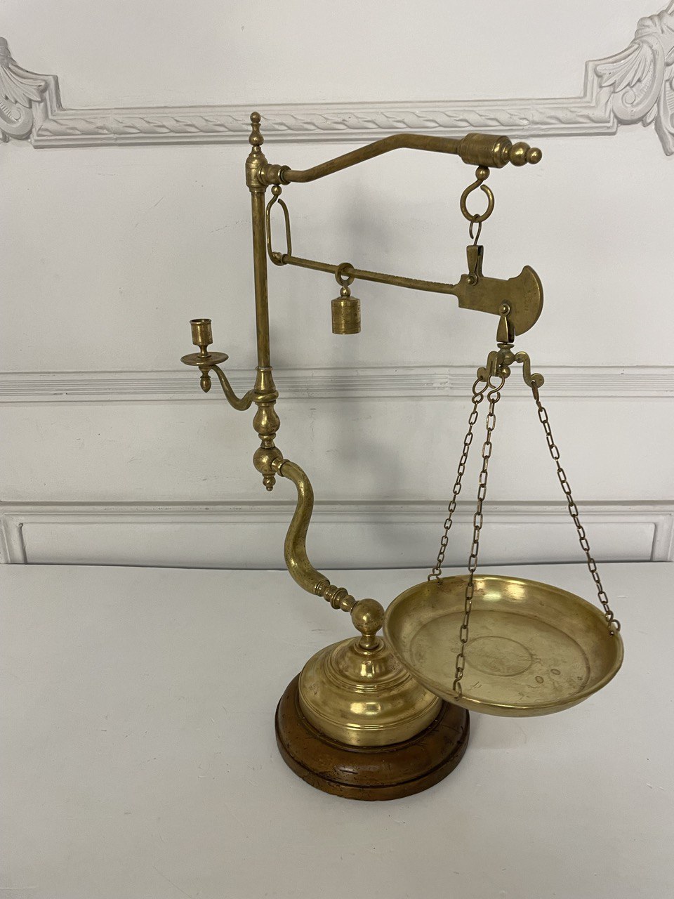 Антикварные весы начала XX века, Франция. Выполнены из латуни и дерева. С одной стороны находится элегантный подсвечник. Размер 57х21х60h см.