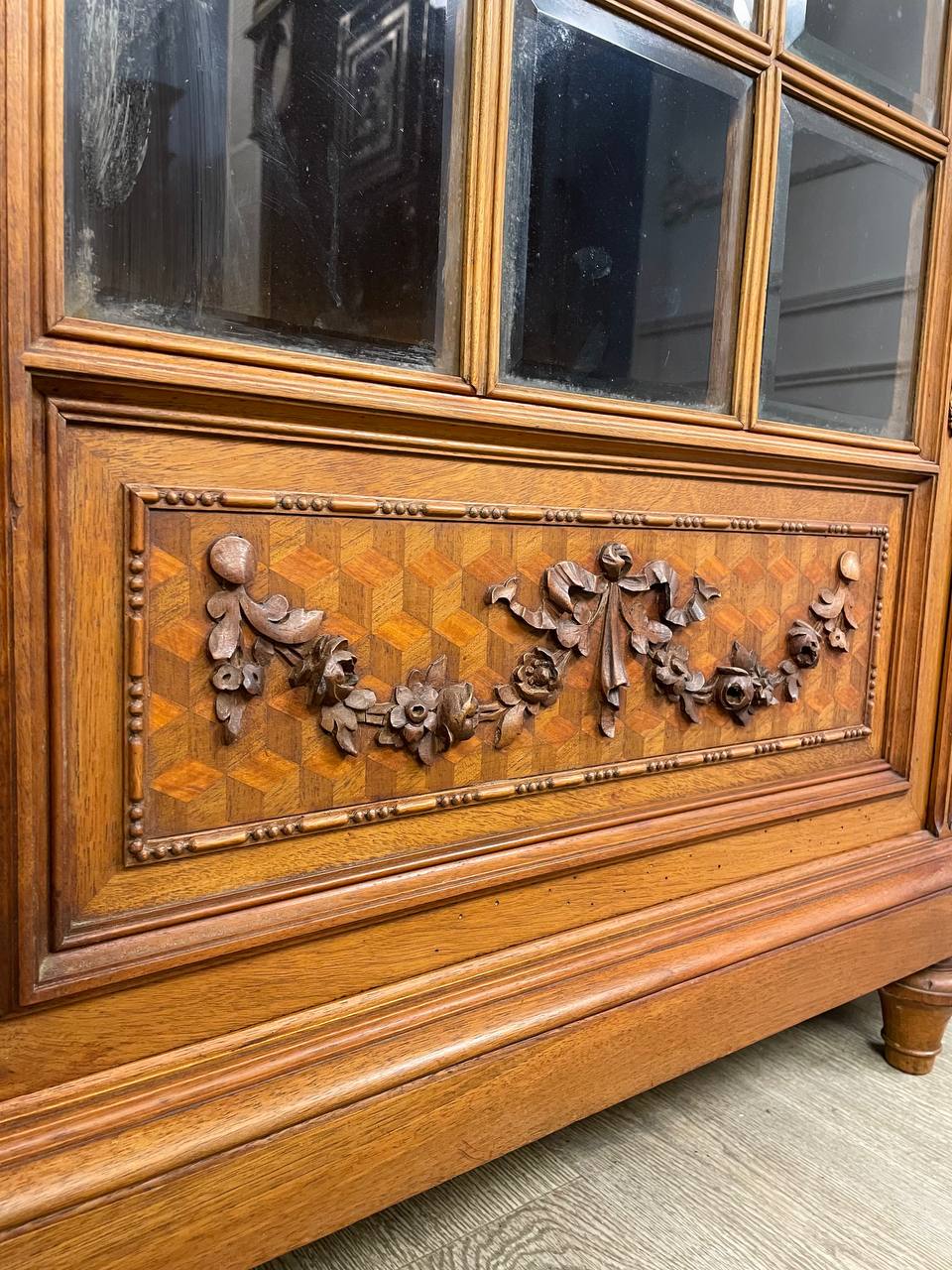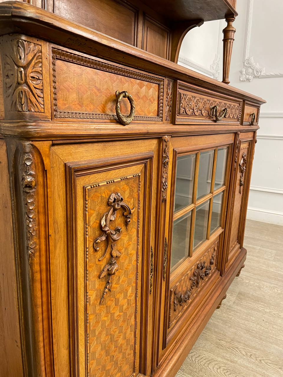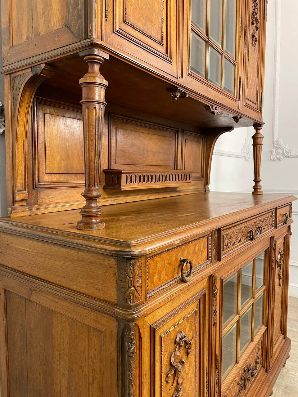 Антикварный буфет рубежа XIX-XX веков, Франция. Выполнен из массива ореха. Паркетри, резьба ручной работы. Оригинальные стекла с фацетом. Размер 150х55х240h см.