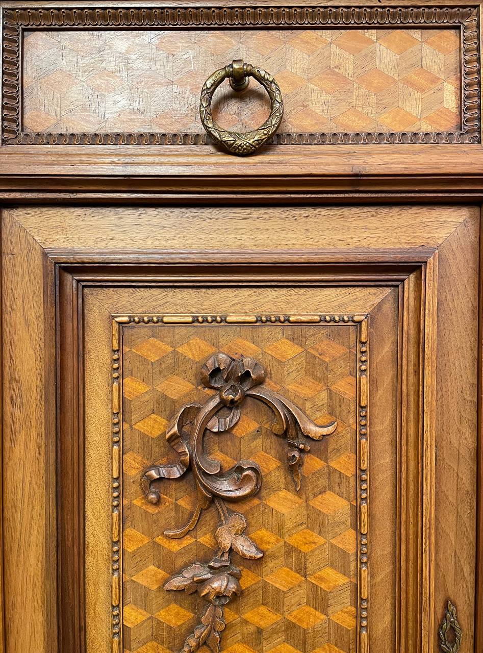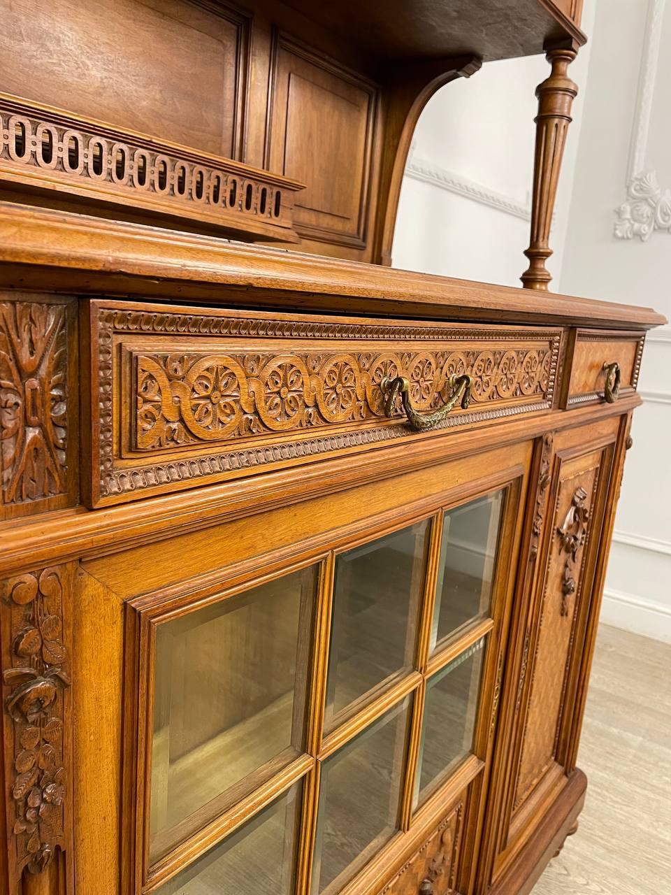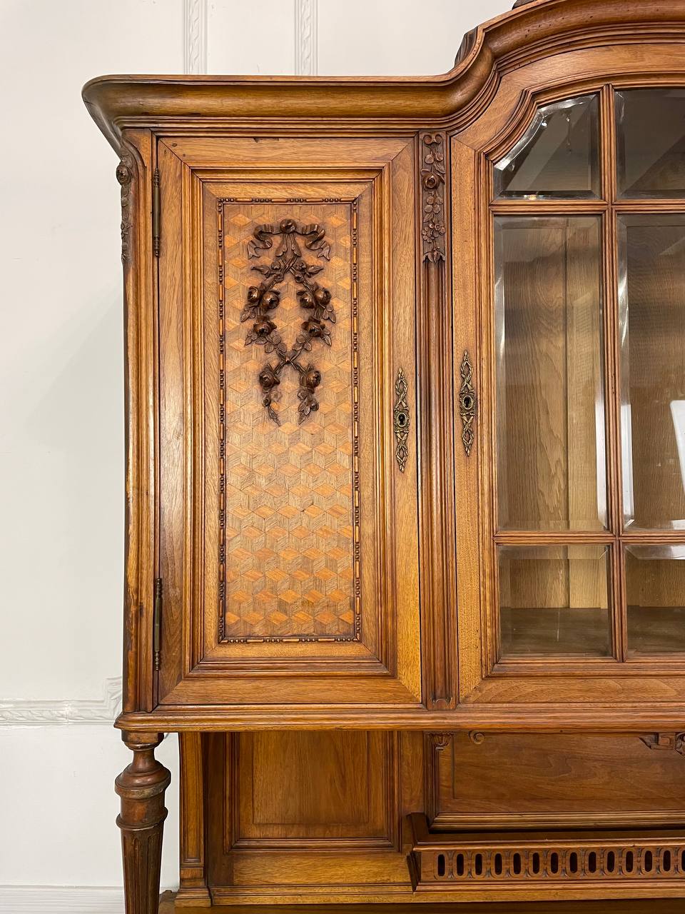 Антикварный буфет рубежа XIX-XX веков, Франция. Выполнен из массива ореха. Паркетри, резьба ручной работы. Оригинальные стекла с фацетом. Размер 150х55х240h см.