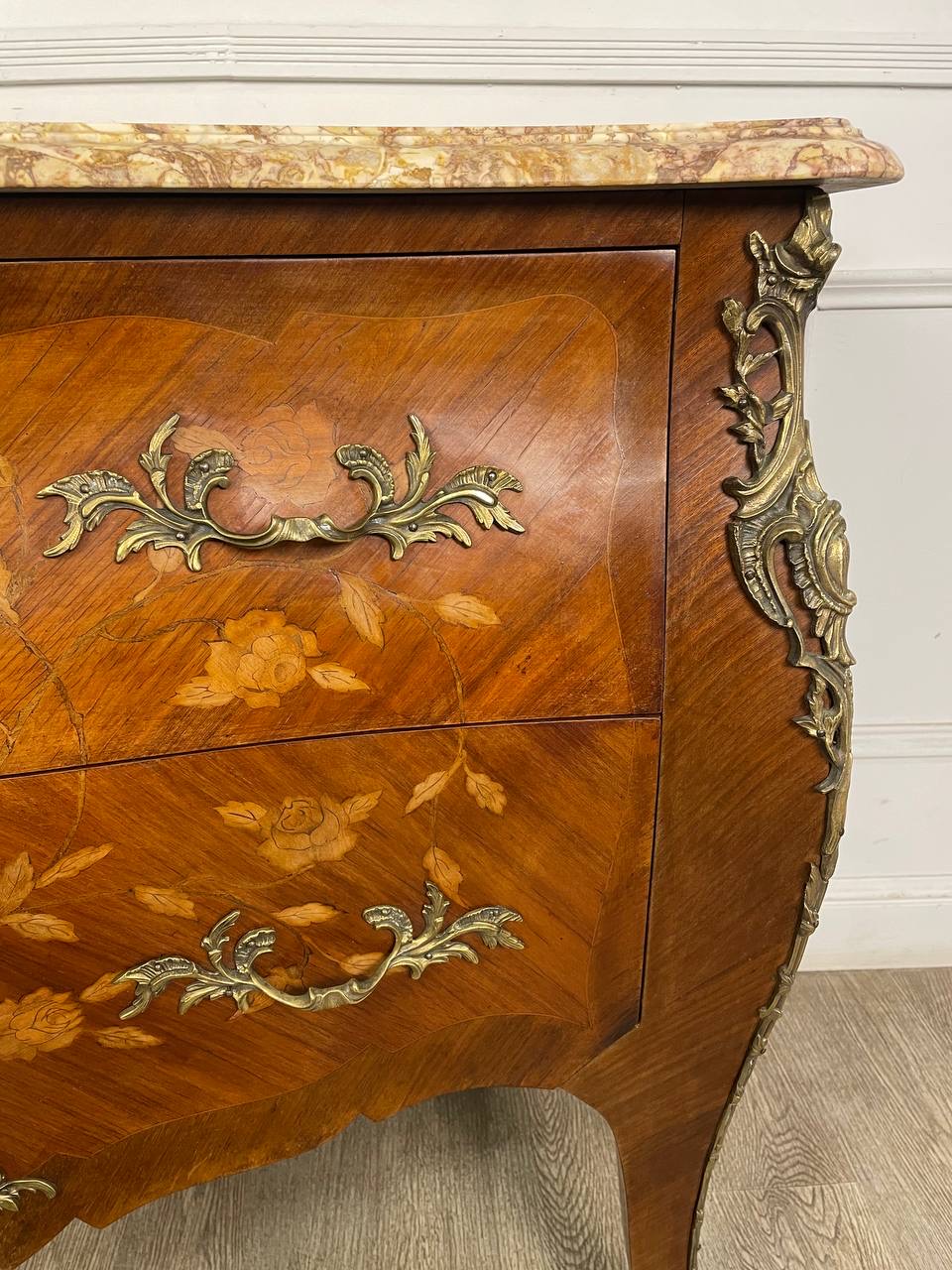 Антикварный комод первой половины XX века, Франция. Выполнен из розового дерева, маркетри. Оригинальная бронзовая фурнитура. Оригинальная мраморная столешница. Два объемных выдвижных ящика. Размер 125х52х85h см.