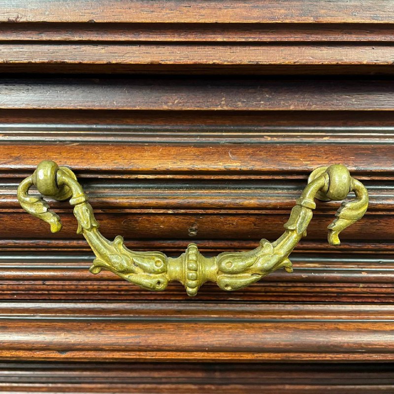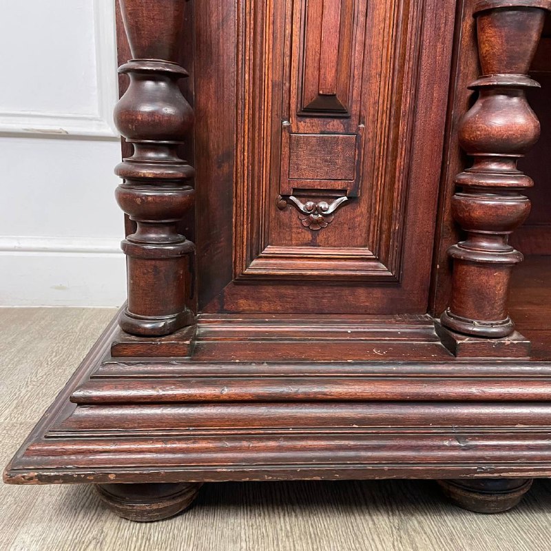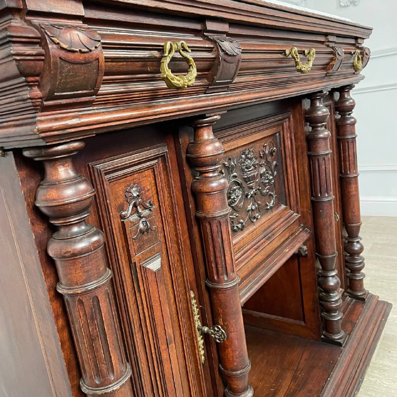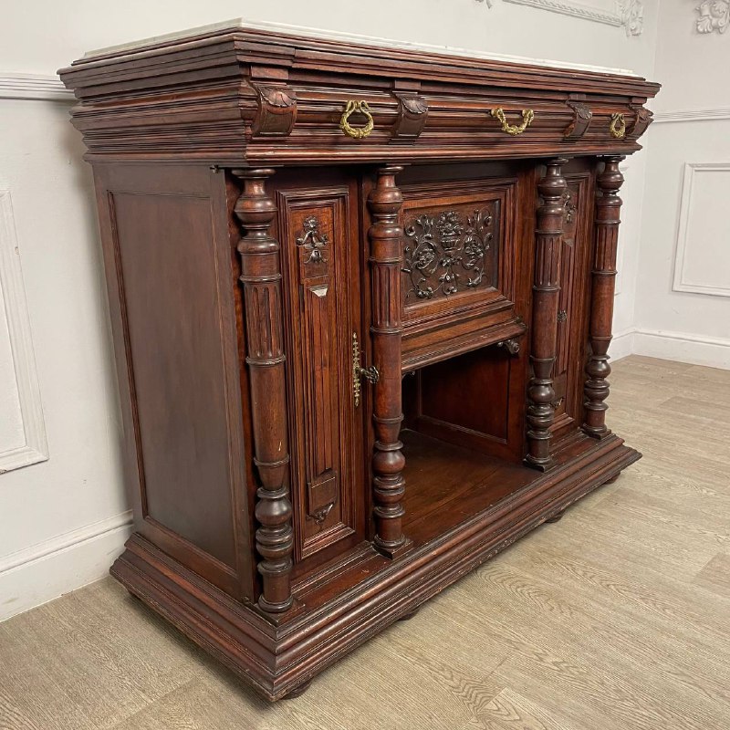 Антикварный поставец, рубежа ХIХ-ХХ века, Бельгия. Массив ореха, тонировка. Мраморная столешница, бронзовая фурнитура. Размер: 125х51х101h см.
