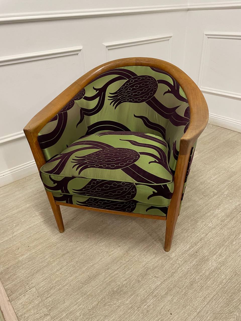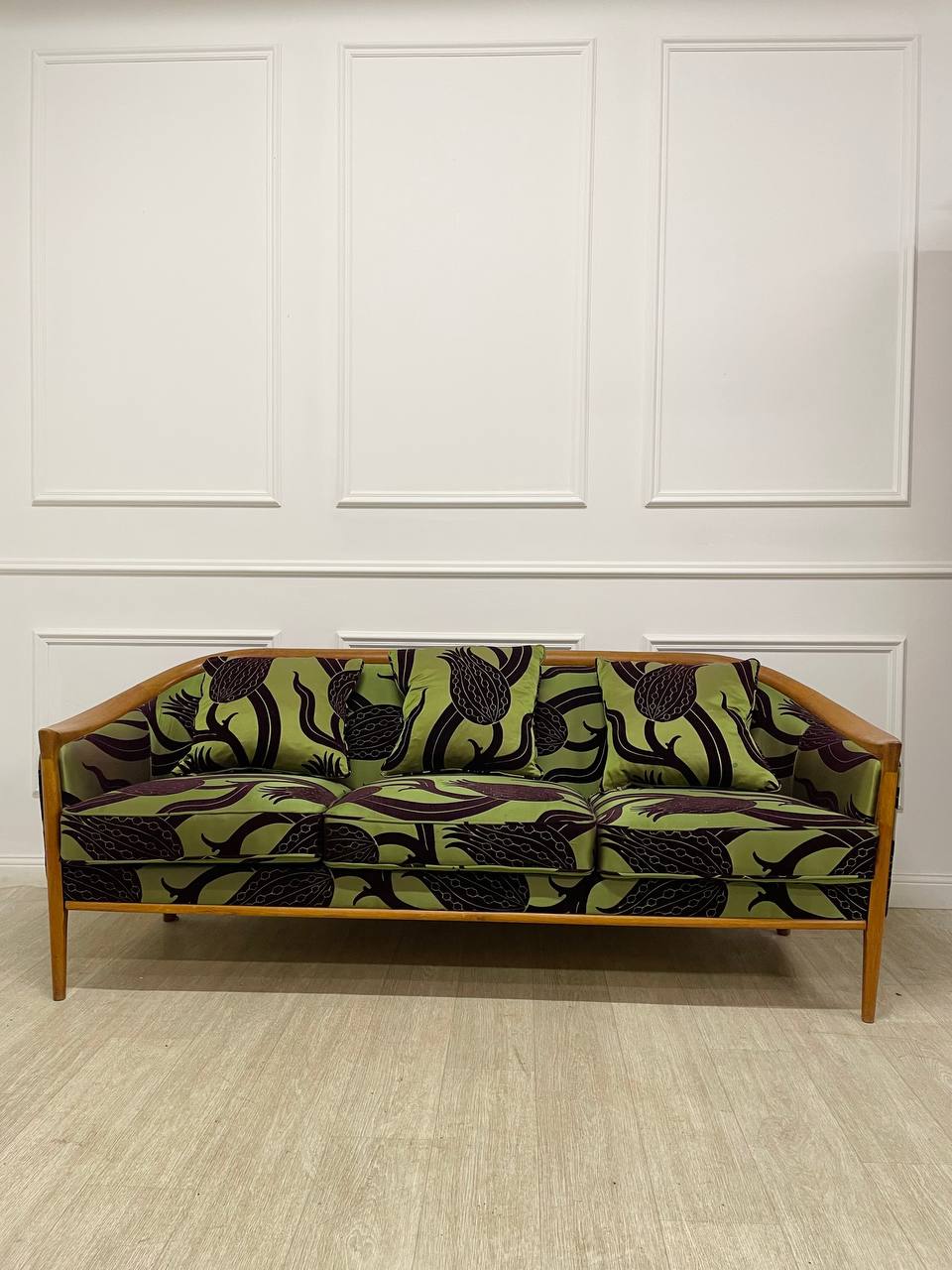 Антикварный комплект диван и кресло в стиле Ар-Деко 1950х годов, Скандинавия. Дизайн Broderna Andersson. Выполнены из массива тика. Переобиты позднее современной тканью Zoffani. Размер дивана 197х77х72h см. Размер кресла 80х77х73h см.